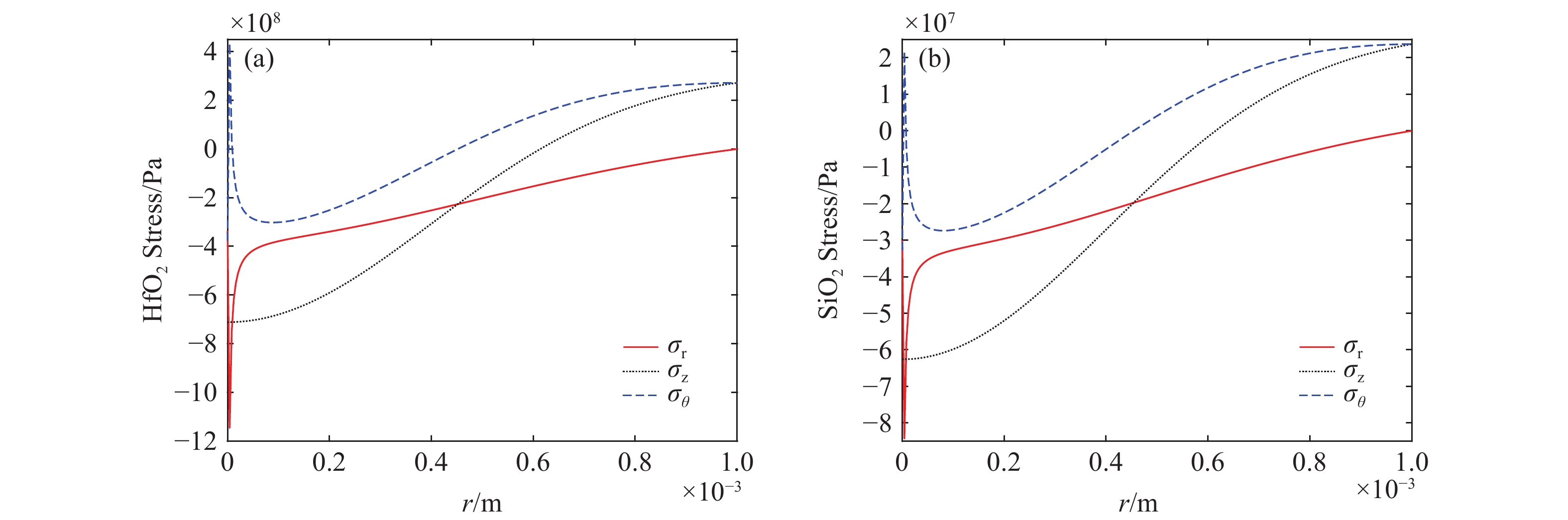 Figure 7.  Maximum thermal stress distribution within the film irradiated by laser pulses (a) HfO2 (b) SiO2