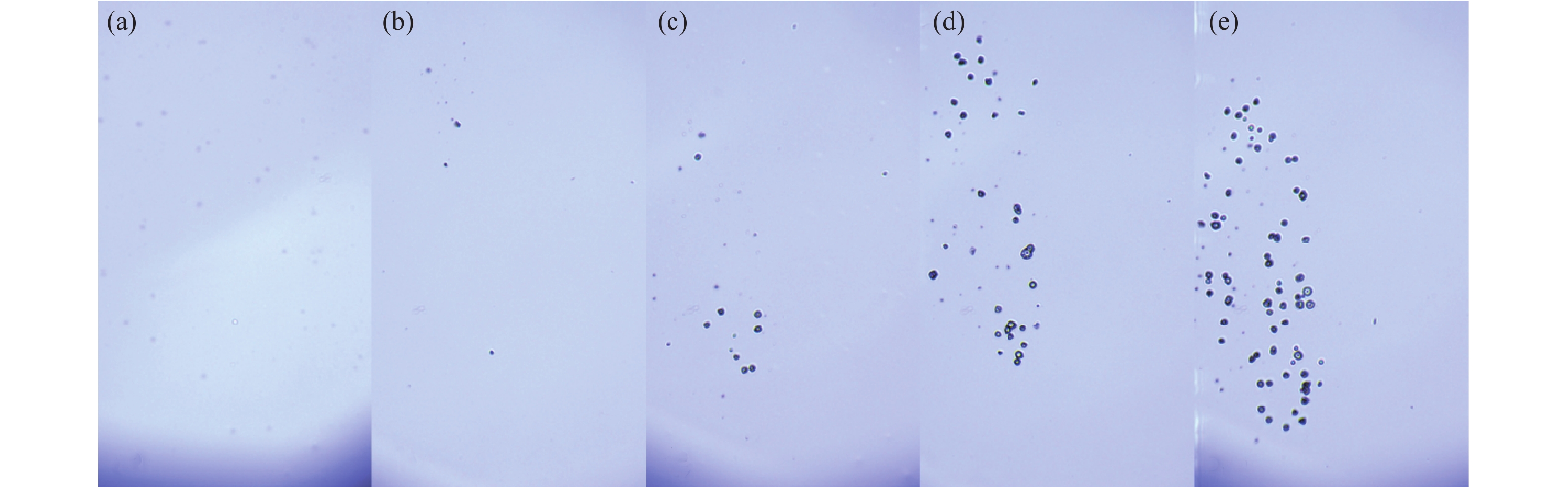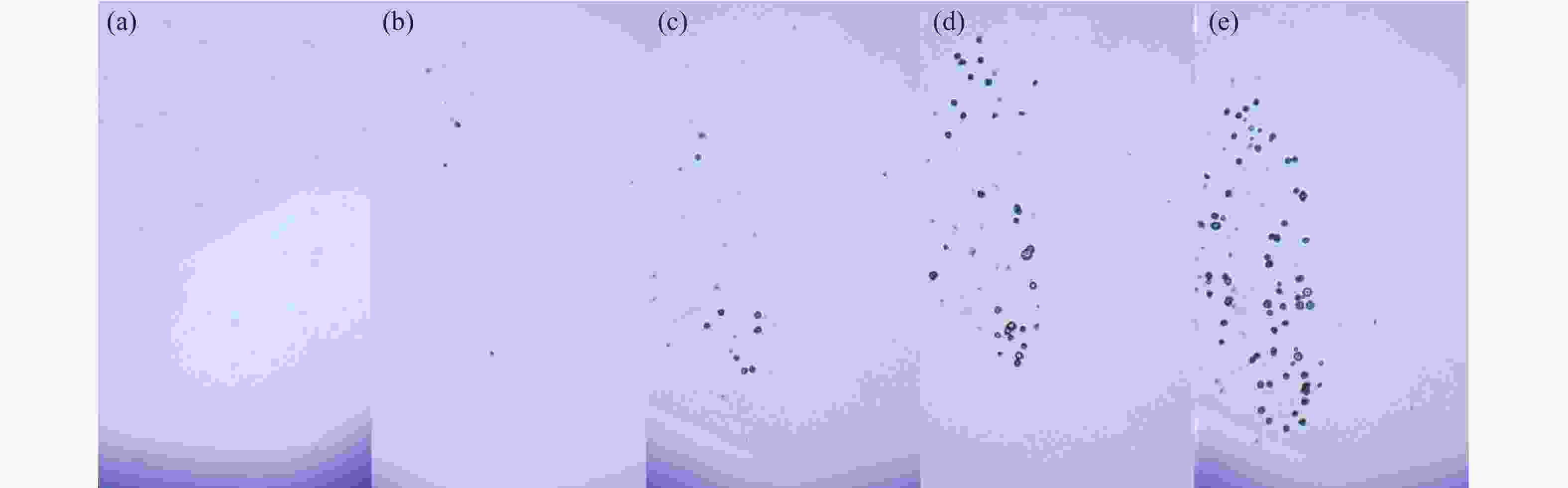 Figure 9.  Damage morphology within the film after irradiation with different laser energies (a) Laser energy density 12.5 J/cm2; (b) Laser energy density 14.5 J/cm2; (c) Laser energy density 20.0 J/cm2; (d) Laser energy density 5.0 J/cm2; (e) Laser energy density 30.0 J/cm2