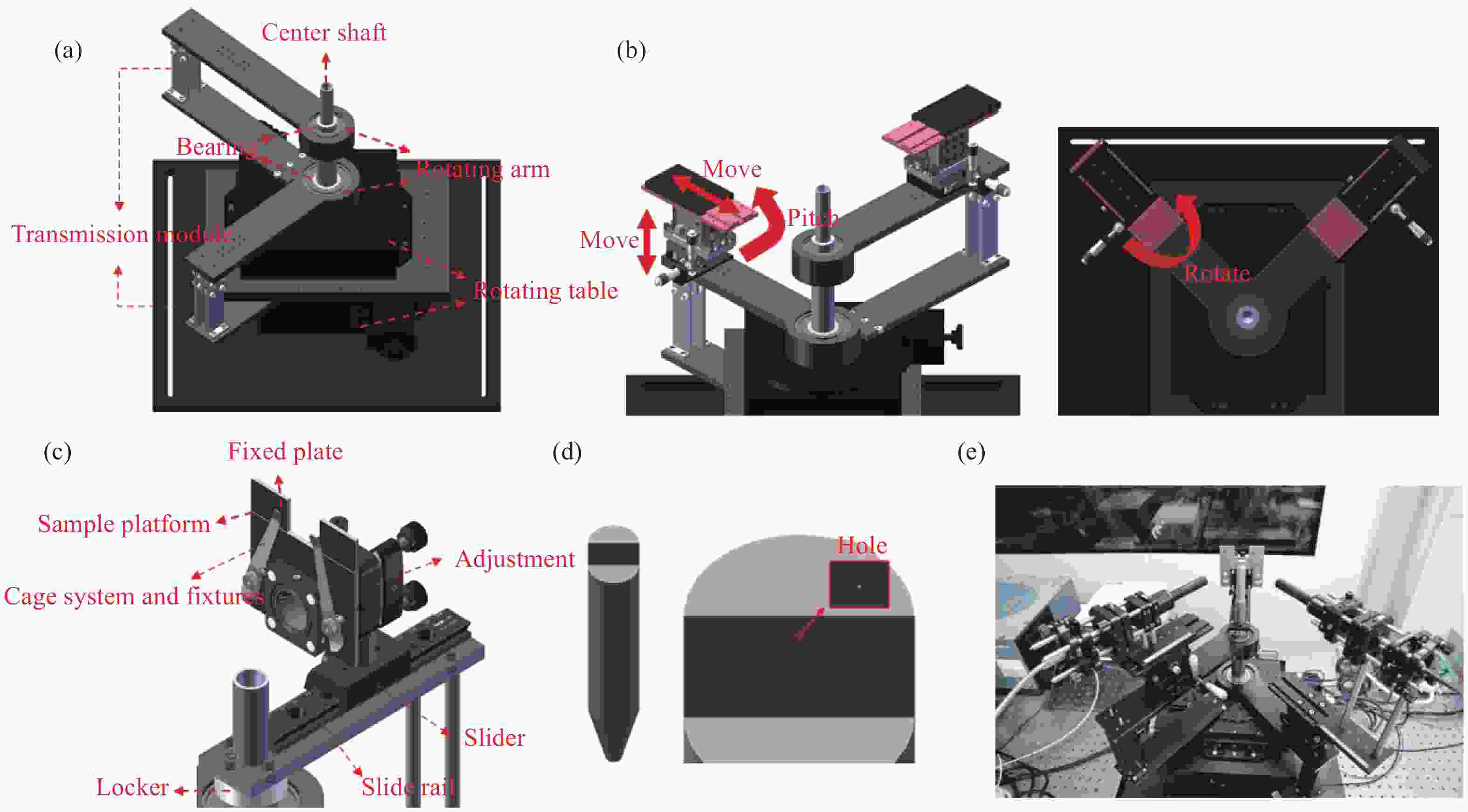 Abstract:To study the optical response of micro-area in surface plasmon nanostructures, we develop a micro-area angle-resolved spectroscopy measurement system based on a coaxial rotating arm. The system adopts a micro-area remote excitation and collection optical path model based on a finite conjugate configuration, enabling an incident micro-area spot with a diameter of 32 μm. In addition, an angle-resolved mechanical system based on a coaxial rotating arm is constructed, realizing large-range directional angular excitation from 6.9° to 90°. Performance tests show that the system exhibits high stability, with a minimum angular resolution of 0.12°. Through the reflection spectrum collection experiments on one-dimensional gratings and two-dimensional periodic nanostructures, the reliability of the system is further verified. The results demonstrate the advantages of the micro-area spot, which provide an effective technical means for the angle-resolved spectroscopy characterization of micro and nanostructures.