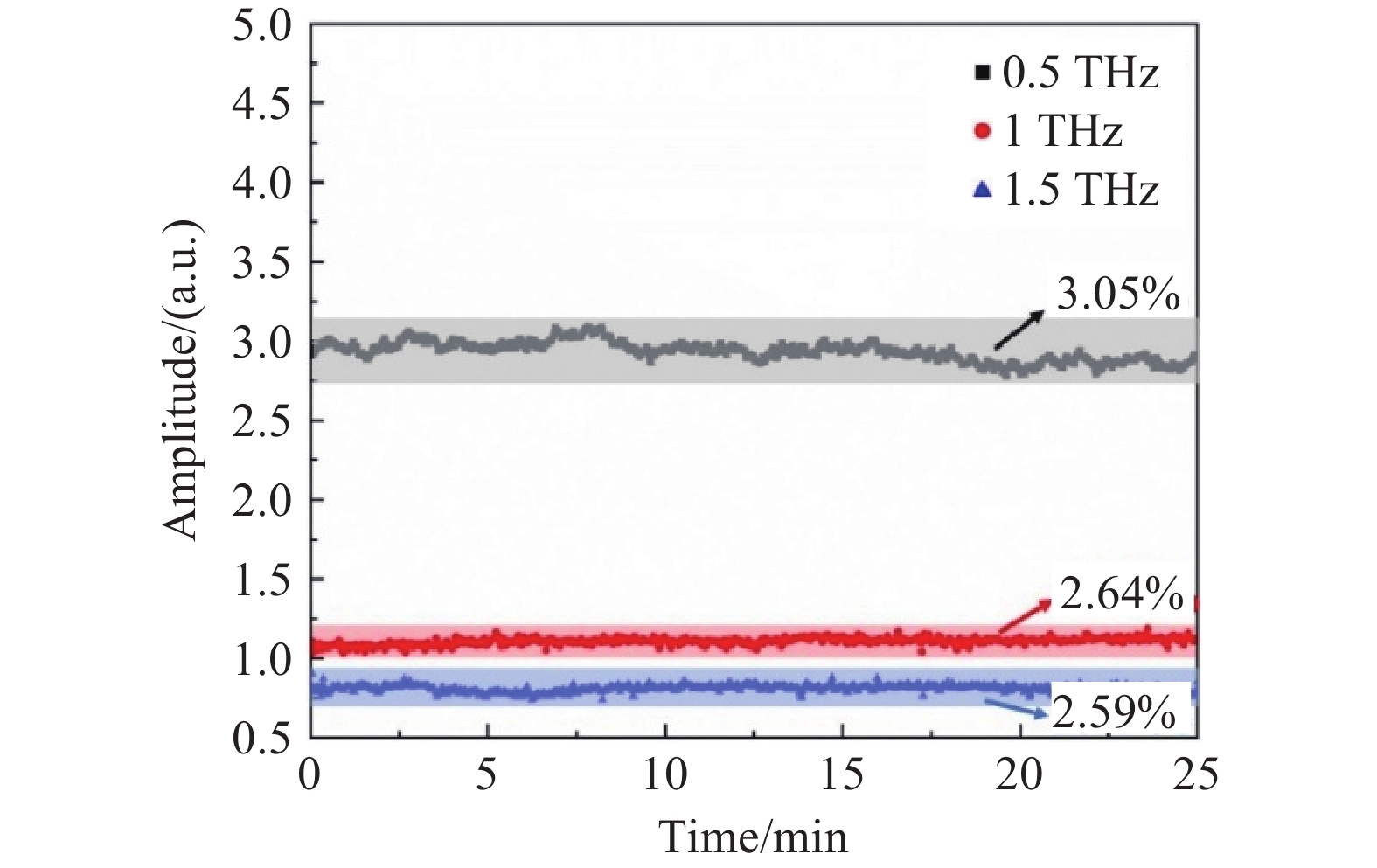 Figure 4.  Terahertz wave stability at output frequencies of 0.5 THz, 1 THz, and 1.5 THz