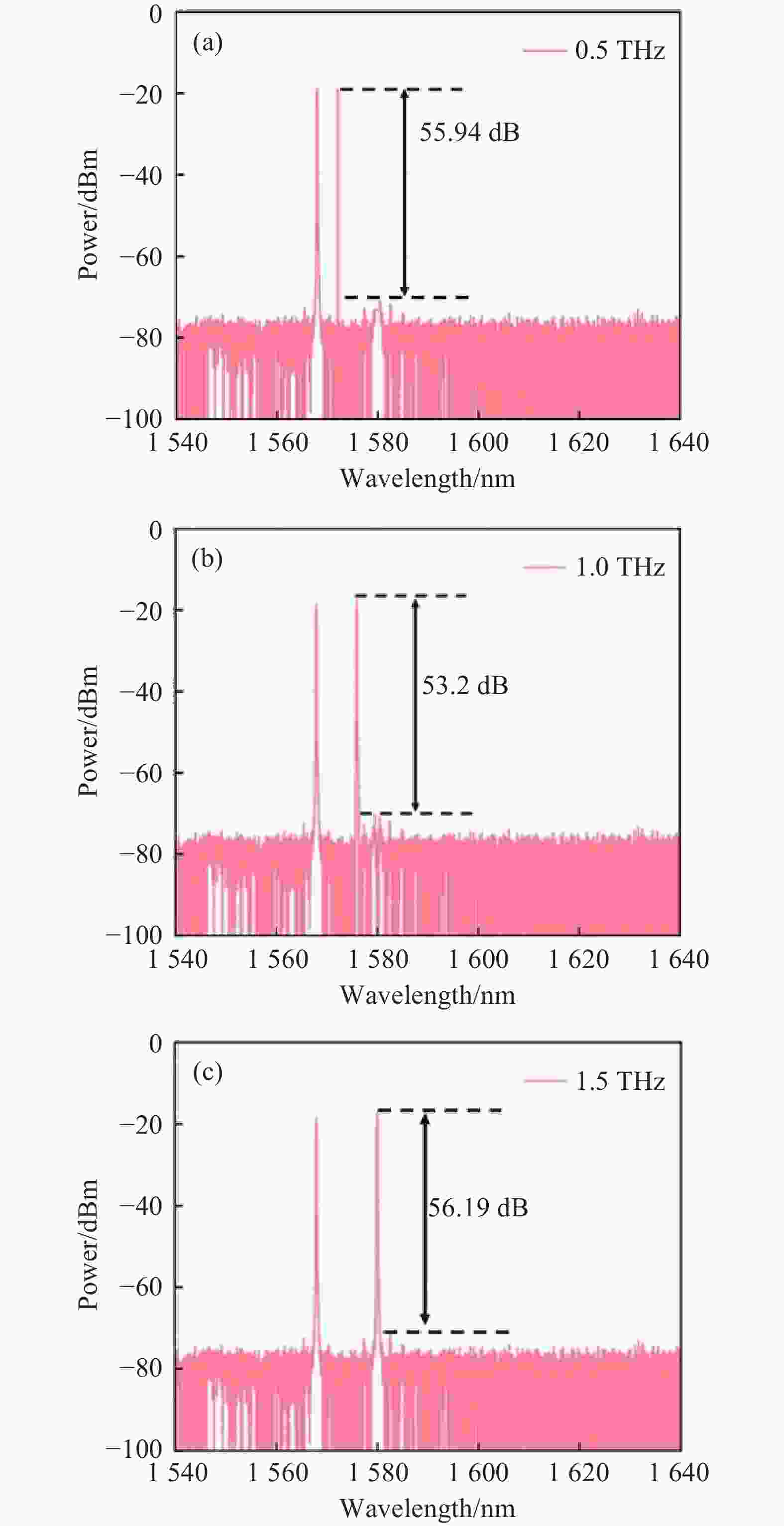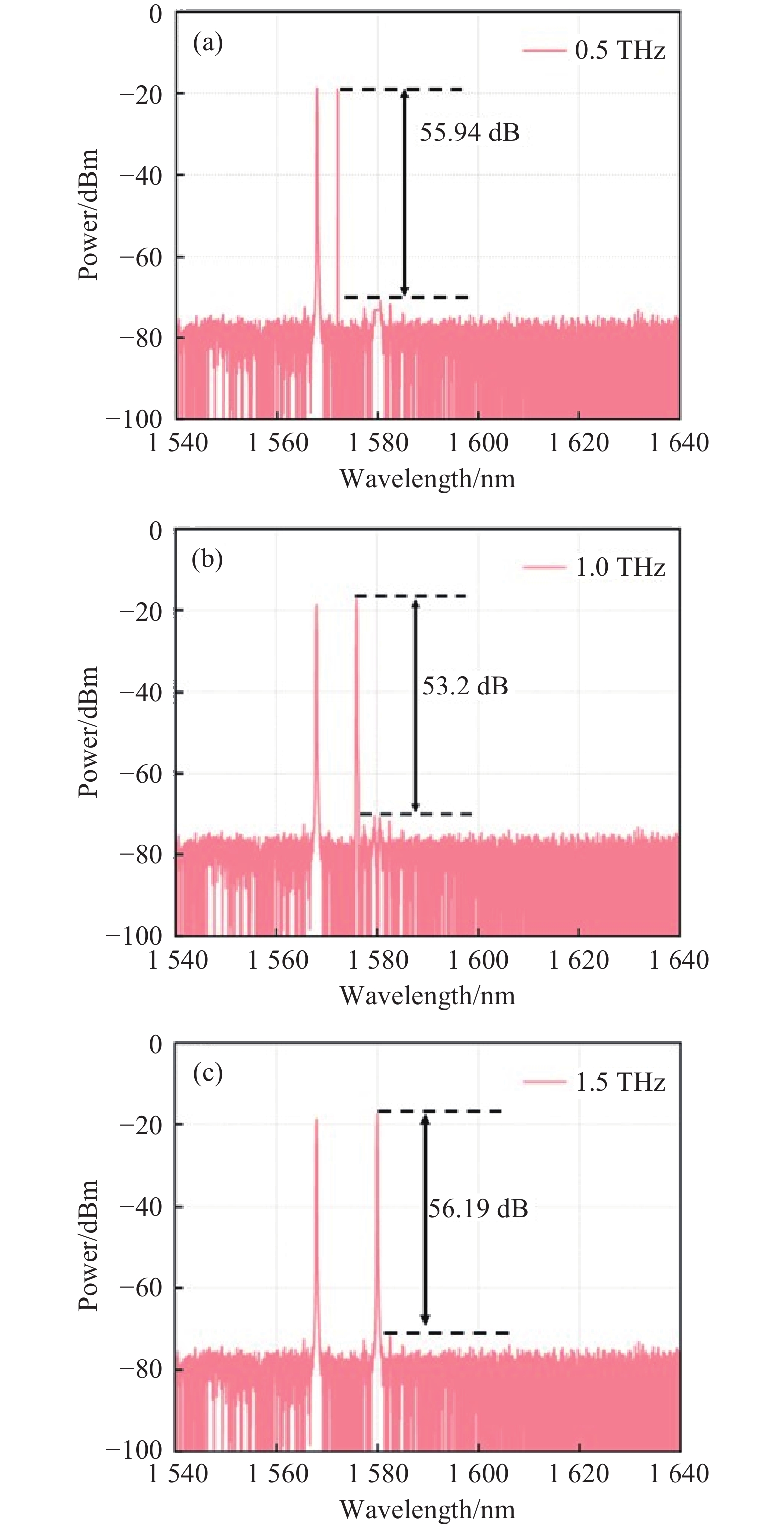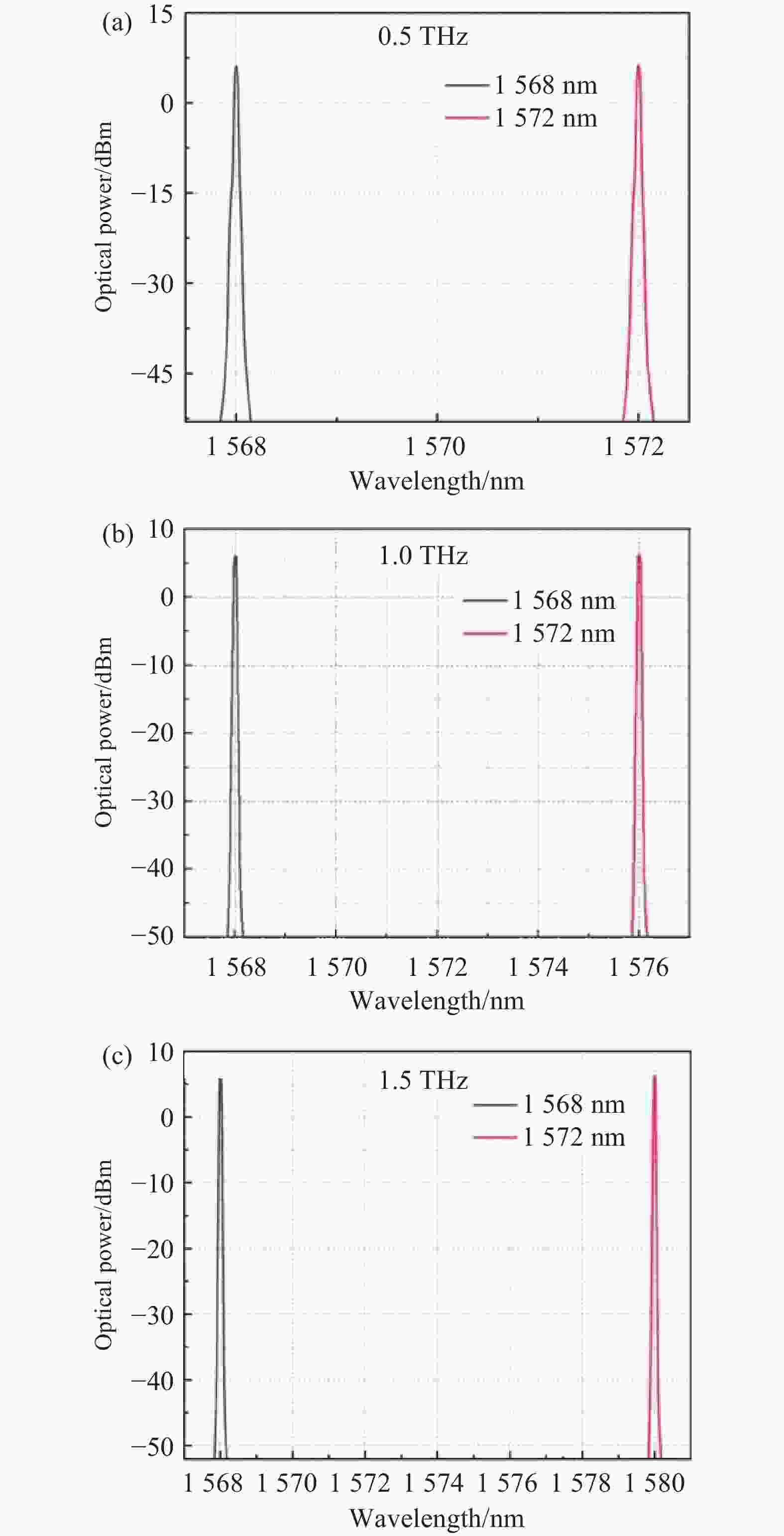 Figure 5.  Test results graph of dual-wavelength difference frequency signals at 0.5 THz, 1 THz, and 1.5 THz (a)-(c)