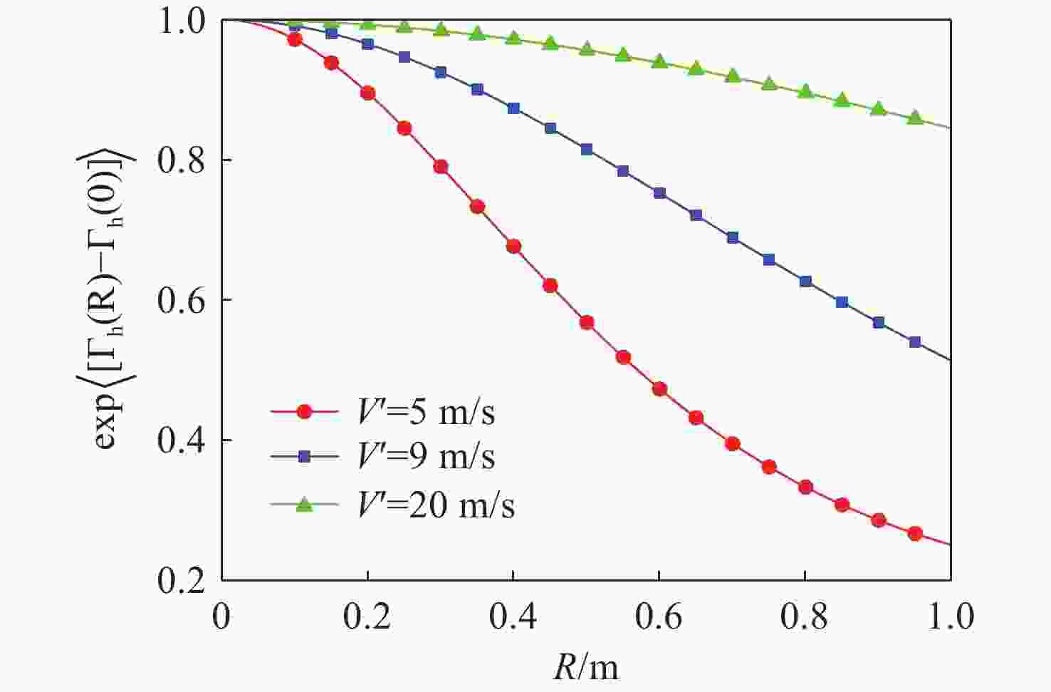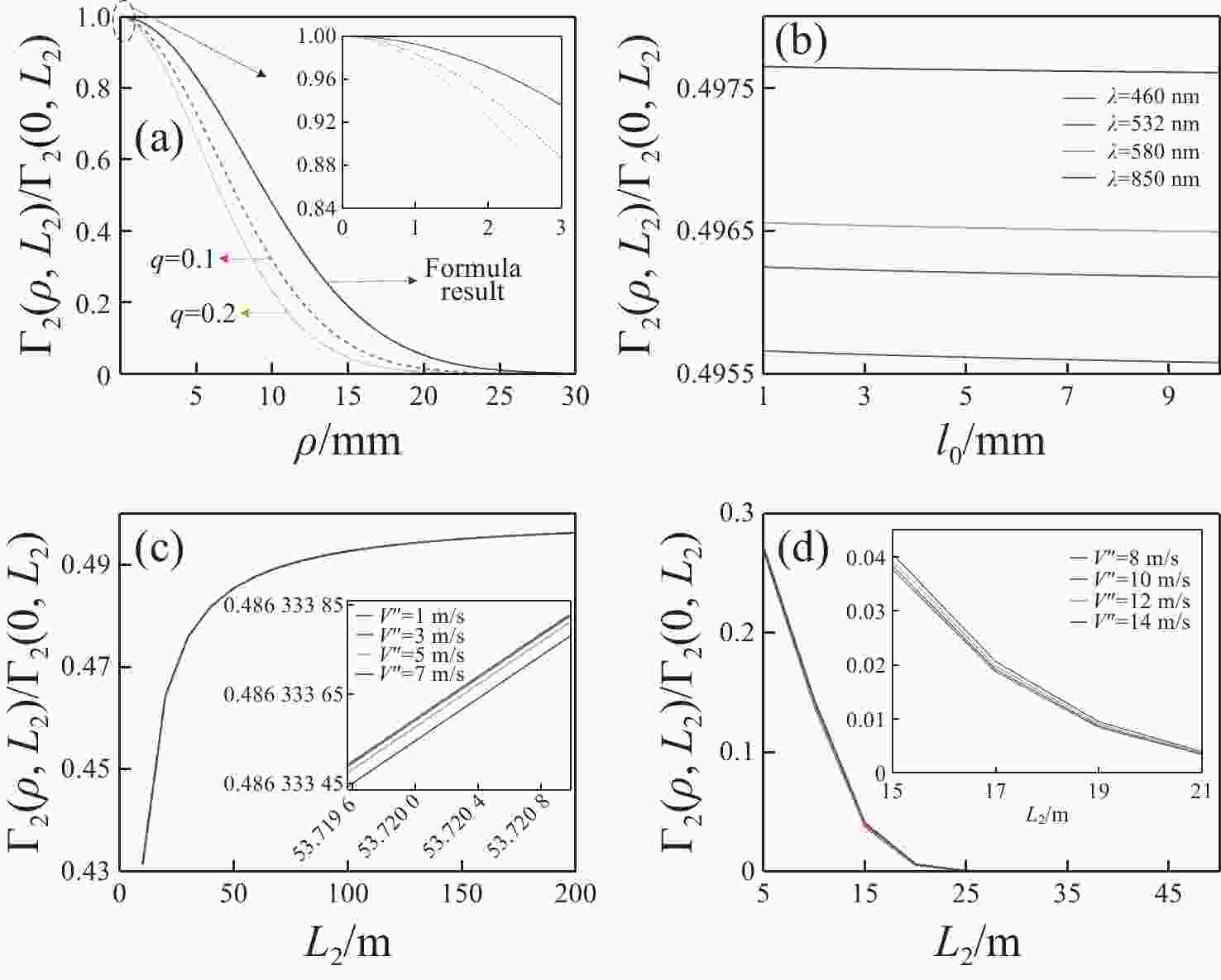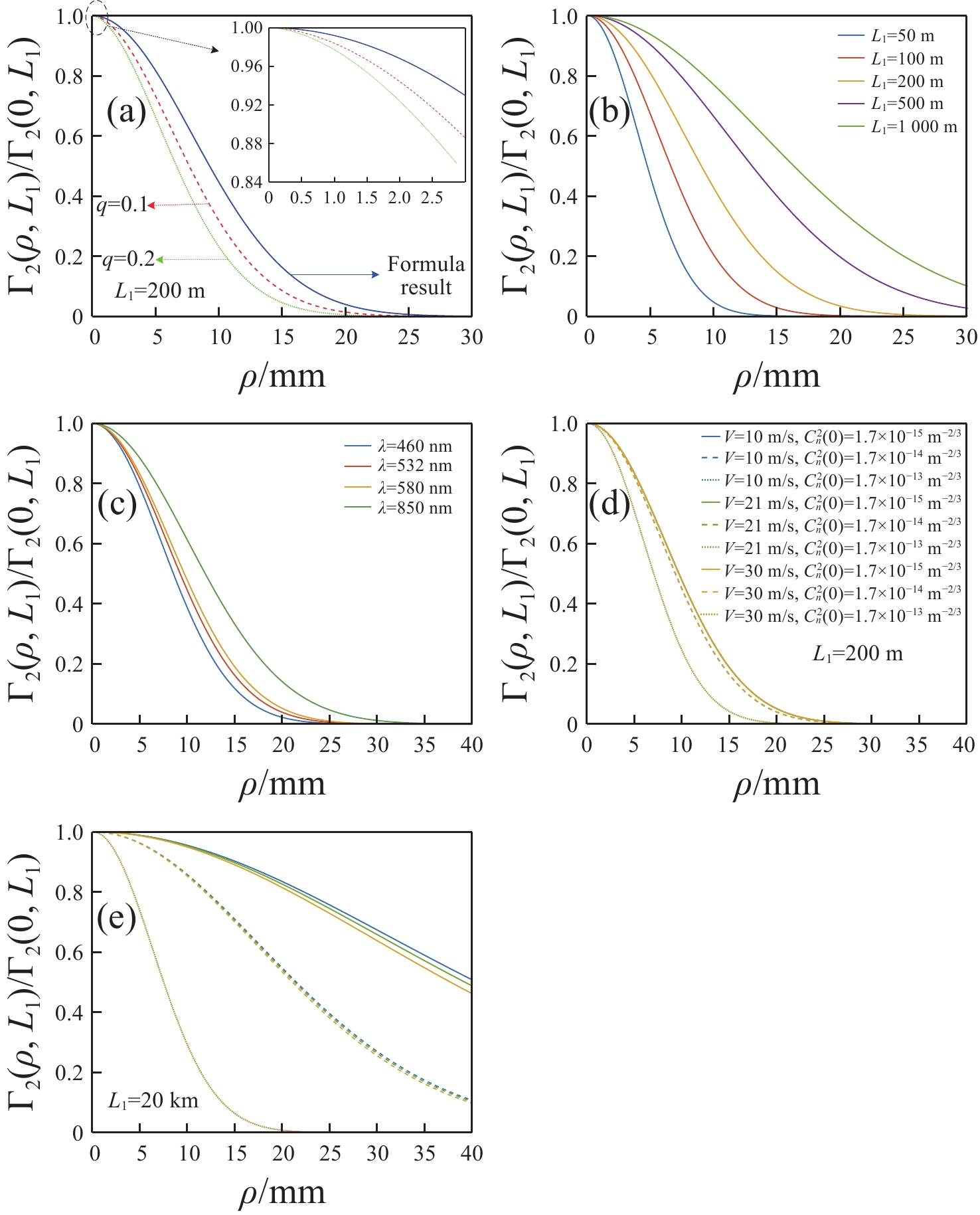 $ C_{n}^{2}\left(0\right) $ ,L1=200 m,L1=20 km;(d)和(e)共用图例Figure 3. Variation of normalized mutual coherence function of Gaussian beam propagating downward through atmospheric turbulence under various parameters. (a) ρ; (b) L1; (c) λ;(d) and (e) V and