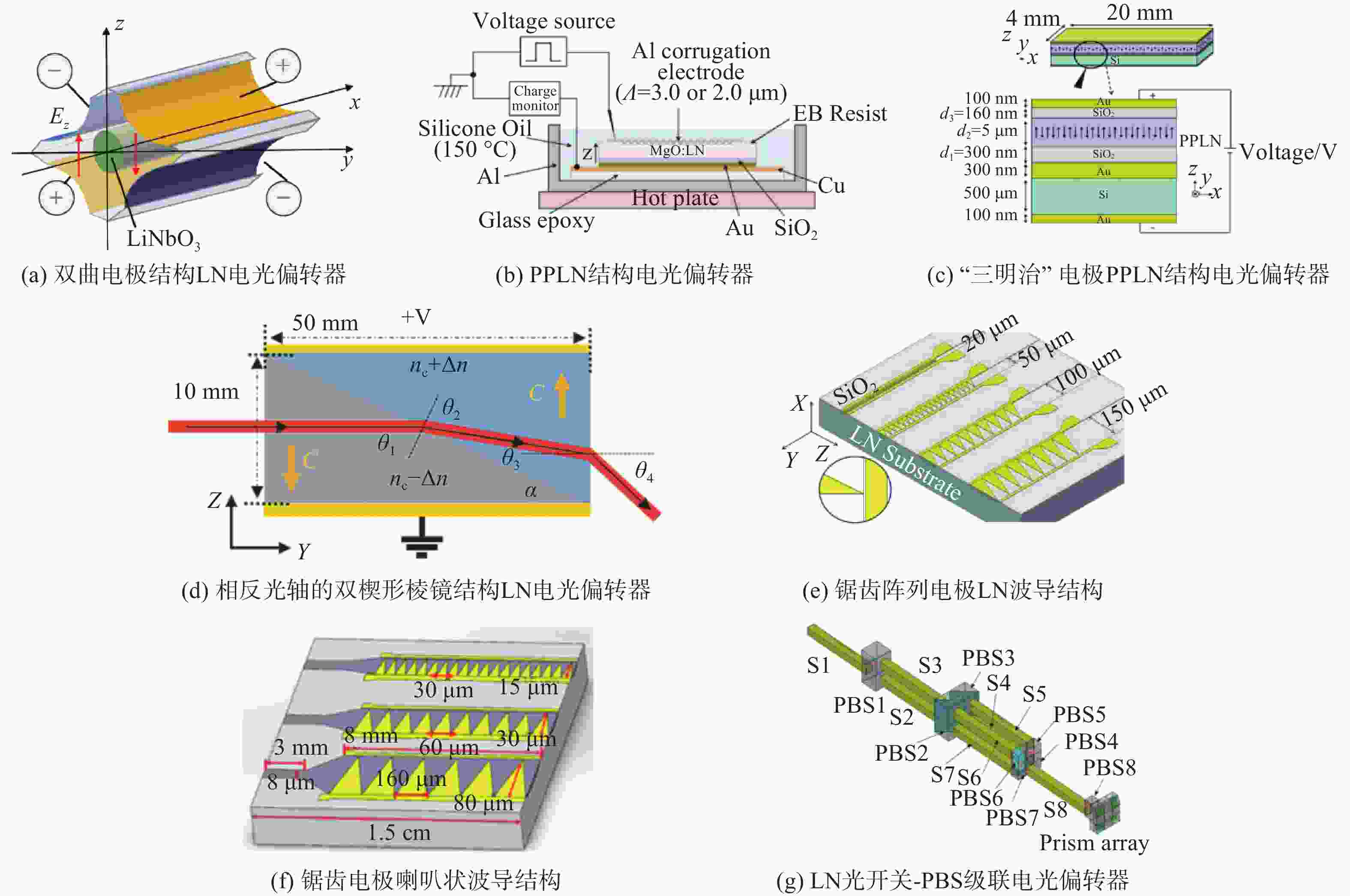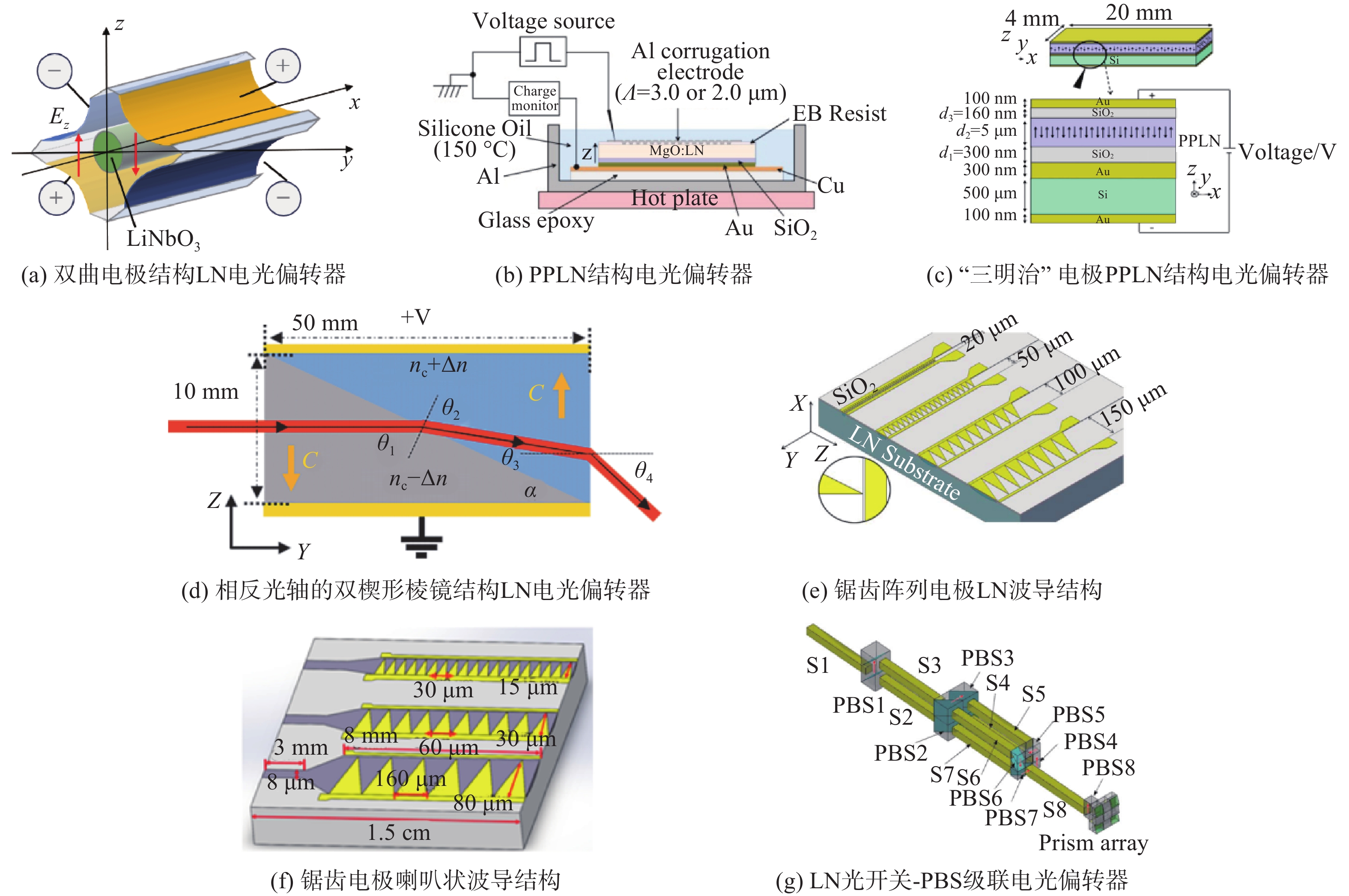 Figure 2. LN crystal beam deflection technology based on electro-optic effect. (a) Hyperbolic electrode structure LiNbO3 electro-optic deflector. (b) PPLN structure electro-optic deflector[40]. (c) ‘Sandwich’ electrode PPLN structure electro-optic deflector[41]. (d) Opposite optical axes double wedge prism structure LN electro-optic deflector[43]. (e) Sawtooth array electrode LN waveguide structure[44]. (f) Sawtooth electrode trumpet waveguide structure[45]. (g) LN optical switch - PBS cascaded electro-optic deflector[46].