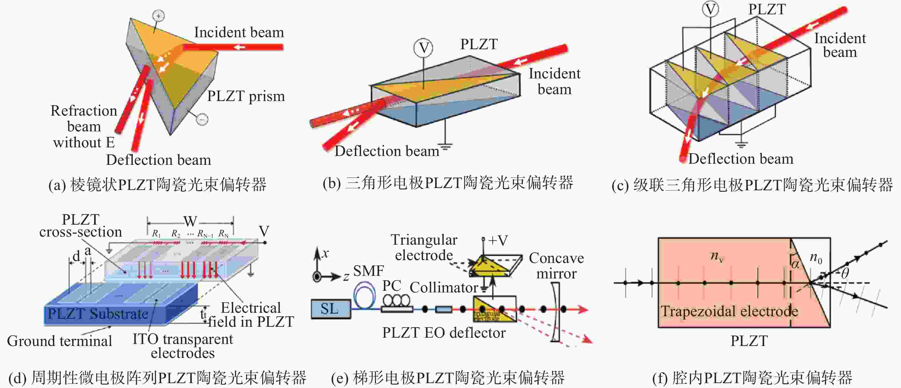 Figure 3. PLZT-based ceramic beam deflector. (a) Prism-shaped PLZT ceramic beam deflector. (b) Triangular electrode PLZT ceramic beam deflector. (c) Cascaded triangular electrode PLZT ceramic beam deflector. (d) Periodic microelectrode array PLZT ceramic beam deflector[52]. (e) Trapezoidal electrode PLZT ceramic beam deflector[53]. (f) Intracavity PLZT ceramic beam deflector[54].