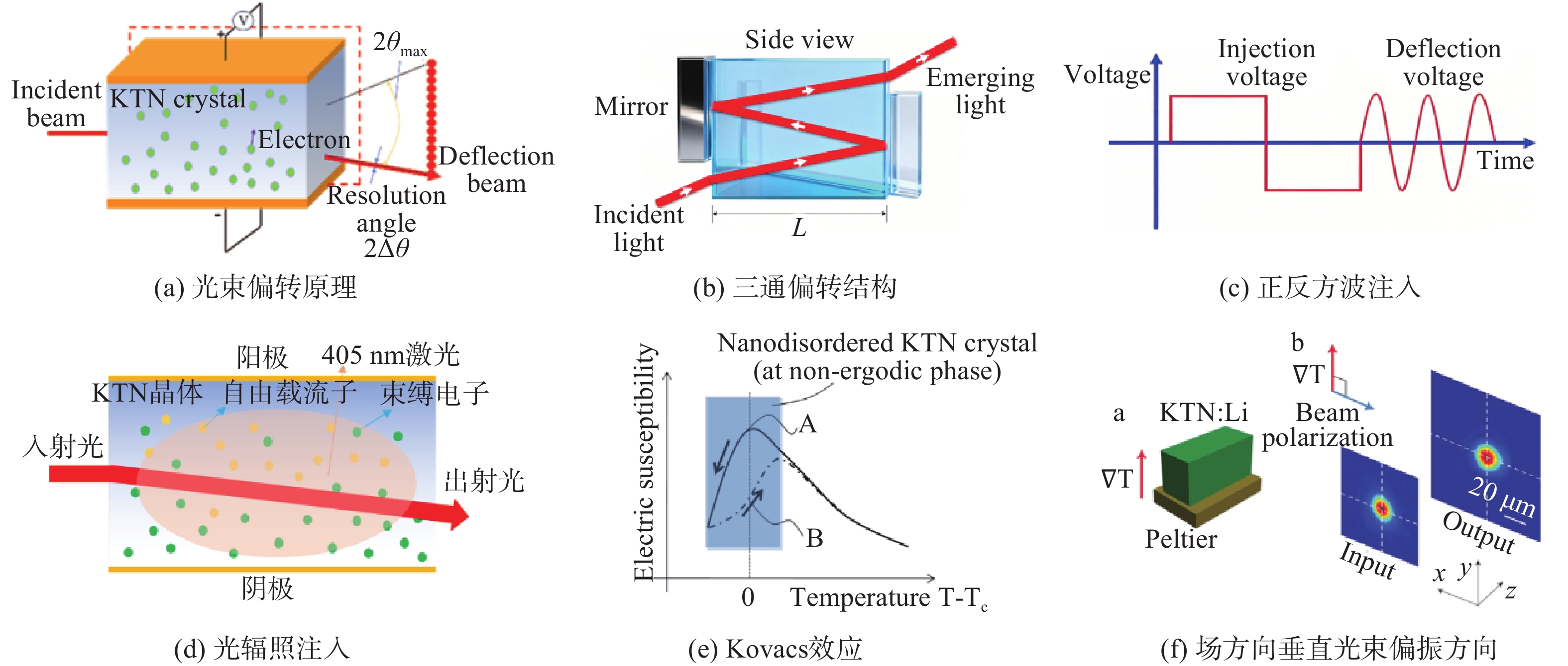 Figure 5. KTN beam deflector based on space-charge control. (a) Principle of beam deflection. (b) Three-way deflection structure. (c) positive and negative square wave injection. (d) Optical irradiation injection. (e) Kovacs effect[71]. (f) The direction of the field is perpendicular to the polarization direction of the light beam[64].