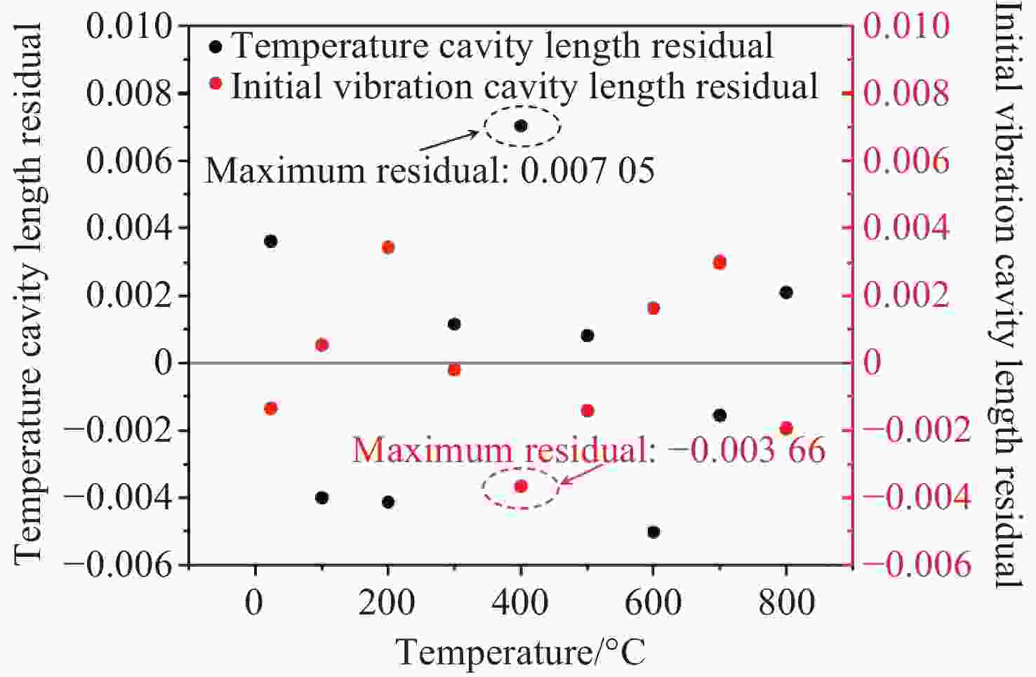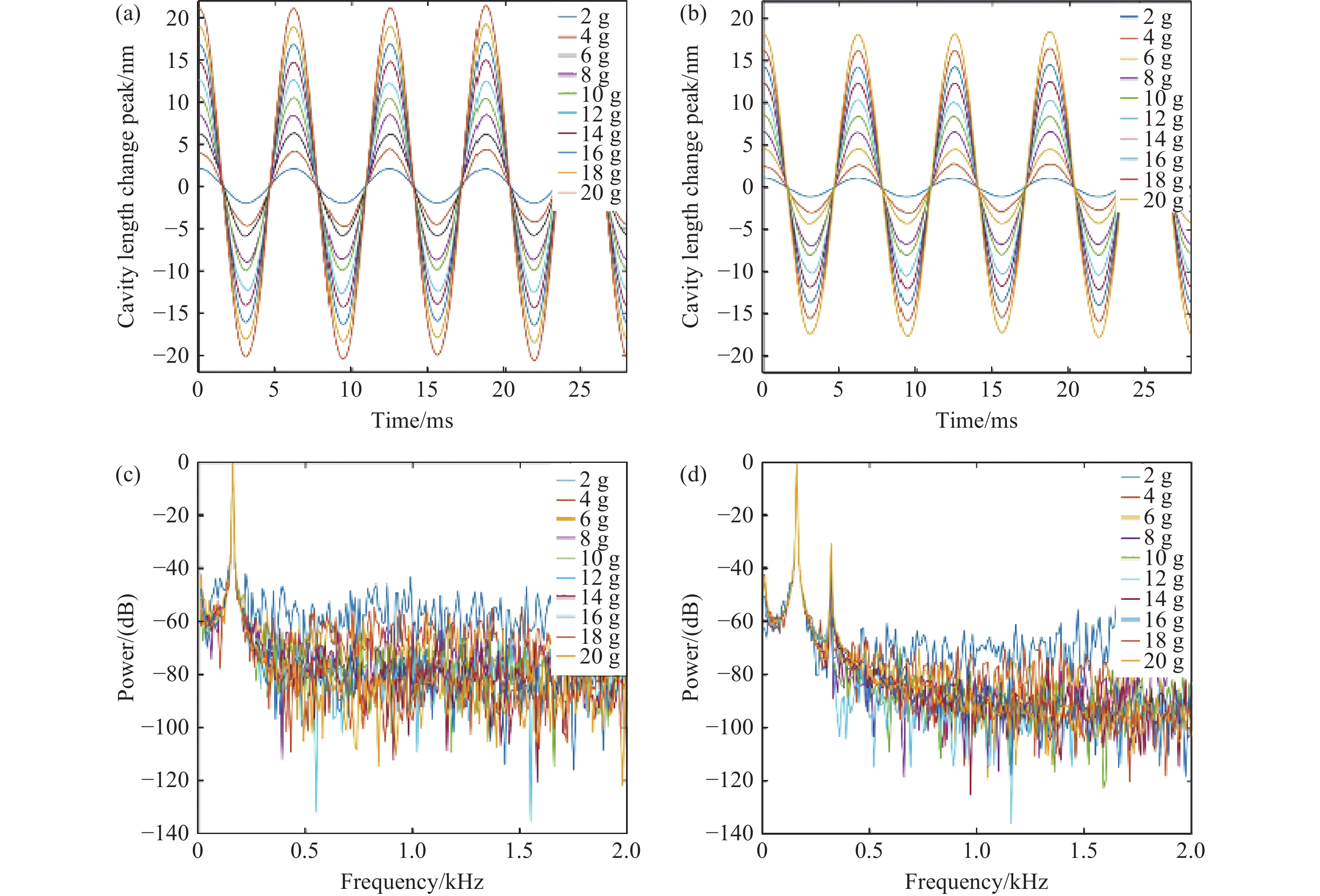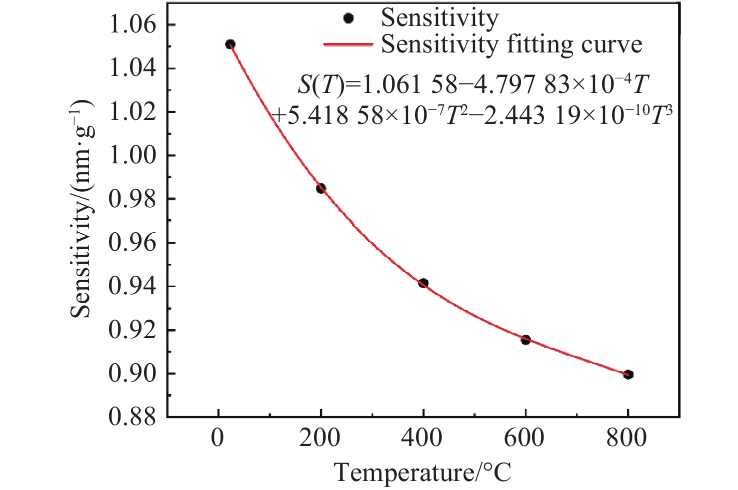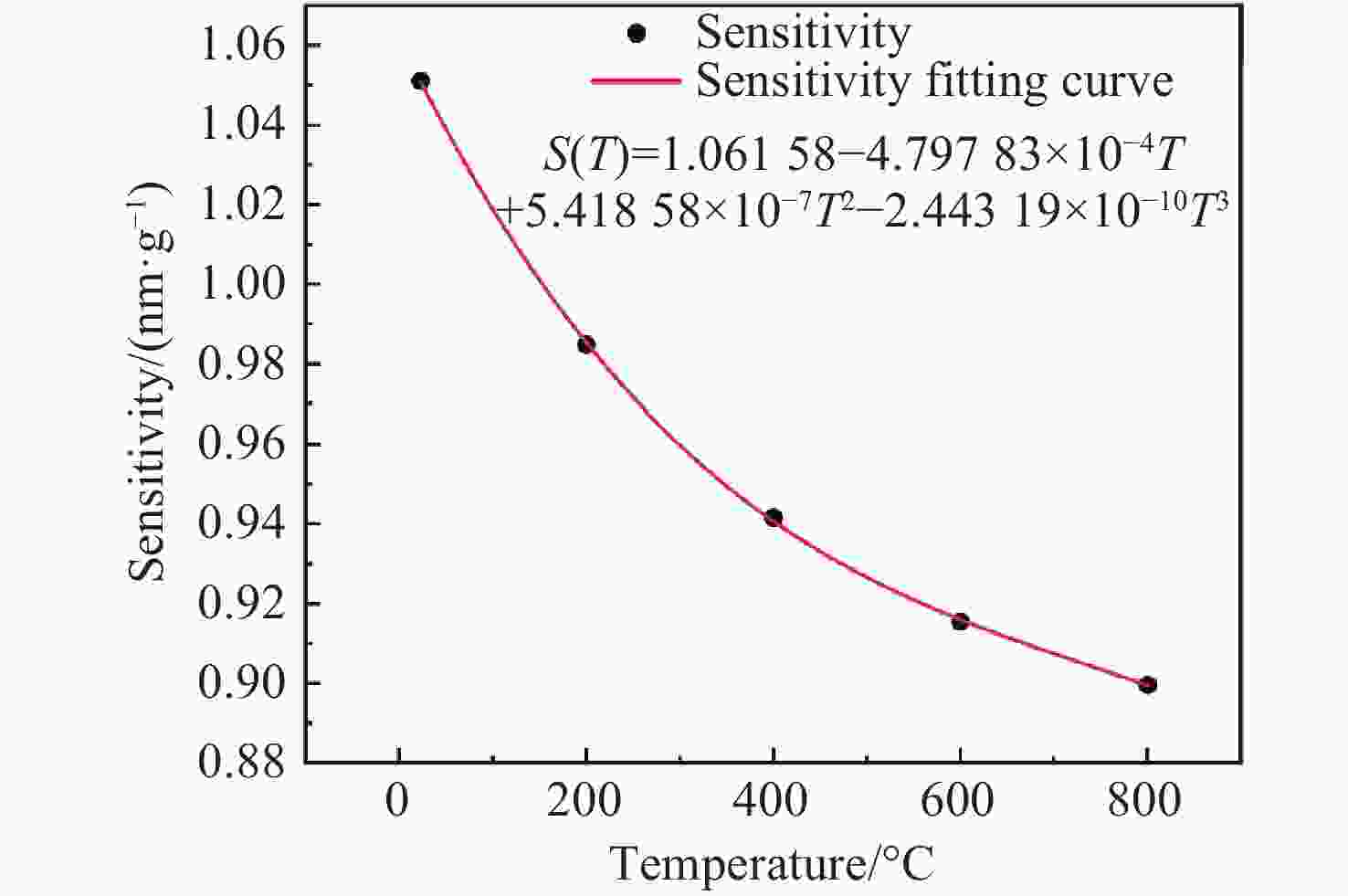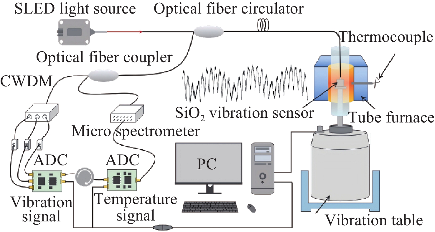 0.8915 nm/g;经温度补偿后,传感器的残差平方和最大为0.168,全量程误非线性误差不大于1.033%;在动态响应测试中,该传感器的特征频率远高于6000 Hz,在100−2000 Hz的频率响应范围内表现出较高的平坦度,其灵敏度在2000 −6000 Hz之间逐渐增加,最大增量仅为0.177 nm/g。此外,传感器具有高一致性、全无胶化集成、抗电磁干扰等优点,为高温环境下的振动测量提供了一种新的解决思路,在高温振动领域具有广泛的应用前景。Abstract:To An all-silica fiber-optic Fabry-Perot (F-P) high-temperature vibration sensor is proposed to address sensor failure and signal distortion in extreme environments. A collimated coupling structure based on a silica ball lens enables integrated, non-contact signal transmission between the fiber and the sensitive structure. The sensitive units are batch-fabricated using MEMS and thermal pressure bonding technologies. By combining three-wavelength dynamic demodulation with spectral cross-correlation, precise vibration signal extraction and temperature compensation are achieved, effectively eliminating thermal cross-sensitivity. Experimental results indicate that as the temperature increases from room temperature (23 °C) to 800 °C, the sensitivity of the sensor decreases from 1.051 nm/g to