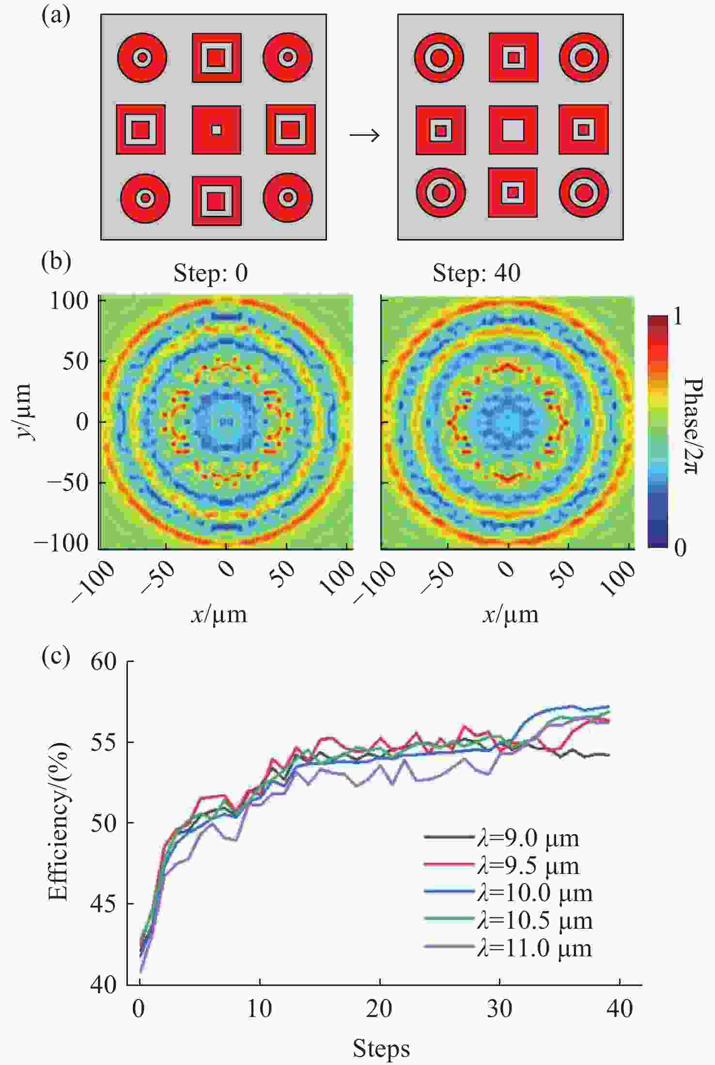 Abstract:Metalens technology has been applied extensively in miniaturized and integrated infrared imaging systems. However, due to the high phase dispersion of unit structures, metalens often exhibits chromatic aberration, making broadband achromatic infrared imaging challenging to achieve. In this paper, six different unit structures based on chalcogenide glass are constructed, and their phase-dispersion parameters are analyzed to establish a database. On this basis, using chromatic aberration compensation and parameterized adjoint topology optimization, a broadband achromatic metalens with a numerical aperture of 0.5 is designed by arranging these six unit structures in the far-infrared band. Simulation results show that the metalens achieves near diffraction-limited focusing within the operating wavelength range of 9−11 µm, demonstrating the good performance of achromatic aberration with flat focusing efficiency of 54%−58% across all wavelengths.