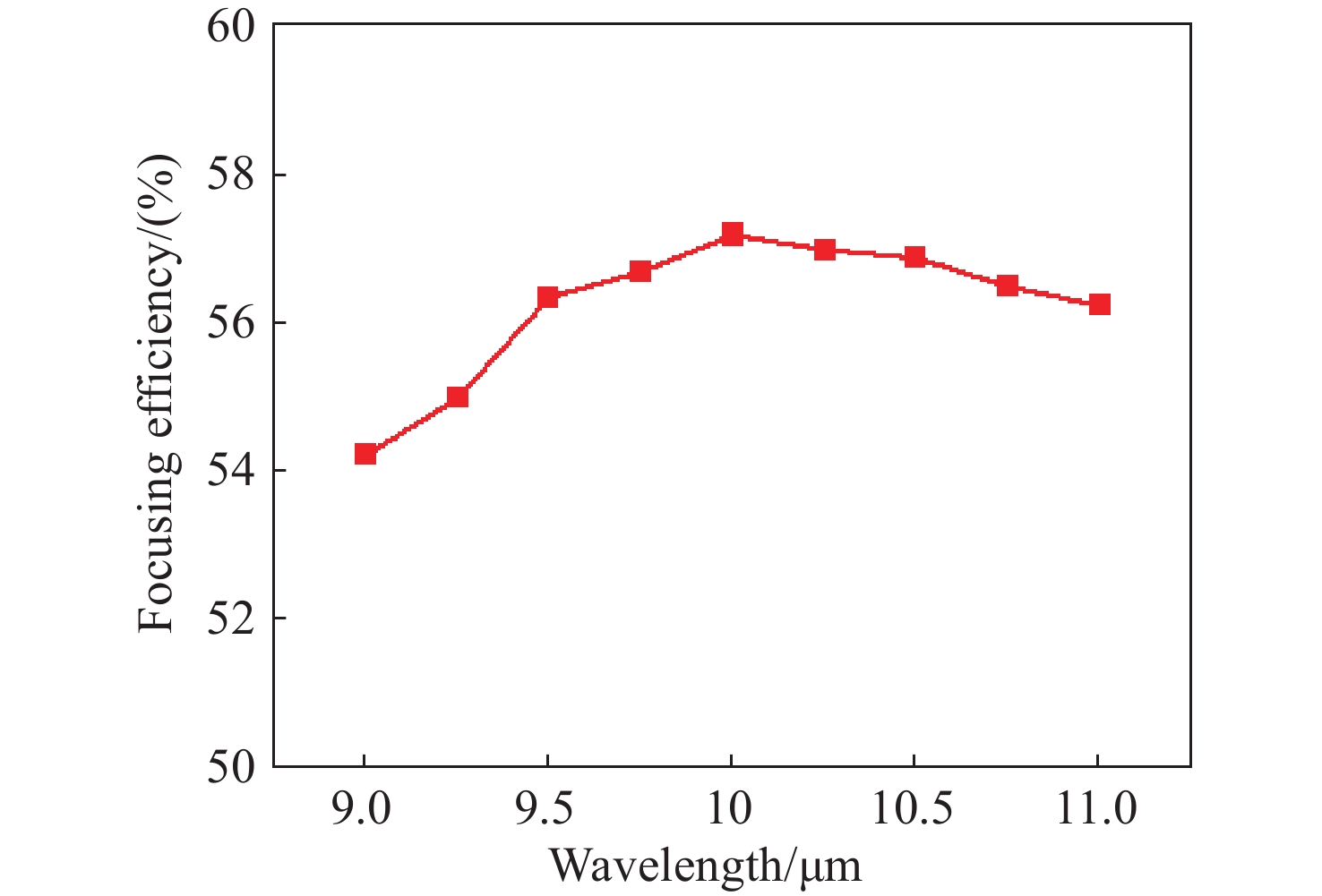 超透镜技术在小型化、集成化红外成像系统中有着广泛的应用。然而,由于单元结构的色散较高,导致超透镜经常出现色差,使得宽带消色差红外成像难以实现。该文章构建了基于硫系玻璃的6种不同单元结构,并对其相位色散参数进行分析,建立数据库。在此基础上,采用色差补偿和参数化伴随拓扑优化的方法,在远红外波段将这6种单元结构排列组合,设计出数值孔径为0.5的宽带消色差超透镜。仿真结果表明,该超透镜在9~11µm的工作波长范围内实现了近衍射极限聚焦,具有良好的消色差性能,全波长具有为54%~58%的平坦的聚焦效率。
