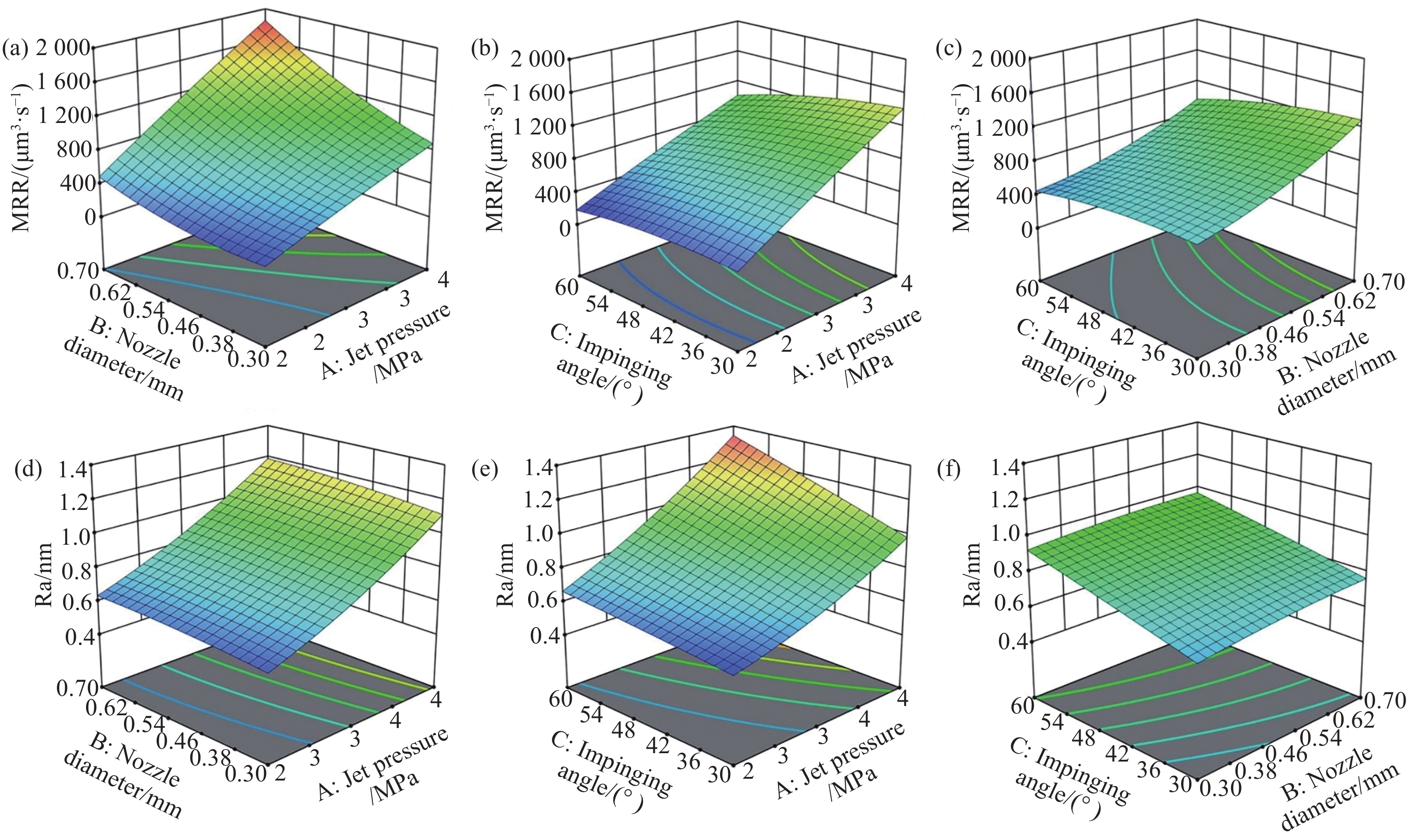 Abstract:As a non-contact ultra-precision machining method, abrasive water jet polishing (AWJP) has significant application in optical elements processing due to its stable tool influence function (TIF), no subsurface damage and strong adaptability to workpiece shapes. In this study, the effects of jet pressure, nozzle diameter and impinging angle on the distribution of pressure, velocity and wall shear stress in the polishing flow field were systematically analyzed by computational fluid dynamics (CFD) simulation. Based on the Box-Behnken experimental design, a response surface regression model was constructed to investigate the influence mechanism of process parameters on material removal rate (MRR) and surface roughness (Ra) of fused silica. And experimental results showed that increasing jet pressure and nozzle diameter significantly improved MRR, consistent with shear stress distribution revealed by CFD simulations. However, increasing jet pressure and impinging angle caused higher Ra values, which was unfavorable for surface quality improvement. Genetic algorithm (GA) was used for multi-objective optimization to establish Pareto solutions, achieving concurrent optimization of polishing efficiency and surface quality. A parameter combination of 2 MPa jet pressure, 0.3 mm nozzle diameter, and 30° impinging angle achieved MRR of 169.05 μm³/s and Ra of 0.50 nm. Experimental verification showed prediction errors of 4.4% (MRR) and 3.8% (Ra), confirming the model’s reliability. This parameter optimization system provides theoretical basis and technical support for ultra-precision polishing of complex curved optical components.