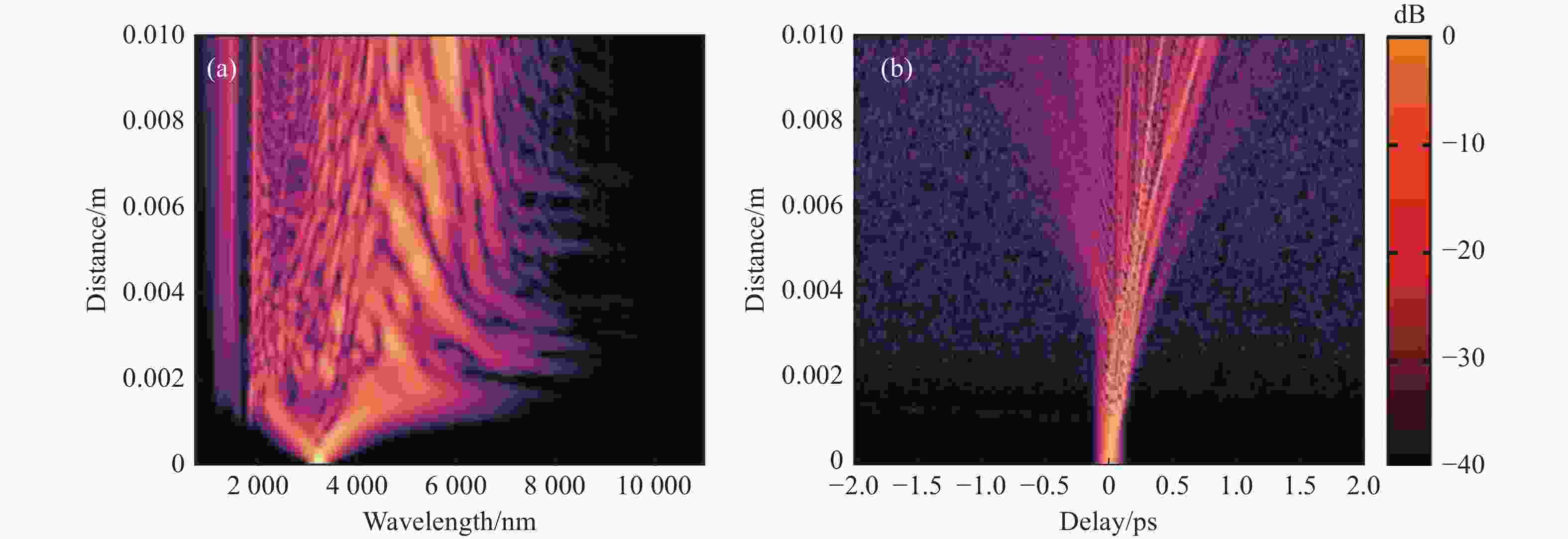 d 1/Λ 为0.125、d 2/Λ 为0.583并且零色散波长为3.228 μm时,通过在3.3 μm处以峰值功率800 W、半高全宽20 fs的高斯脉冲泵浦10 mm光纤,可获得谱宽为4.852 μm的超连续谱。在反常色散区泵浦脉冲波长为4.0 μm、峰值功率为2000 W、半高全宽为80 fs时,调制不稳定性效应被明显抑制,可获得从1.1 μm扩展到8.99 μm的宽带高相干性超连续谱。在正常色散区2.8 μm处泵浦该光纤,可使部分脉冲能量转移到反常色散区,可在10 mm光纤输出端得到从0.8 μm扩展到9.8 μm的宽带高相干性超连续谱。本文在Al0.24Ga0.76As光子晶体光纤中引入了椭圆气孔,为调整超连续谱的性能增加了灵活度,用最短的光纤获得了最宽的超连续谱。-