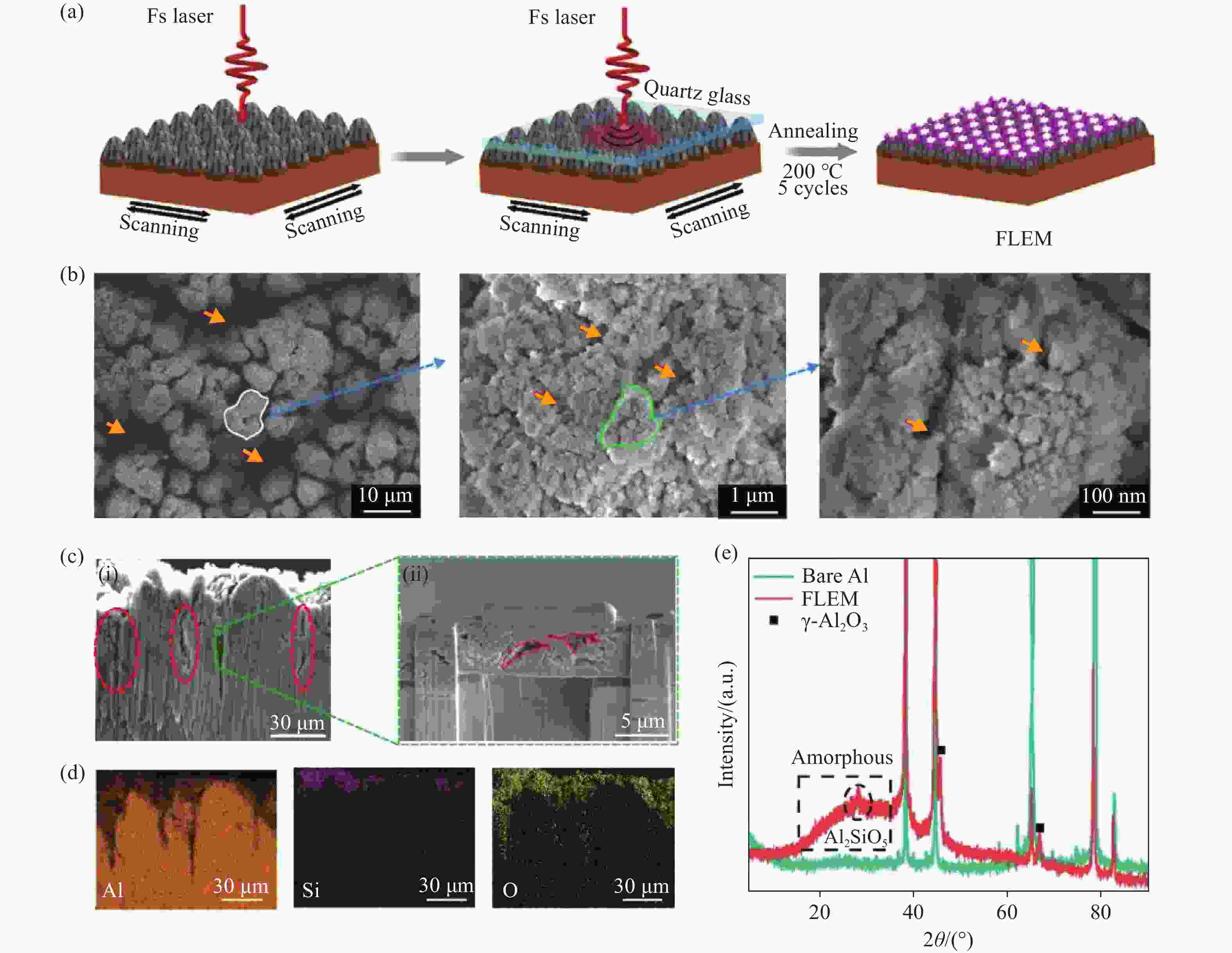 Figure 1. Characterizations of the surface profile and chemical compositions on the FLEM sample. (a) Schematic diagram of the FLEM method. (b) Top-view SEM images of the surface morphology. (c) Cross-sectional SEM images of the structure (i) and the corresponding local area (ii). (d) EDX images of the cross-sectional area of the structure. (e) GIXRD spectra for the bare Al and the FLEM sample