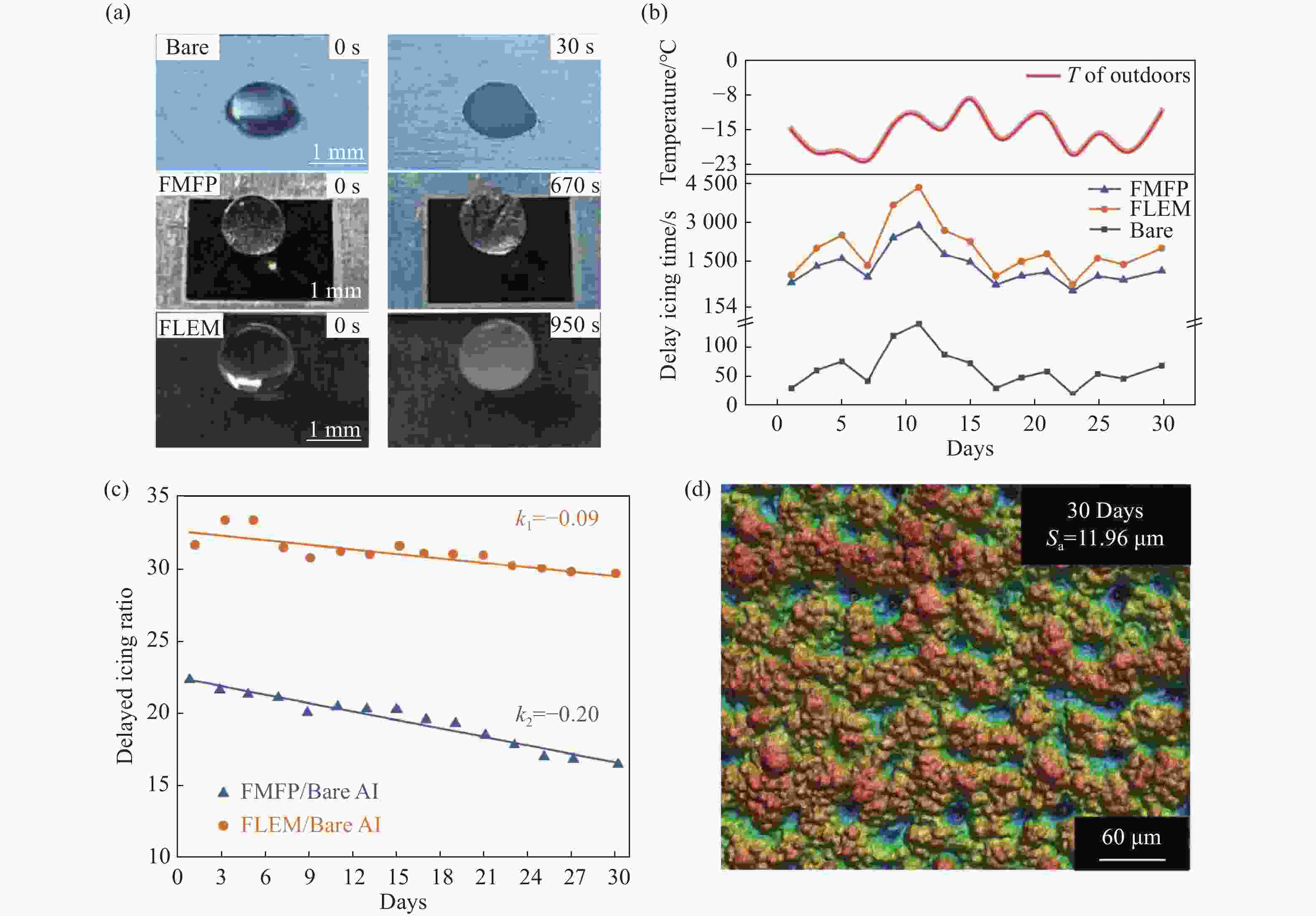 Figure 4. Outdoor anti-icing performance of different samples. (a) Freezing process of a water droplet on different surfaces in the outdoor winter environment. (b) Measured icing time delay for three different samples as a function of the exposing days with variable weather conditions. (c) Available delayed icing ratios of the FLEM and FMFP samples to the bare surface. (d) Microscopic examination of the surface morphology on the FLEM surface after 30 days of the outdoor environment exposure
