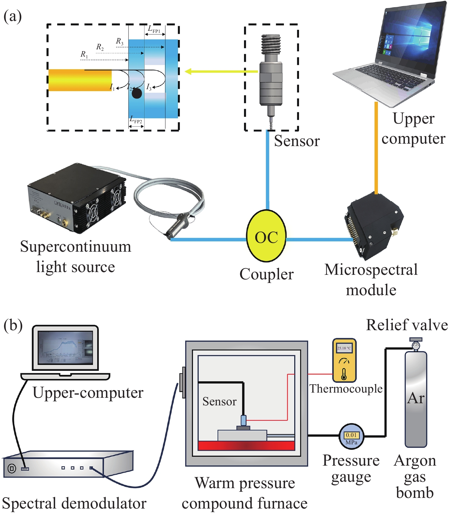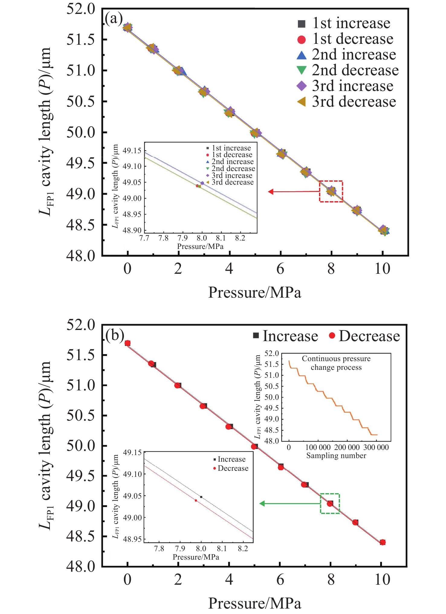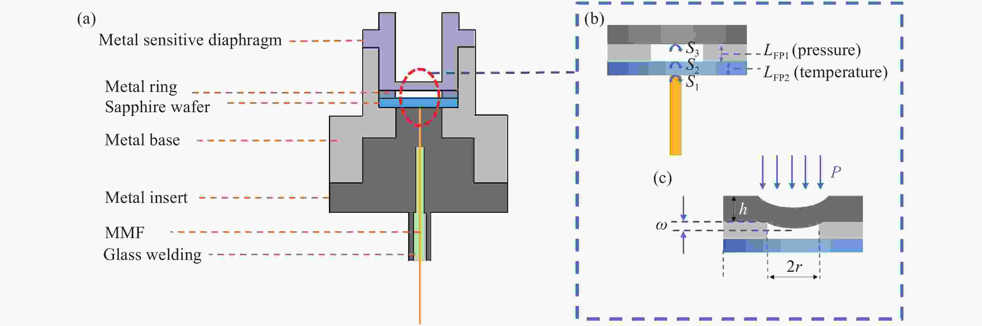 本文针对油气井、发动机燃油系统和航空液压系统等高温密闭环境下压力监测的技术难题,研发了一种具有温度补偿的金属膜片式光纤压力传感器。该传感器采用金属敏感膜片与蓝宝石晶片构成温度-压力双法珀(Fabry-Perot, FP)干涉腔结构,并结合互相关信号解调算法与温度解耦方法,有效降低温度串扰对压力测试的影响。实验结果表明,该传感器在常温和300 °C的压力测量中最大非线性误差分别为0.75% FS和0.99% FS。经过温度解耦后,压力测量精度可达1.7% FS。该传感器具有良好的静态压力响应、稳定性和可靠性,为高温压力监测场景提供了一种有效的解决方案。