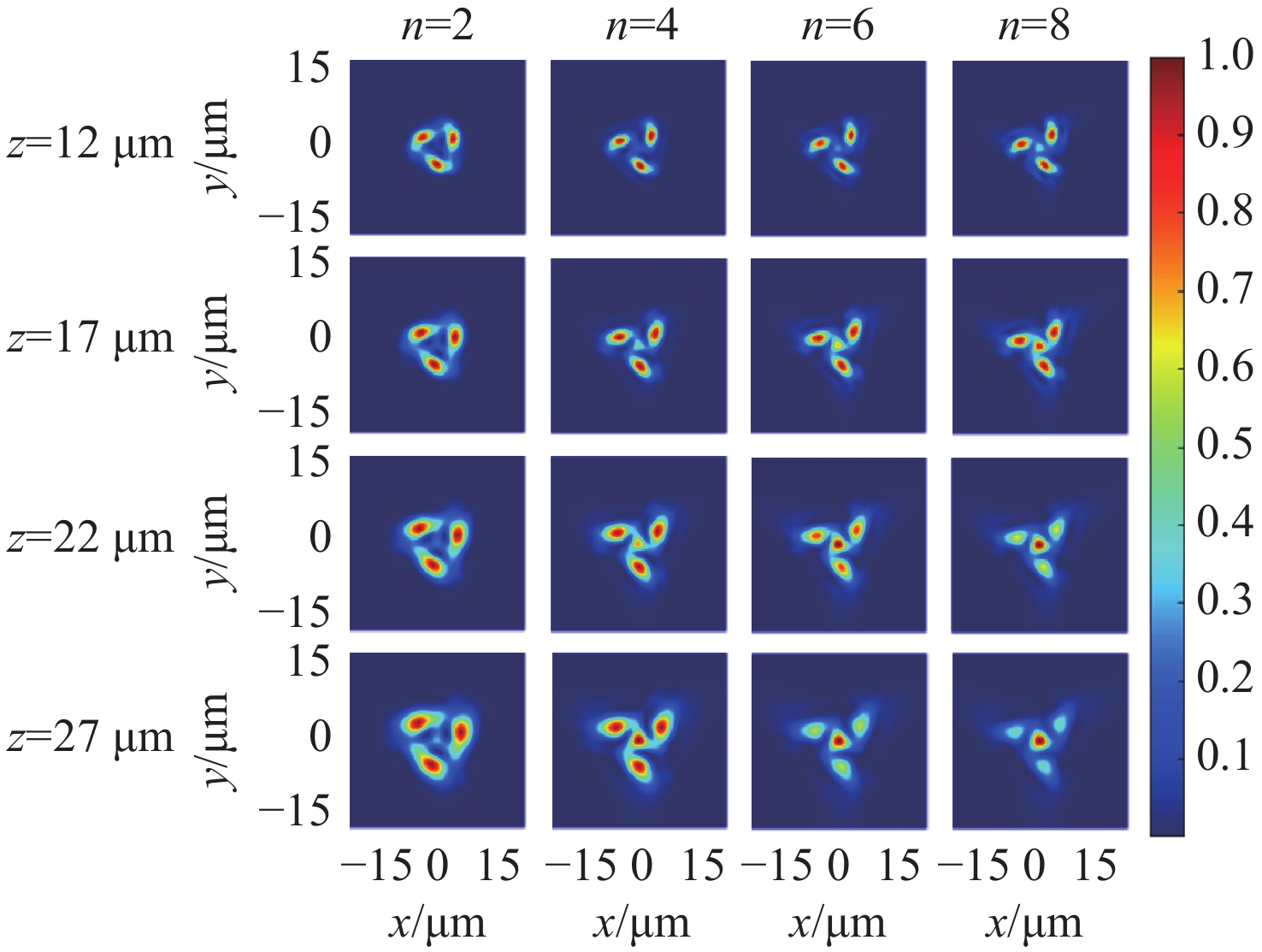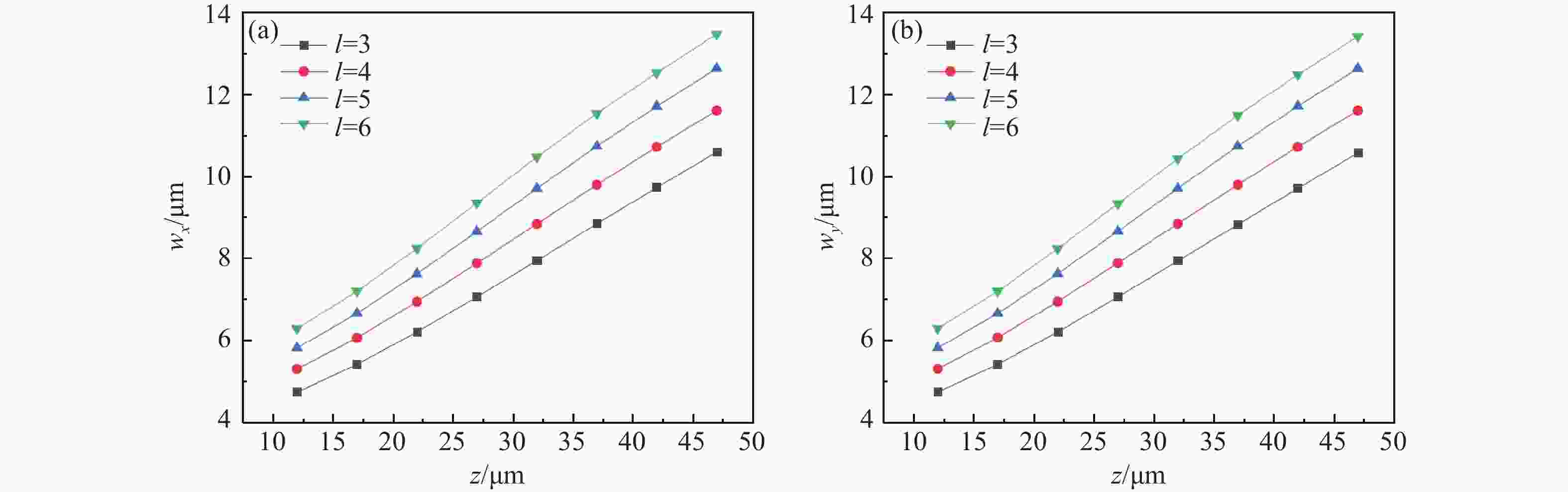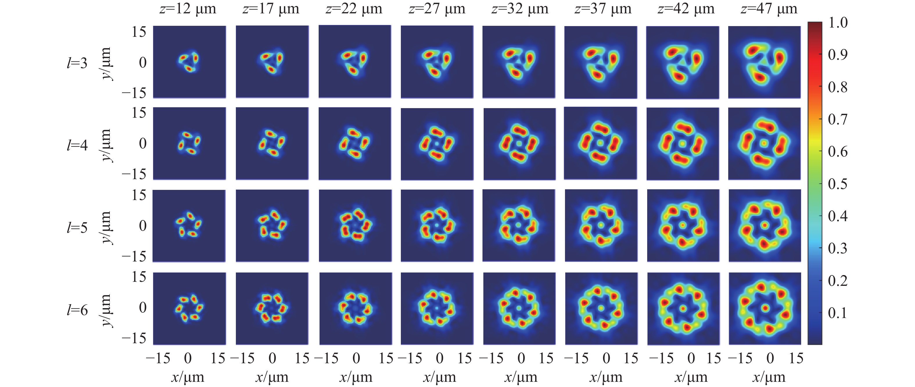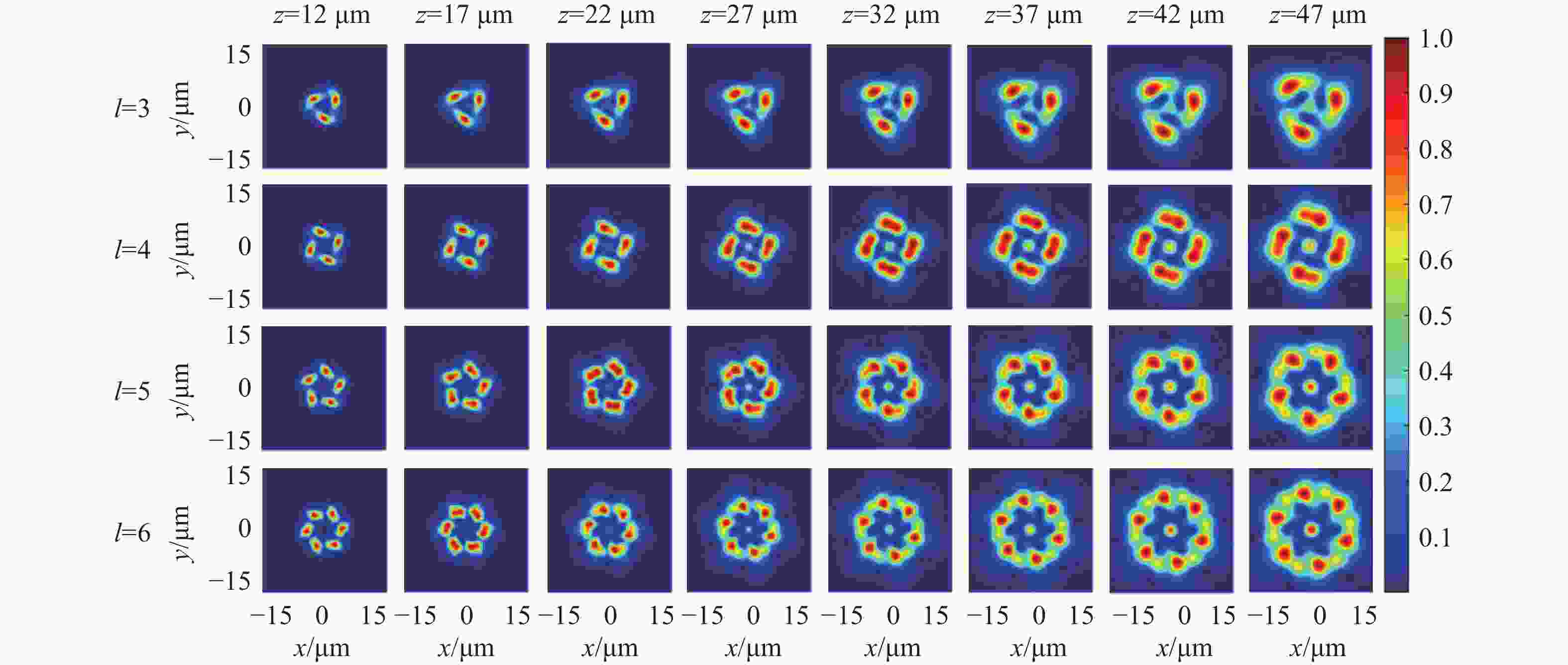 z 、幂指数n 、波长$ \lambda $ 和束腰宽度w 对光强、光束宽度和光束发散角的影响。研究结果表明,增加传播距离和波长会导致更大的光束扩散和光束宽度增大。相反,较高的幂指数会使光强向中心集中,并减缓光束宽度的扩展。此外,较长的波长和较小的束腰宽度会导致更大的光束发散角。还分析了相干涡旋和强度峰值位置随传播距离增加的演变情况,结果显示它们逐渐从光束中心向外偏移,并伴随着角度偏差和位置变化。特别是当拓扑荷l ≥ 4时,峰值点的位置在传输过程中会发生跃变。作为一种高阶模式光束,RSPEPVB在生物组织中的传输表现出多样性和可控性,为生物医学领域的微操作技术开辟了新的可能性。Abstract:The transmission characteristics of rotationally symmetric power-exponent-phase vortex beams (RSPEPVBs) in biological tissues are explored in this study. Based on the extended Huygens-Fresnel principle, a general expression describing the transmission of RSPEPVBs through biological tissues is established. Numerical simulations are performed to explore the influence of the propagation distance