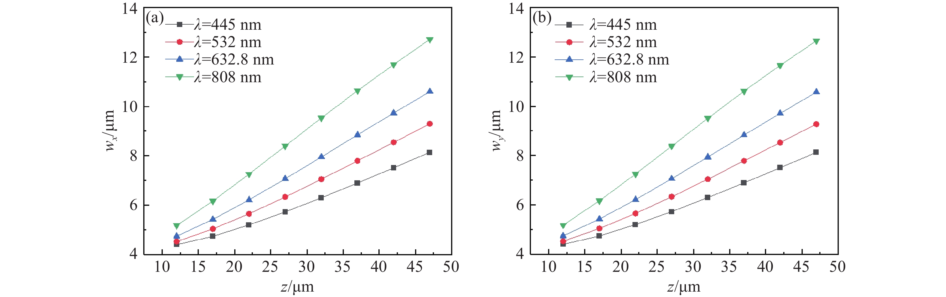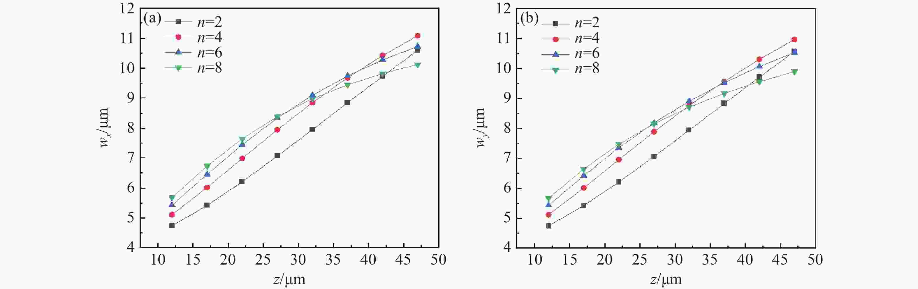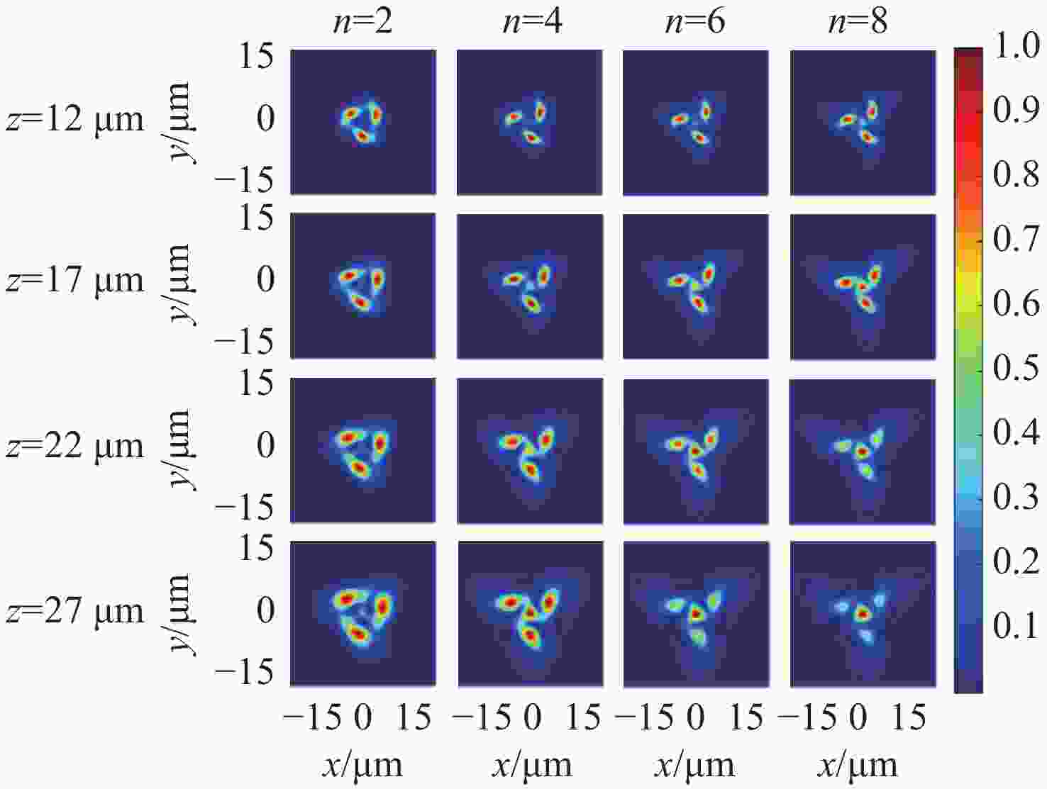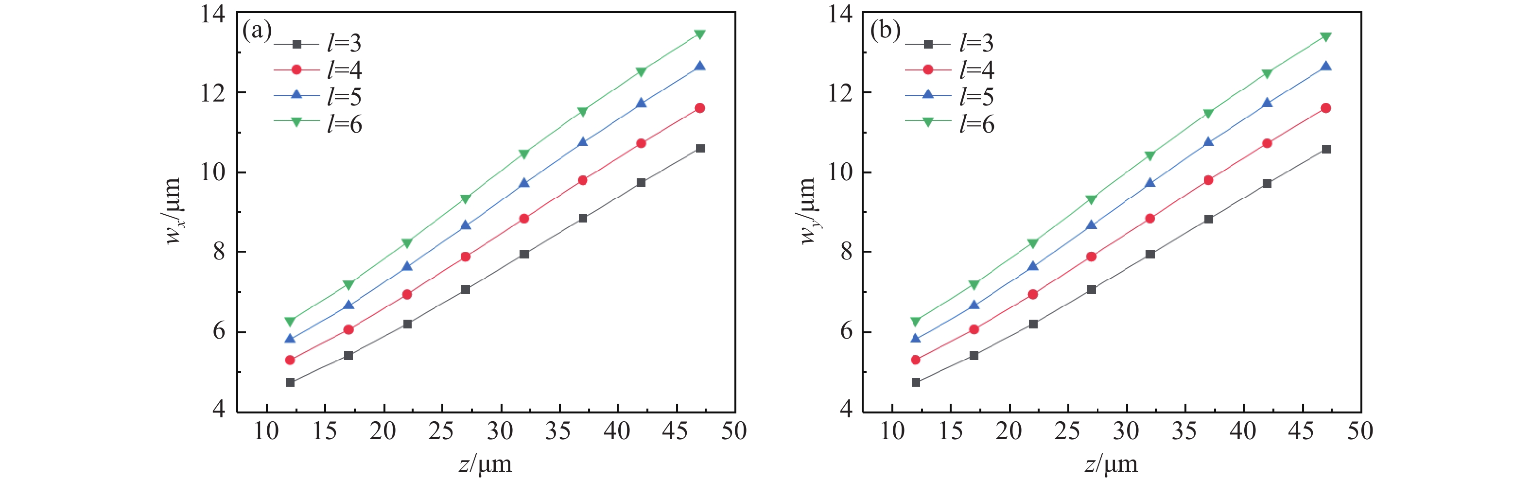z 、幂指数n 、波长$ \lambda $ 和束腰宽度w 对光强、光束宽度和光束发散角的影响。研究结果表明,增加传播距离和波长会导致更大的光束扩散和光束宽度增大。相反,较高的幂指数会使光强向中心集中,并减缓光束宽度的扩展。此外,较长的波长和较小的束腰宽度会导致更大的光束发散角。还分析了相干涡旋和强度峰值位置随传播距离增加的演变情况,结果显示它们逐渐从光束中心向外偏移,并伴随着角度偏差和位置变化。特别是当拓扑荷l ≥ 4时,峰值点的位置在传输过程中会发生跃变。作为一种高阶模式光束,RSPEPVB在生物组织中的传输表现出多样性和可控性,为生物医学领域的微操作技术开辟了新的可能性。Abstract:The transmission characteristics of rotationally symmetric power-exponent-phase vortex beams (RSPEPVBs) in biological tissues are explored in this study. Based on the extended Huygens-Fresnel principle, a general expression describing the transmission of RSPEPVBs through biological tissues is established. Numerical simulations are performed to explore the influence of the propagation distance