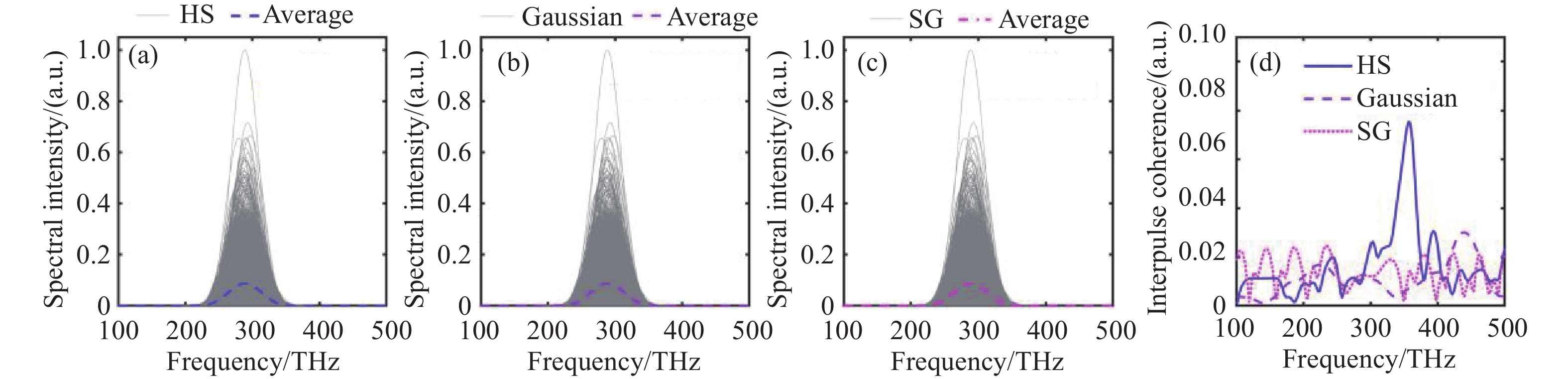 6000 randomly generated pulses. Dashed lines: averaged spectral intensity (blue: HS, violet: Gaussian, magenta: SG). (d) Interpulse coherence for HS (blue solid), Gaussian (violet dashed), and SG (magenta dotted). -