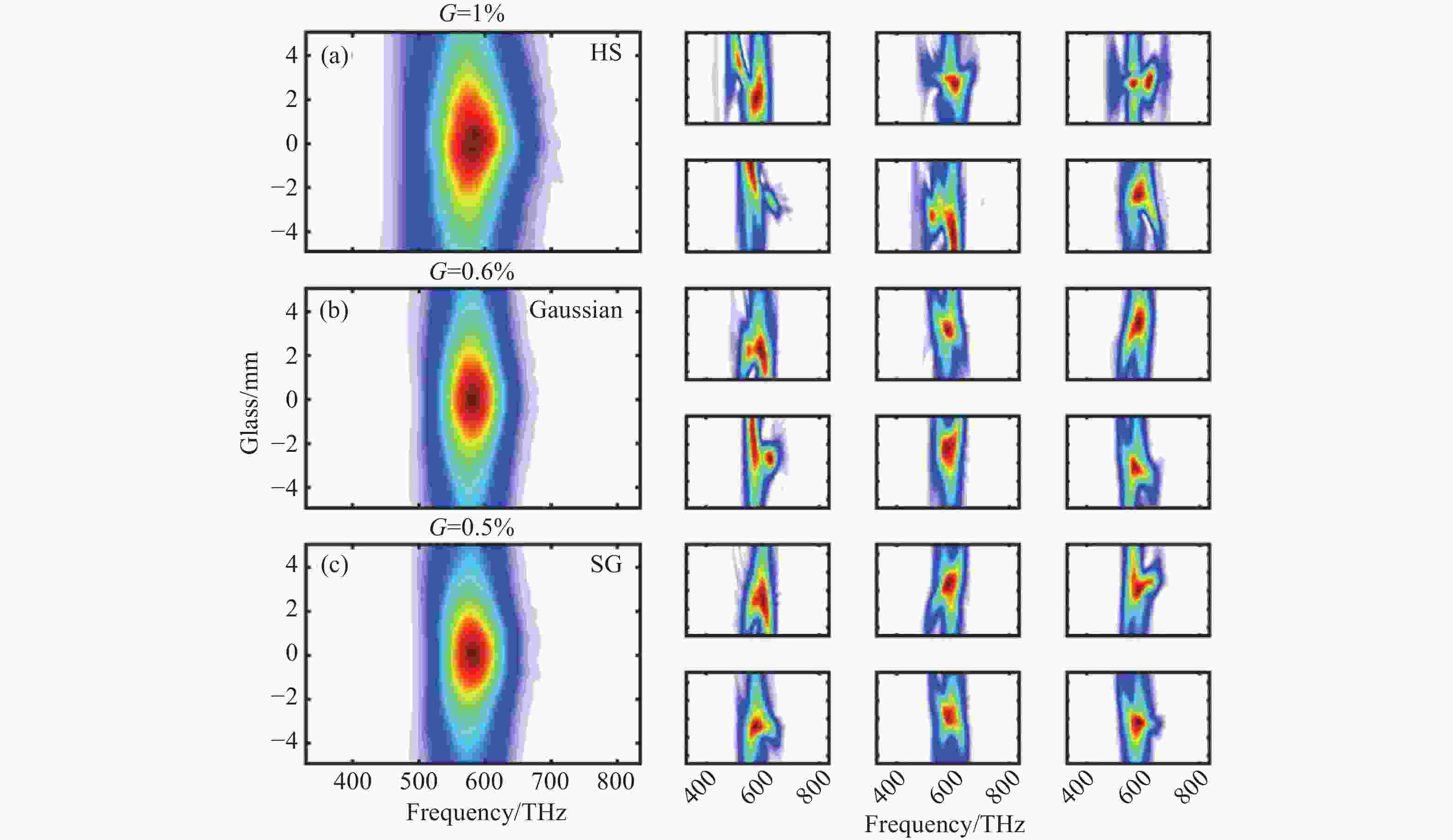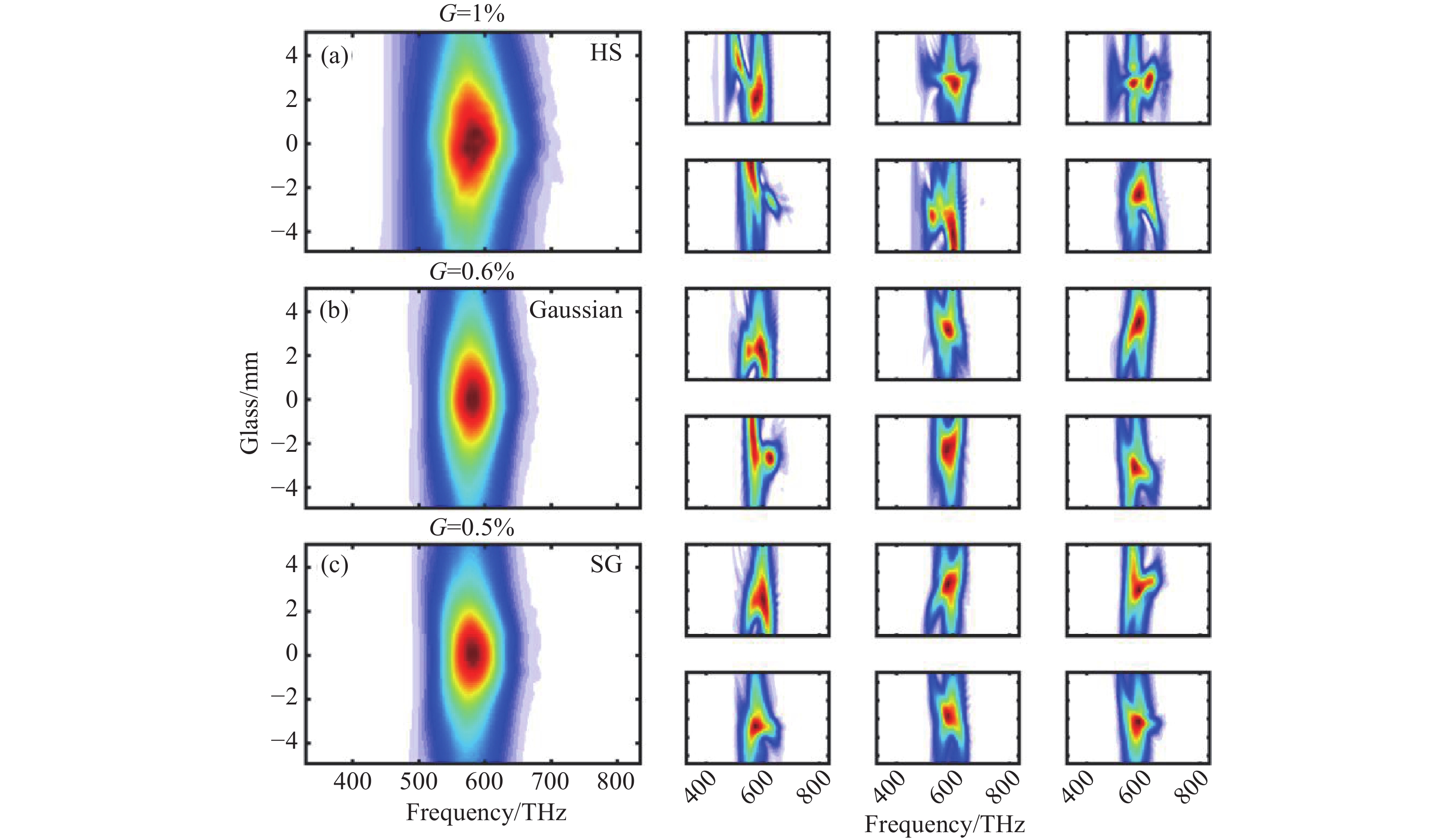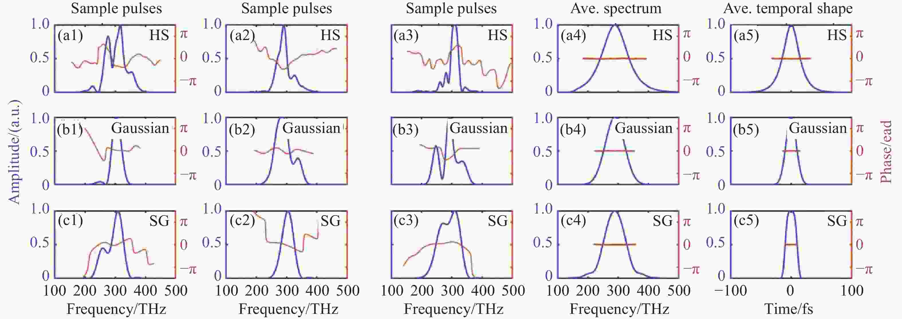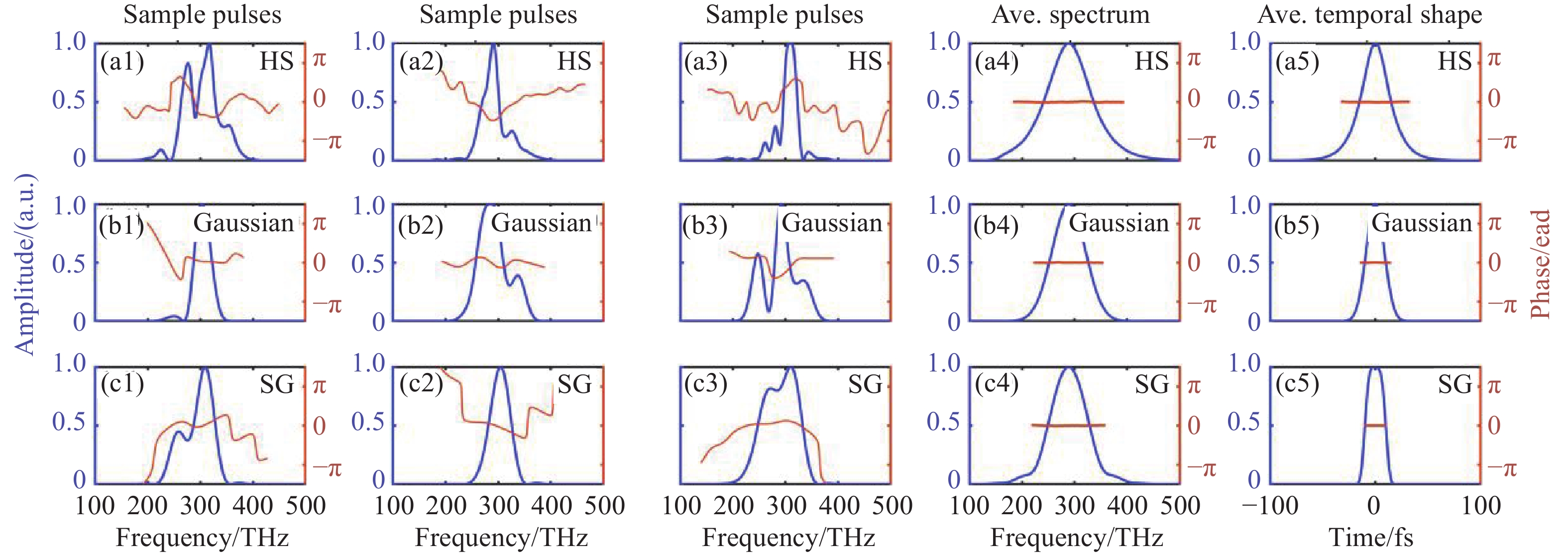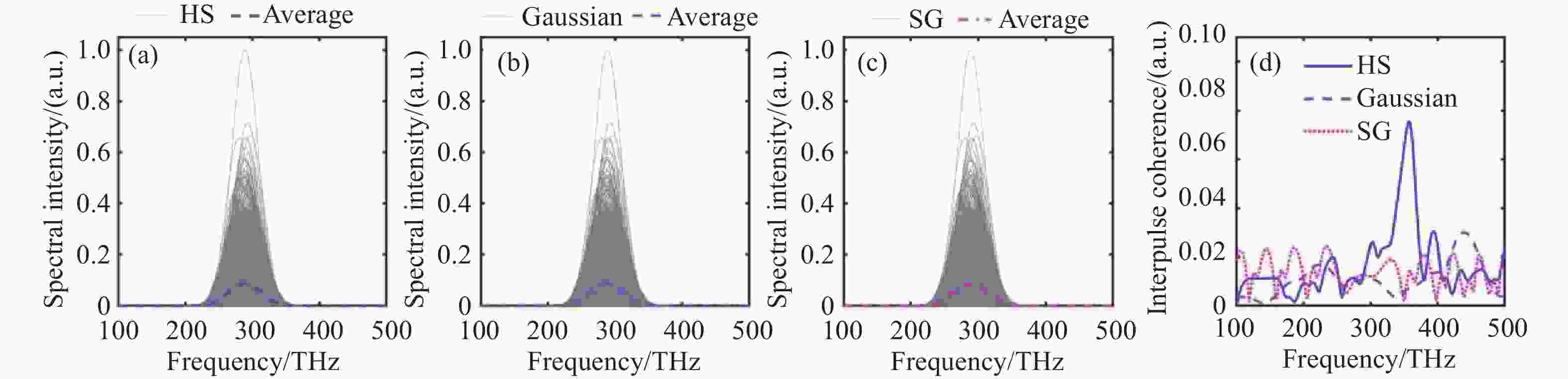 6000 randomly generated pulses. Dashed lines: averaged spectral intensity (blue: 30 THz, violet: 60 THz, magenta: 100 THz). (d) Interpulse coherence for 30 THz (blue solid), 60 THz (violet dashed), and 100 THz (magenta dotted).Figure 2. Partially coherent pulse trains generated with initial spectral shapes: (a) HS, (b) Gaussian, (c) SG. Gray curves: