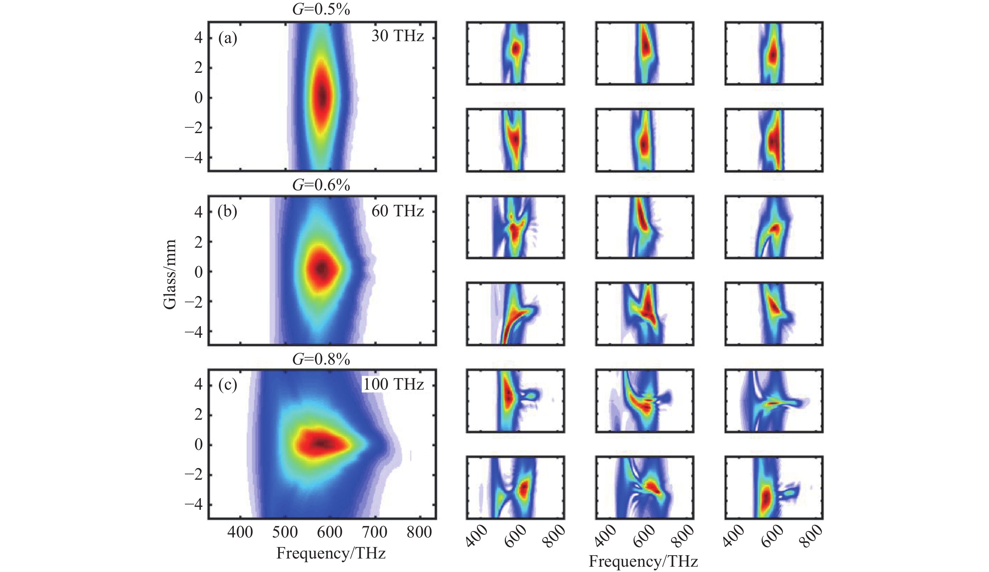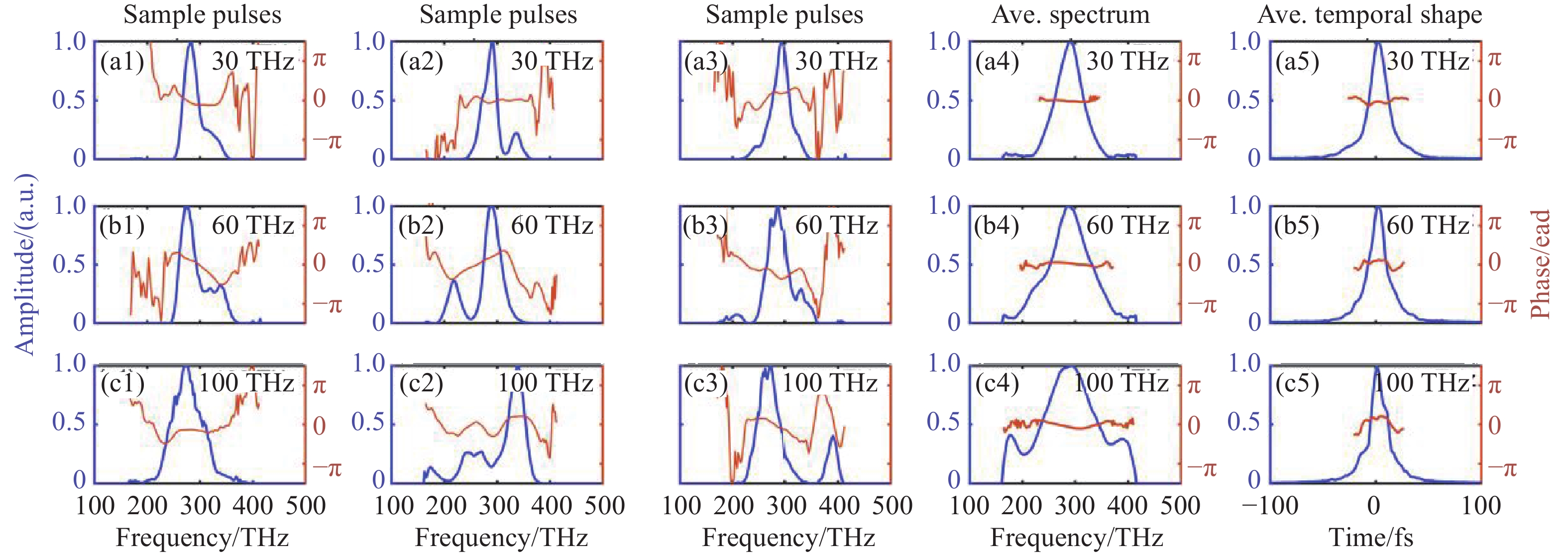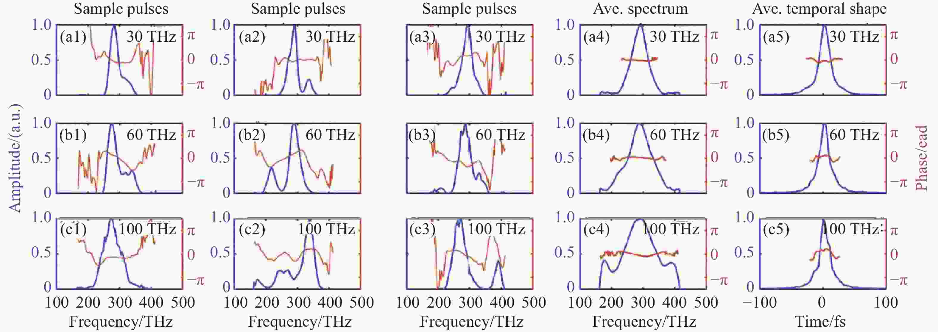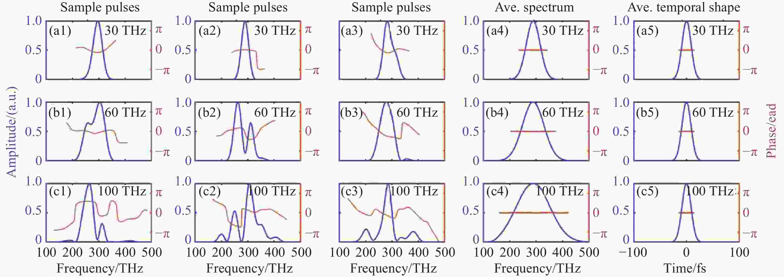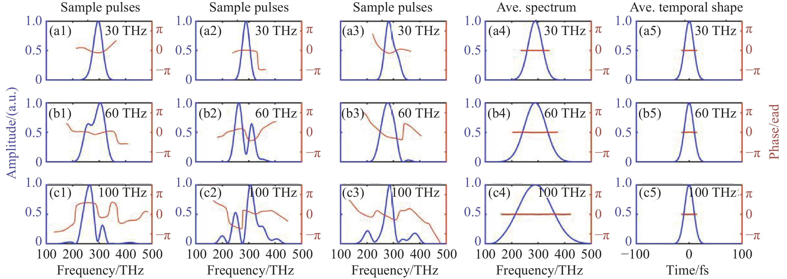 Figure 1. Partially coherent pulse trains generated with initial spectral FWHM of (a) 30 THz, (b) 60 THz, and (c) 100 THz. Gray curves: