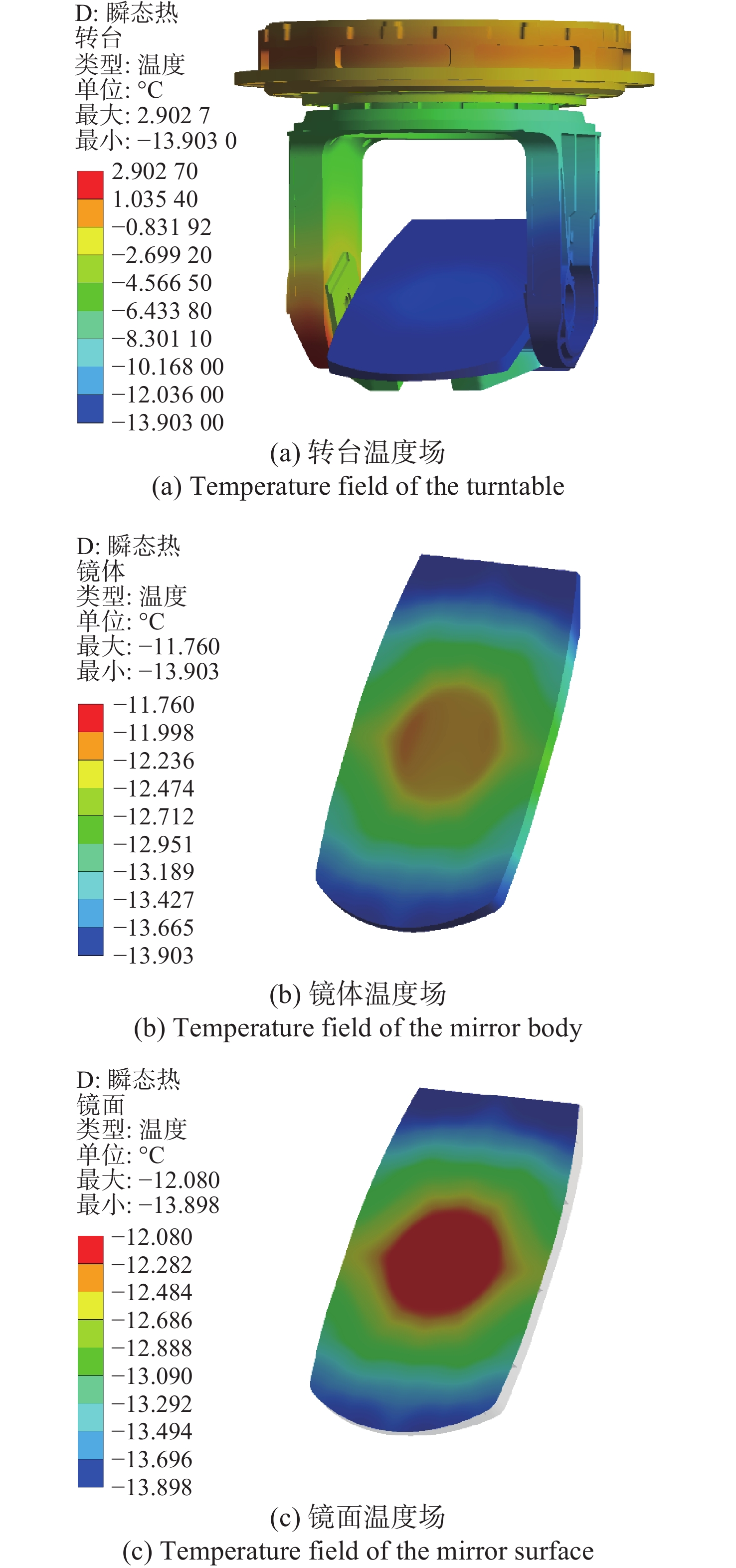 During the ascent of an aircraft to its cruising altitude, the external environmental temperature changes drastically. Simultaneously, the internal stepper motors and bearings continuously generate heat due to the periodic rapid start-stop operations of the scanning mirror turntable in the step-scanning mode. These factors cause a temperature gradient across the turntable, which induces thermal deformation of the mirror surface figure and ultimately degrades the imaging quality of the optical system. To address this issue, an analysis method based on thermal-structural coupling is proposed. First, the thermal balance equation of the scanning mirror turntable was established. Combined with the actual thermal boundary conditions, a finite element analysis (FEA) model was constructed. This model was utilized to optimize the design of the mirror assembly and the adhesive layer by analyzing the relationship between the surface figure and adhesive parameters under complex thermal environments and working conditions. The optimization results show that when the adhesive layer thickness is 1 mm, the mirror achieves the optimal surface figure accuracy with a root-mean-square (RMS) value of 43.54 nm. Furthermore, ground thermal chamber tests were conducted to simulate the temperature variations and operating status during takeoff. The relative error between the experimental measurements and the simulation results is less than 10%. These results verify that the proposed method is effective for evaluating the dynamic response characteristics of the scanning mirror surface in a temperature gradient field, providing theoretical support for the design of the mirror bonding layer and related components.
