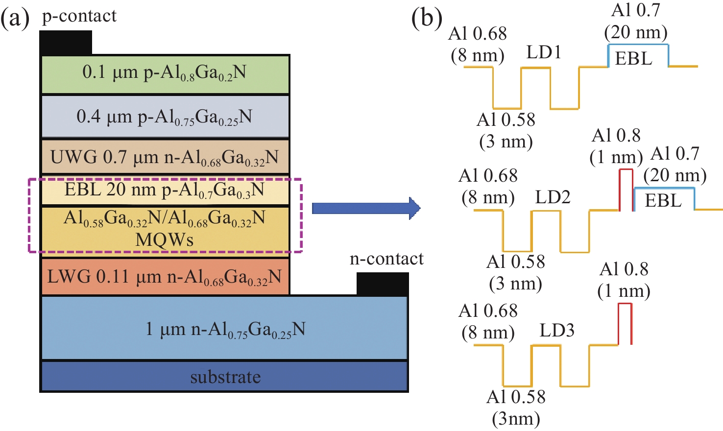 AlGaN-based deep-ultraviolet (DUV) laser diodes (LDs) face performance challenges due to electron leakage and poor hole injection which is often worsened by polarization effects from conventional electron blocking layers (EBLs). To overcome these limitations, we propose an EBL-free DUV LD design incorporating a 1-nm undoped Al0.8Ga0.2N thin strip layer after the last quantum barrier. Using PICS3D simulations, we evaluate the optical and electrical characteristics. Results show a significant increase in effective electron barrier height (from 158.2 meV to 420.7 meV) and a reduction in hole barrier height (from 149.2 meV to 62.8 meV), which enhance hole injection and reduce electron leakage. The optimized structure (LD3) achieves a 14% increase in output power, improved slope efficiency (1.85 W/A), and lower threshold current. This design also reduces the quantum confined Stark effect and forms dual hole accumulation regions, improving recombination efficiency.