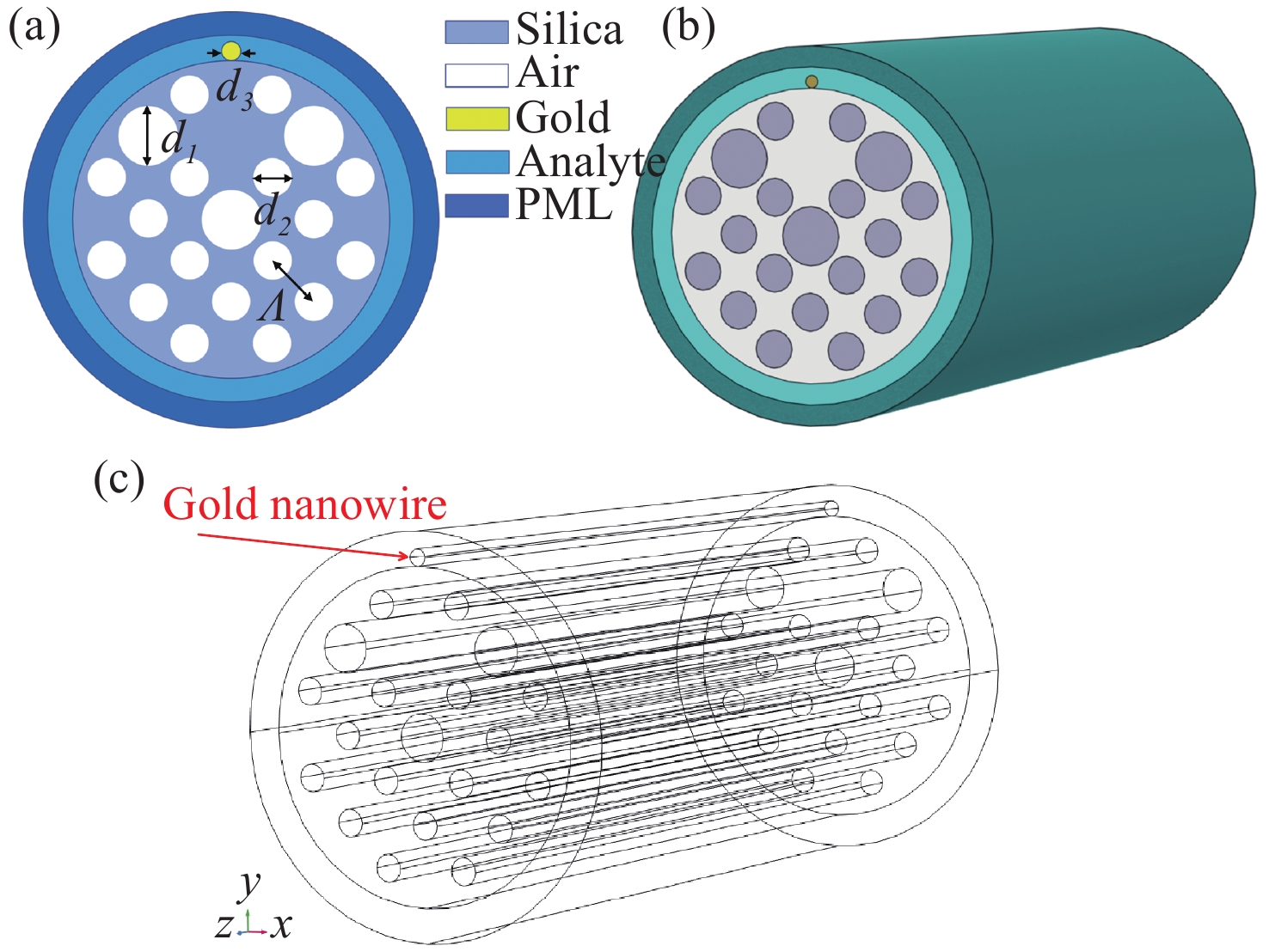 To address the challenges of complex metallic film coating processes and low integration in single-parameter detection for existing photonic crystal fiber surface plasmon resonance (PCF-SPR) sensors, a dual-parameter sensor based on gold nanowire-integrated bias-core PCF-SPR is proposed. Unlike conventional in-hole coatings or metallic film structures, the gold nanowires are directly attached to the fiber cladding via chemical vapor deposition (CVD), eliminating uneven coating issues and significantly simplifying fabrication. By optimizing the asymmetric bias-core fiber structure and leveraging the strong localized field enhancement of gold nanowires, the sensor achieves high-sensitivity synchronous detection of temperature (25−60 °C) and refractive index (1.31−1.40) in dual-polarization modes. The simulation results demonstrate that the x-polarization mode can achieve 1.31−1.40 refractive index detection with maximum wavelength sensitivity and amplitude sensitivity of