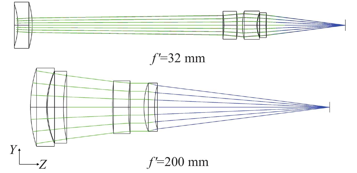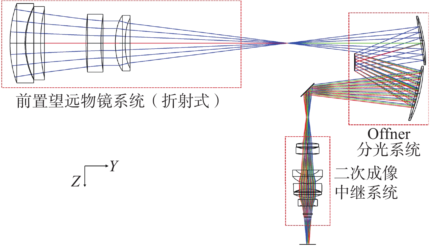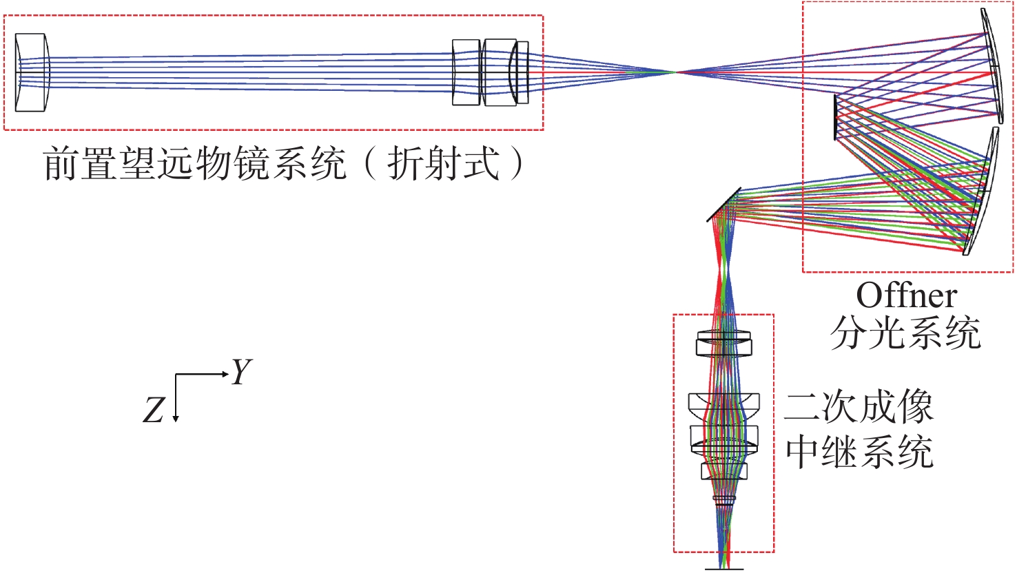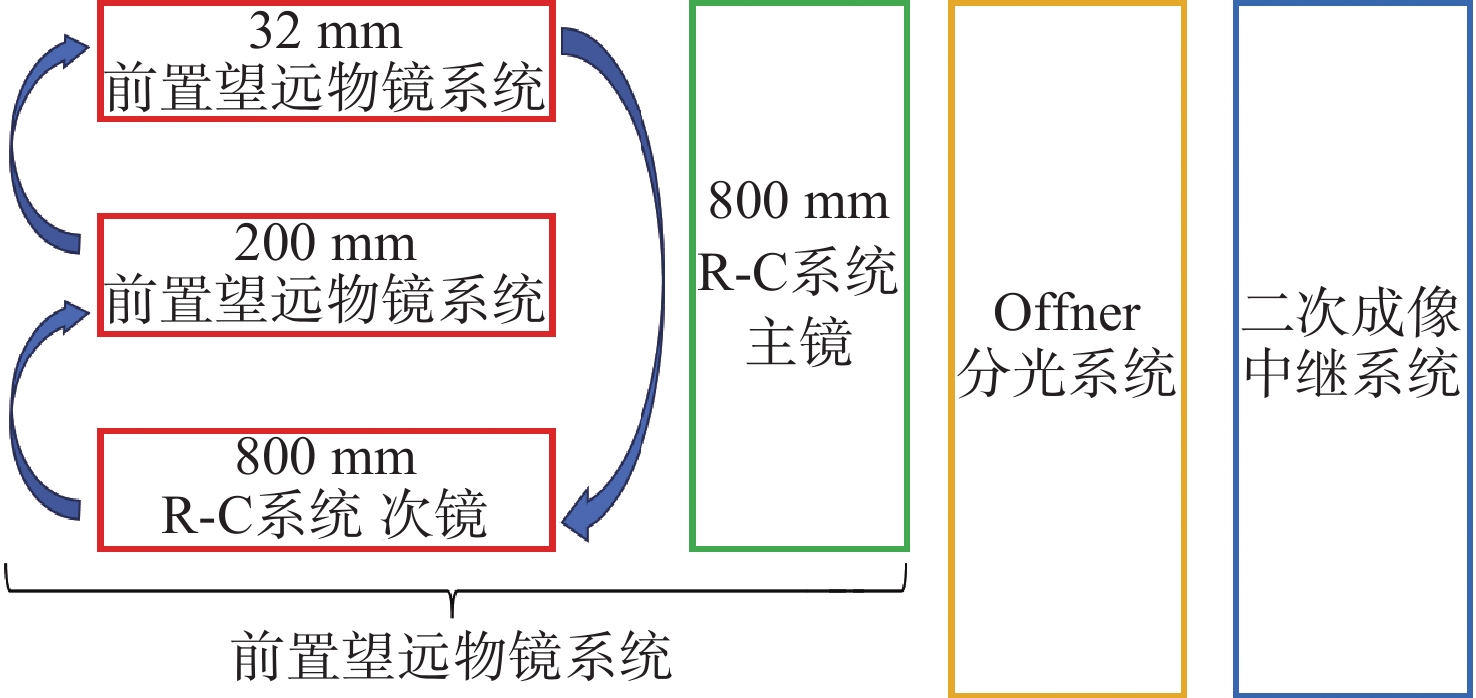 With the breakthrough progress of mid-wave and long-wave infrared hyperspectral imaging technology, the military hyperspectral imaging system, with its unique feature recognition capability and covert reconnaissance advantages, has demonstrated significant strategic value in the field of modern battlefield situational awareness. In this study, a dual-band Offner-type spectral imaging system operating in the mid-wave infrared (3.7−4.8 μm) and long-wave infrared (7.7−9.5 μm) is designed for aerial detection applications based on a 320×240-pixel dual-color cooled infrared detector. The system adopts a hybrid refractive and refractive-reflective optical structure, and realizes a three-field-of-view switching zoom function of 32 mm, 200 mm and 800 mm. The optical system adopts the Offner spectroscopic structure, which effectively suppresses the primary aberration of the system; secondly, through the introduction of the secondary imaging relay system, it achieves 100% cold diaphragm matching and significantly reduces the cold reflection effect. Experimental tests show that the system exhibits excellent imaging performance in all bands and at different focal lengths. At a characteristic frequency of 17 lp/mm, the modulation transfer function approaches the diffraction limit, and temperature changes have little effect on imaging quality, meeting design specifications for optical image quality. The optical system is characterized by wide spectral response, large magnification ratio (25×) and fast field of view switching. The spectral resolution reaches 25 nm, and its imaging quality and spectral resolution meet the technical requirements of aviation photoelectric reconnaissance, which has important application value in military reconnaissance, security monitoring and environmental monitoring.