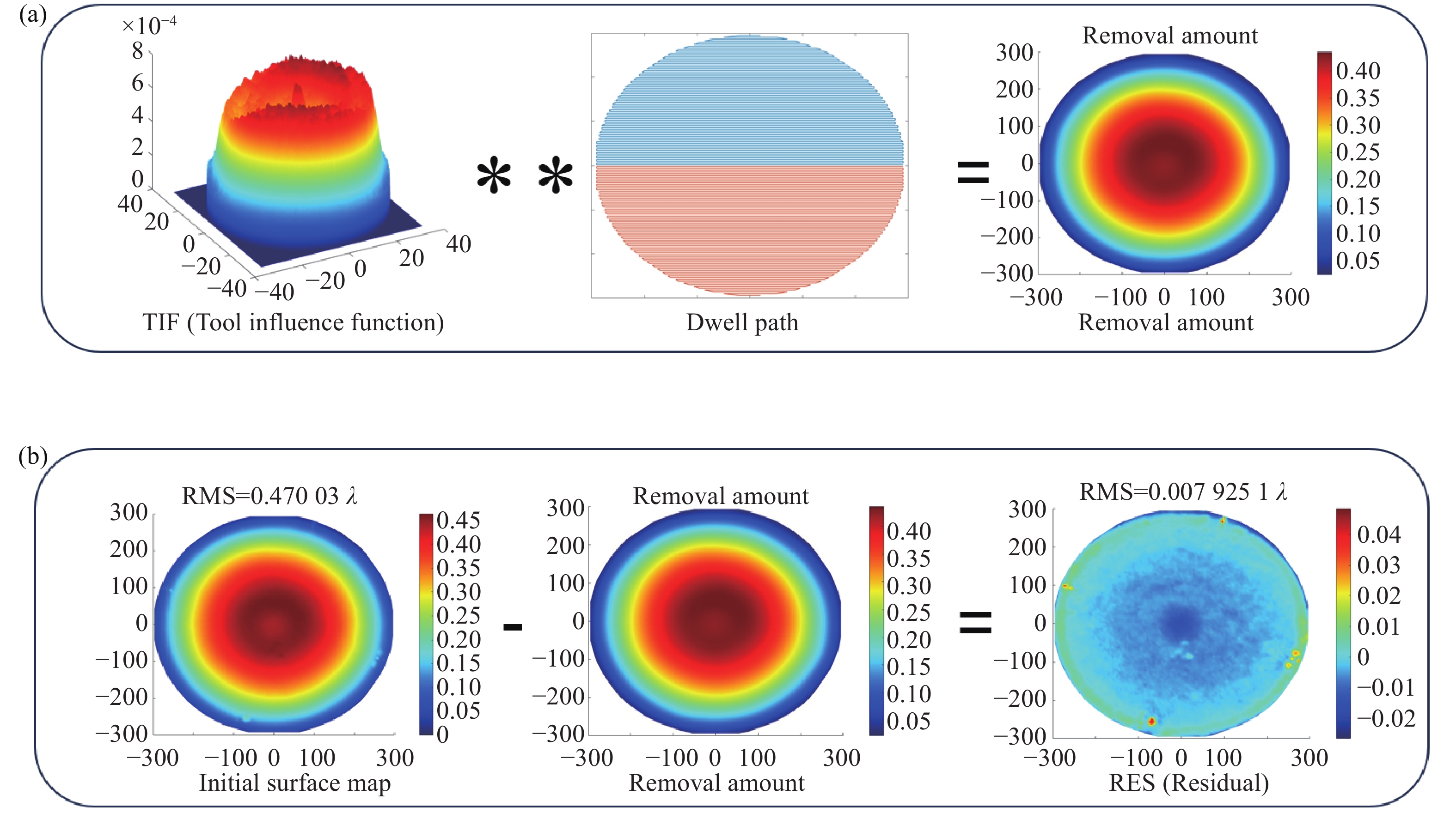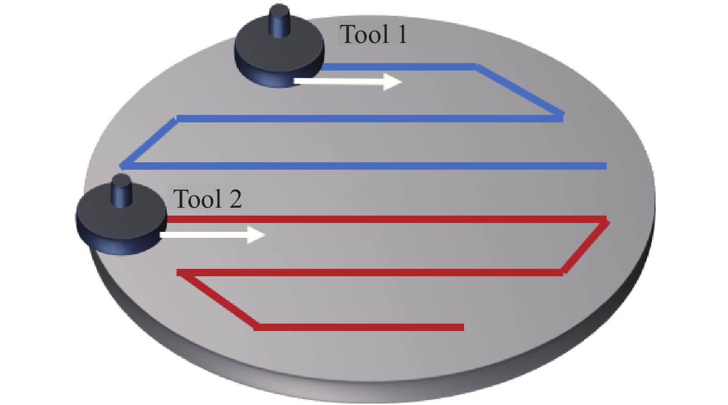To improve the processing efficiency of large-aperture optical components, a multi-robot, multi-tool collaborative processing method was proposed. A collaborative layout that has been tailored to the optical components was designed, and three feasible trajectories were simulated for analysis. The discrete simulation results were then used to establish principles for selecting trajectory parameters. To address the limitation of discrete simulation in capturing the influence of trajectory continuity on the surface map, an integral removal function model adapted to the motion mode was introduced. Furthermore, a collaborative machining obstacle avoidance strategy was developed. The experimental results obtained using the optimal trajectory demonstrated that for an optical component with an initial surface shape of PV=18.310