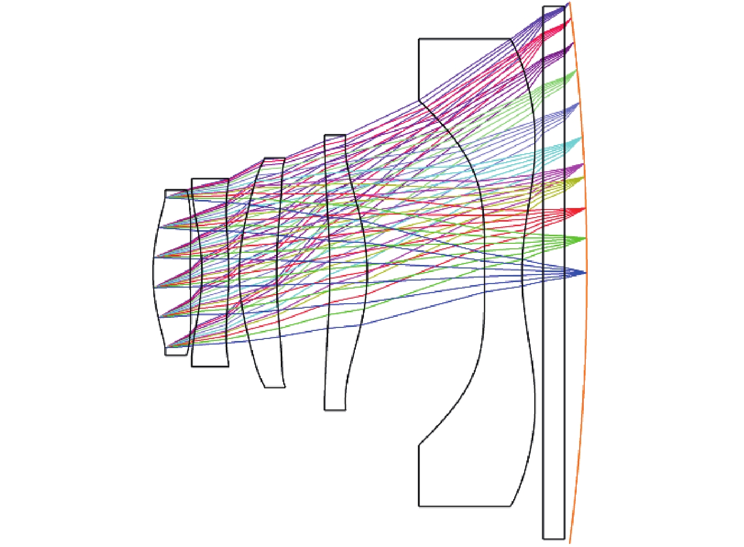 To address the demand for large field-of-view and high compactness in lightweight AR glasses equipped with cameras, this study proposes an optical design method incorporating a curved image plane. First, the curved image plane imaging system is theoretically analyzed according to Gaussian optics theory. The Petzval surface curvature characteristics of various optical configurations are derived, and the performance advantages of the curved image plane are highlighted through comparative simulations of dual systems. Then, a wide-field and compact optical system is designed using a segmented multi-objective optimization strategy. Finally, image quality evaluation and tolerance analysis are performed on the designed system. The compact optical system comprises five aspheric plastic lenses and a rear-mounted filter. It features a focal length of 3.1 mm, a field of view (FOV) up to 80°, and a total system length of only 4.07 mm. The design results show that the modulation transfer function (MTF) exceeds 0.32 across all fields. The maximum RMS spot radius is 2.41 μm, with a distortion of only 2.5%, and the relative illumination remains above 45% across the entire field at 223 lp/mm. This work lays a foundation for the application of curved sensors and offers a technical reference for the design of wide-field compact lenses.