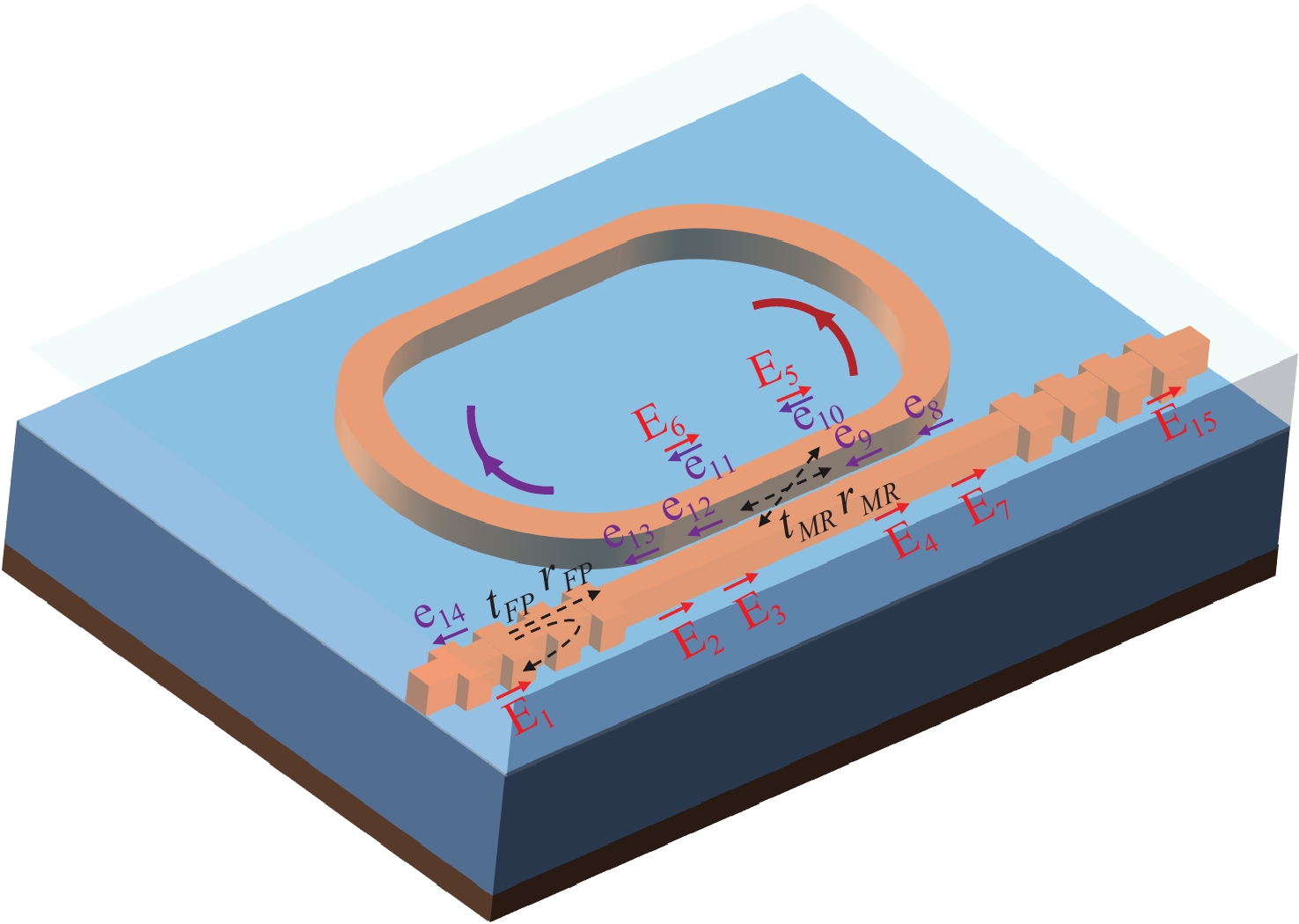 This paper presents comprehensive theoretical and experimental investigations on the transmission spectral characteristics of an integrated photonic structure consisting of a microring resonator coupled with a Fabry–Perot (FP) cavity. The FP cavity is realized by introducing a grating reflector into the straight waveguide of a single-side-coupled microring. Within this dual-resonator configuration, novel multi-cavity coupled transmission spectra are achieved. A systematic theoretical model is established to analyze the conditions under which these multi-cavity coupled spectral profiles appear, and the structural parameters are subsequently optimized. A grating-type Fabry–Perot–microring coupled resonator device was successfully fabricated on a silicon-on-insulator (SOI) platform. For the first time, multi-cavity coupled transmission spectra consistent with theoretical predictions were experimentally observed, including nested electromagnetically induced transparency (EIT)-like and double Fano resonance line shapes. Experimental measurements indicate that, under a waveguide loss of 3.43 dB/cm, the EIT central peak exhibits a quality factor of 1.40×104, while the slope of the double Fano resonance reaches 37.70 dB/nm. These results provide new insight into the underlying mechanisms of integrated photonic coupled resonator systems and demonstrate a viable approach toward highly integrated, high-performance photonic device platforms. The proposed structure shows strong potential for applications in high-sensitivity optical sensing, narrowband filtering, and high-speed modulation.