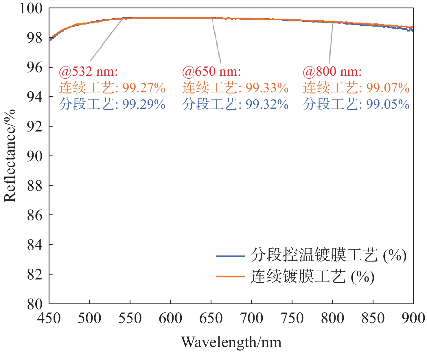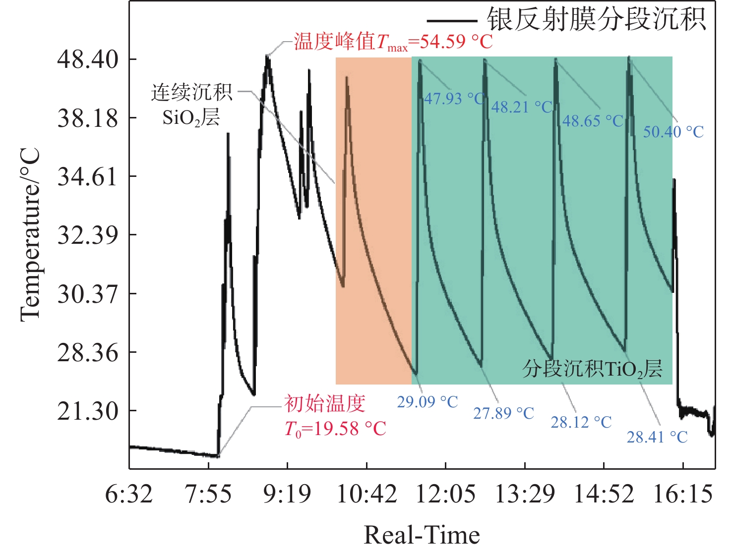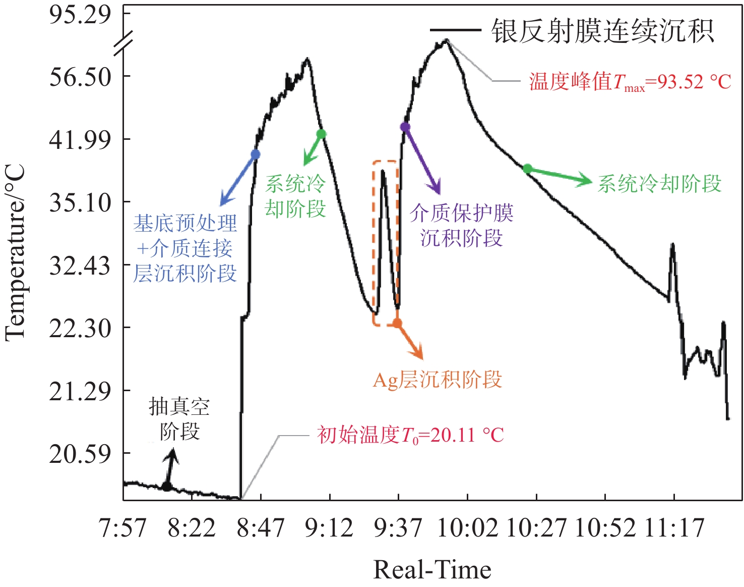 To address the challenge of temperature rise control during the coating process for thermally sensitive substrates (e.g., epoxy adhesive-bonded structural components), this paper proposes a low-temperature electron beam evaporation coating process. Through a dynamic thermal management strategy featuring segmented deposition-cooling cycles, the performance of this process in terms of the core properties (i.e., stress, adhesion, and optical performance) of metallic reflective films-with silver films as the research subject-was systematically investigated, and the deposition process was optimized by integrating the thermal failure threshold of the epoxy adhesive. Experimental results demonstrate that under strictly controlled substrate temperature conditions, this process not only significantly reduces the residual stress of the reflective film, but also ensures that the interfacial adhesion meets the strictest Class 03 severity level specified in the national standard (GB/T 26332.4-2015/ISO 9211-4:2012), the average reflectivity in the visible wavelength range is comparable to that of the traditional continuous coating process (>99%@450−900 nm), and the substrate temperature rise remains consistently below the critical threshold of the epoxy adhesive. Through the synergistic effect of Ion-Assisted Deposition (IAD) and dielectric encapsulation, the oxidation resistance and environmental durability of the silver film are significantly improved, satisfying the long-term service requirements of aerospace optical devices under extreme multi-physics field coupled environments. Further theoretical analysis reveals that the thermal relaxation mechanisms and structural regulation principles of this process exhibit cross-scenario applicability, providing an innovative solution for high-performance coating of low-temperature-sensitive substrates that balances aerospace reliability and industrial universality.