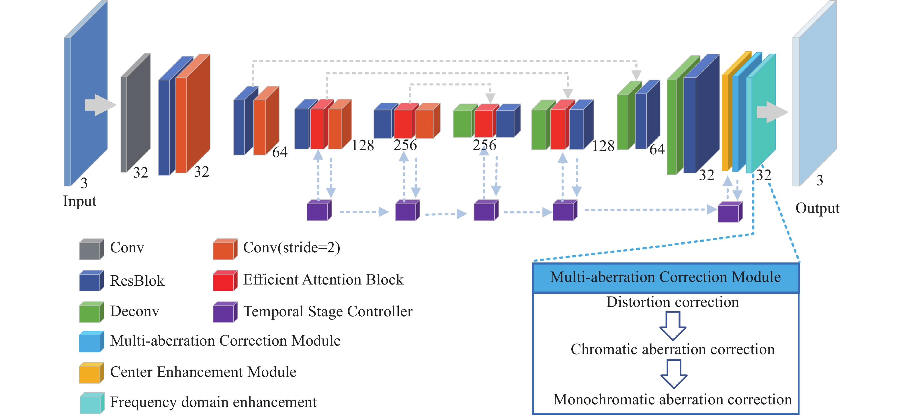 To address the issues of structural complexity and high cost in high-performance optical systems, this study proposes an optical system simplification and aberration correction method oriented toward computational correction. On the optical design side, a simplification design criterion based on aberration correctability analysis is constructed: priority is given to suppressing aberrations that are difficult for neural networks to compensate, while retaining portions amenable to computational correction, thereby simplifying the optical system structure while ensuring imaging quality. On the computational processing side, a multi-module progressive collaborative correction network is designed, comprising four modules: distortion correction, chromatic aberration compensation, monochromatic aberration correction based on physically-constrained Point Spread Function, and frequency-domain enhancement. This network is driven by a Temporal Stage Controller (TSC), which utilizes its dynamic weight scheduling mechanism for progressive stage-wise processing, effectively suppressing the mutual interference between different aberration types. Experimental results demonstrate that images from a simplified dual-lens system corrected by this network achieve a Peak Signal-to-Noise Ratio (PSNR) of 31.47 dB and Structural Similarity (SSIM) of 0.95, with imaging quality comparable to conventional six-lens double-Gauss systems, while significantly reducing optical system complexity. Ablation studies validate the effectiveness of the TSC and multi-module correction architecture. This research provides a novel technical pathway for achieving high-quality imaging with simplified optical systems.