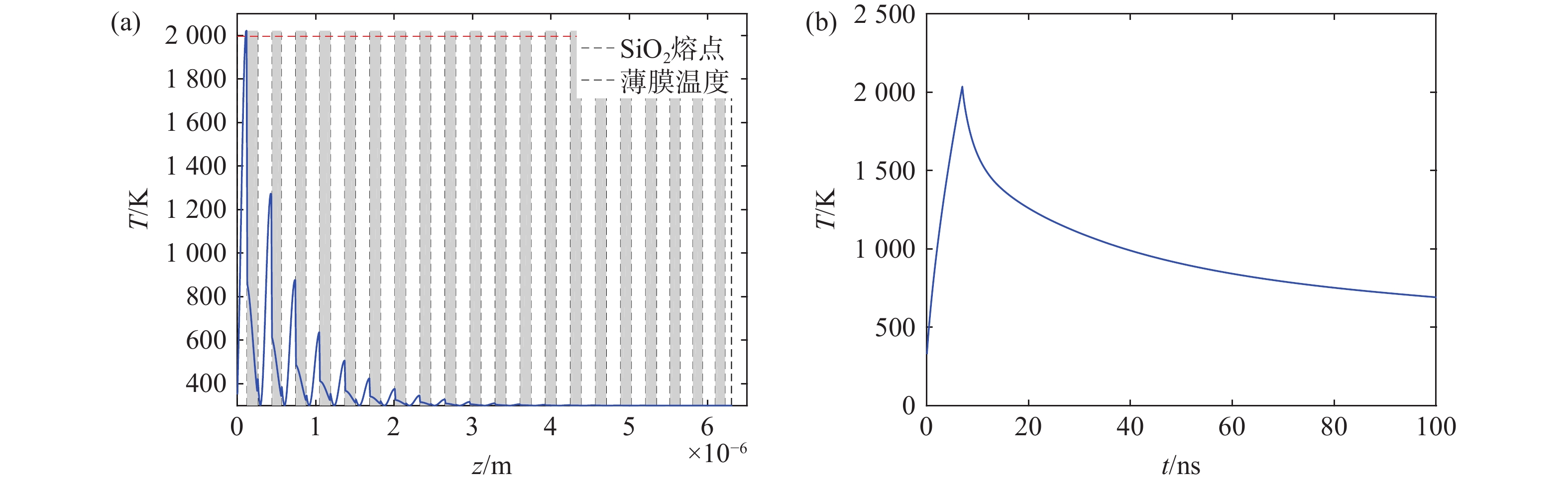 Taking the HfO2/SiO2 multilayer dielectric film structure as an example, and based on the laser-induced ionization/electron multiplication process, the Drude model is introduced into the optical field calculation, extending the film layer refractive index from a static constant to a dynamic complex refractive index driven by the free electron density. Based on this, a thermal conduction (and thermal stress) model is coupled to calculate the evolution of thermal effects inside the thin film under nanosecond pulsed laser irradiation, and the corresponding damage threshold is determined to be 13.65 J/cm2, and the damage characteristics of the film are studied experimentally.
