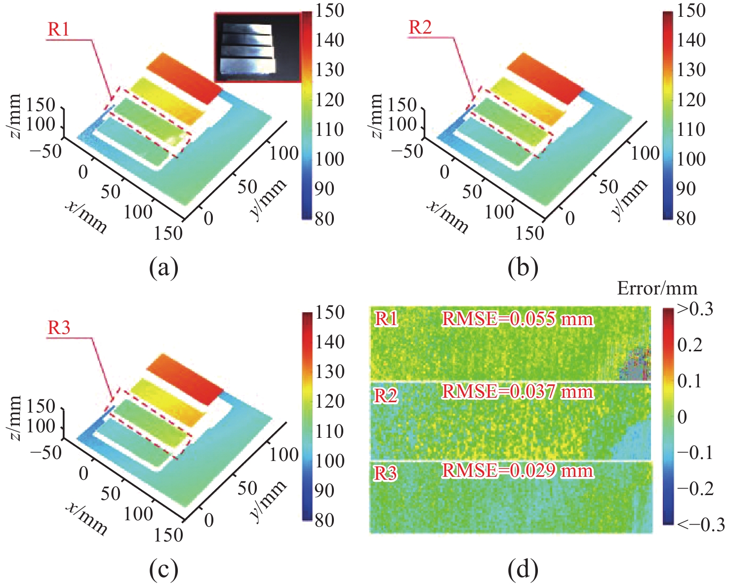 在结构光三维测量系统中,相机离焦现象不可避免。在离焦的影响下,物体表面的复杂纹理会引入显著的相位误差,影响测量精度。本文针对该问题,分析并构建了该相位误差的理论模型,指出了其与纹理变化方向的关系,并由此提出了一种基于双向条纹点云匹配的复杂纹理误差校正方法。理论上,通过投影横纵条纹图案获得的双向相位信息应解出完全一致的点云。基于这一原理,本文提出以最小化横纵点云对应点距离为目标,修正每个点对应的相位,最终得到校正后的点云。为了消除标定参数误差导致的点云整体偏移,本文通过点云匹配进行了预校正。对比实验结果表明:相较传统方法,本文方法的平均绝对误差(MAE)和均方根误差(RMSE)最高可分别降低33.6%和39.1%。本文方法能够以更高的精度重建具有复杂纹理的物体。
