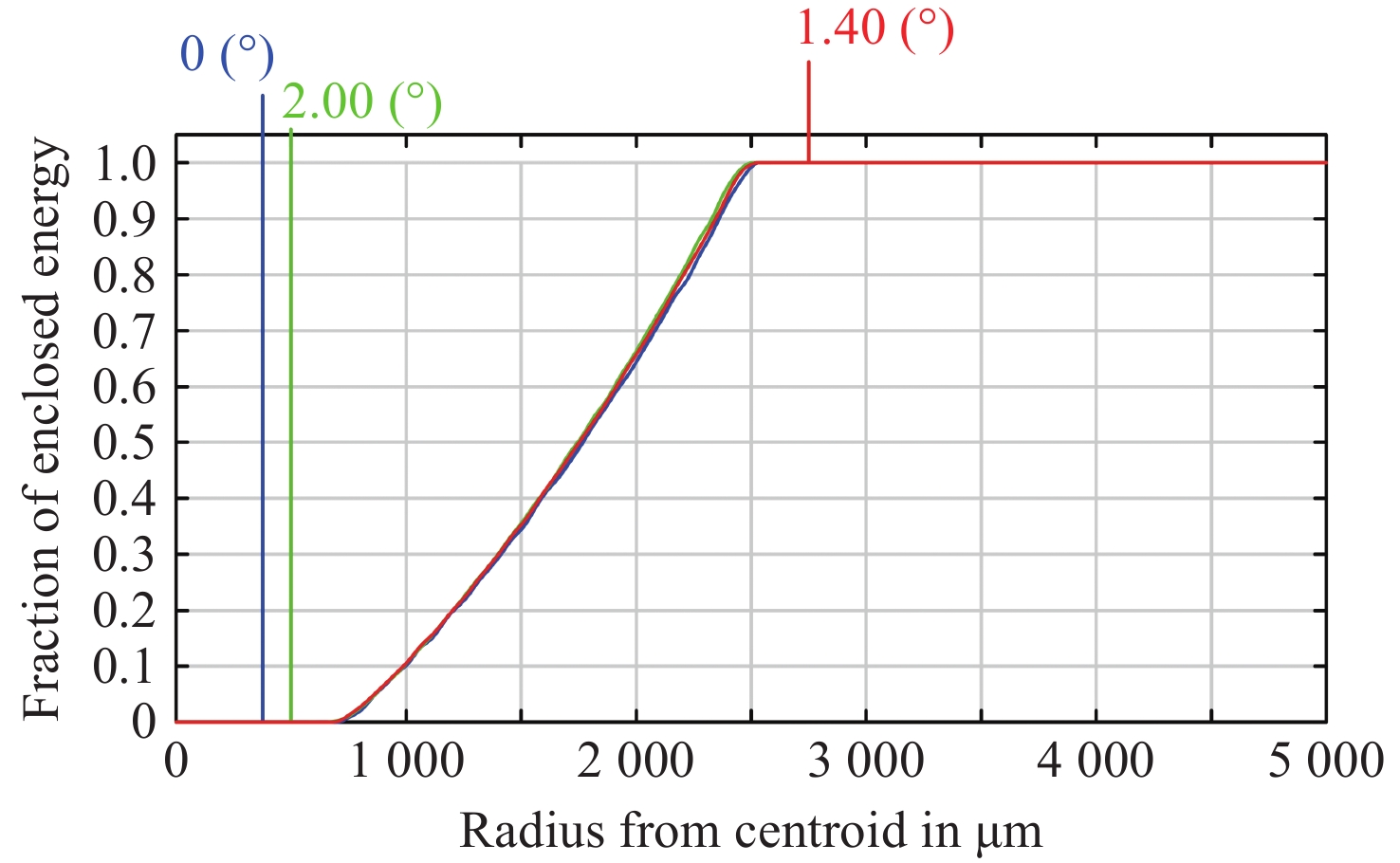 为降低激光制导导引头的失调角误差,需要在光学设计方面优化能量信号质量。本文基于像差理论结合光学设计软件的计算功能获得设计起点,分别从光学结构形式和像差平衡优化角度入手对光学系统进行逐步迭代设计。通过控制像方远心,增强光斑的对称性以提高测角精度;通过对光学塑料材料的性能分析,论证了采用光学塑料制造导引头光学结构的可行性。最终完成焦距为71.6 mm,F/#为1的光学系统设计,边缘视场主光线远心度小于6 mrad。在工作温度范围内,光斑尺寸的稳定性优于0.4%;全视场最大畸变小于0.5%,在±2°视场范围内的光斑线性度与能量响应一致性均能满足精确制导要求。基于最小初阶像差的结构设计思路可以用于折反系统的优化,该方法可为同类导引头光学结构设计提供借鉴。