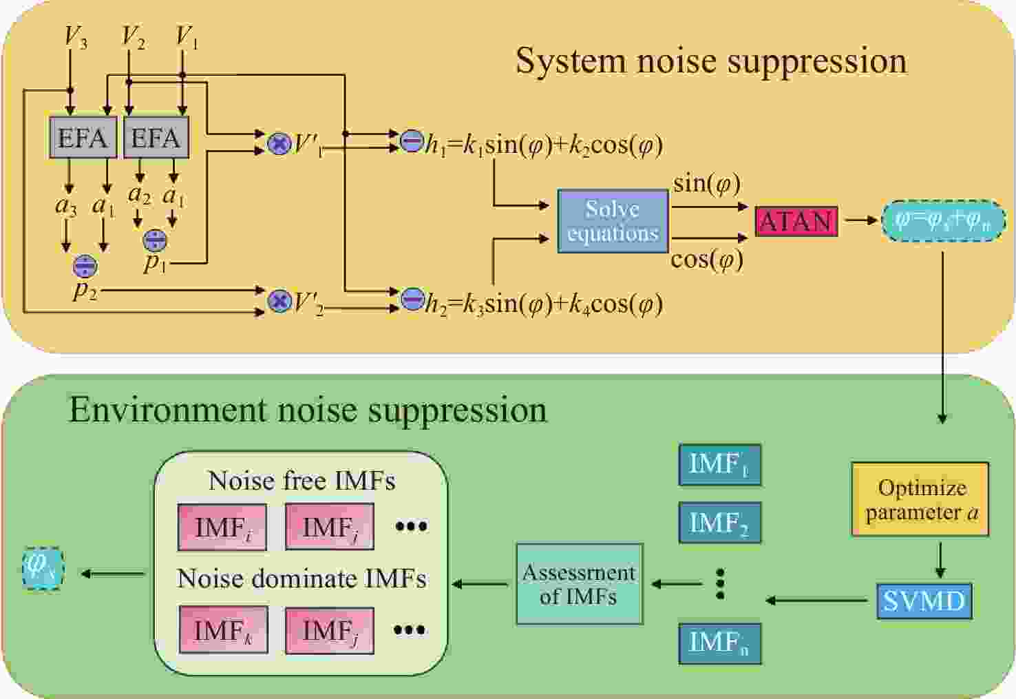 Abstract:Noise interference critically impairs the stability and data accuracy of sensing systems. However, current suppression strategies fail to concurrently mitigate intrinsic system noise and extrinsic environmental noise. This study introduces a composite denoising approach to address this challenge. This method is based on the ameliorated ellipse fitting algorithm (AEFA) and adaptive successive variational mode decomposition (ASVMD). This algorithm employs AEFA to eliminate system noise tightly coupled with direct-current and alternating-current components in the interference signal, thereby obtaining a phase signal containing only environmental noise. The ASVMD technique adaptively extracts environmental noise components predominantly present in the phase signal. To achieve optimal decomposition results automatically, the permutation entropy criterion is employed to refine decomposition parameters. The correlation coefficient is utilized to differentiate effective components from noise components in the decomposition results. Experimental results indicate that the combined AEFA and ASVMD algorithm effectively suppresses both system and environmental noises. When applied to 50 Hz vibration signal processing, the proposed approach achieves a noise reduction of 17.81 dB and a phase resolution of 35.14 μrad/√Hz. Given the excellent performance of the noise suppression, the proposed approach holds great application potential in high-performance interferometric sensing systems.