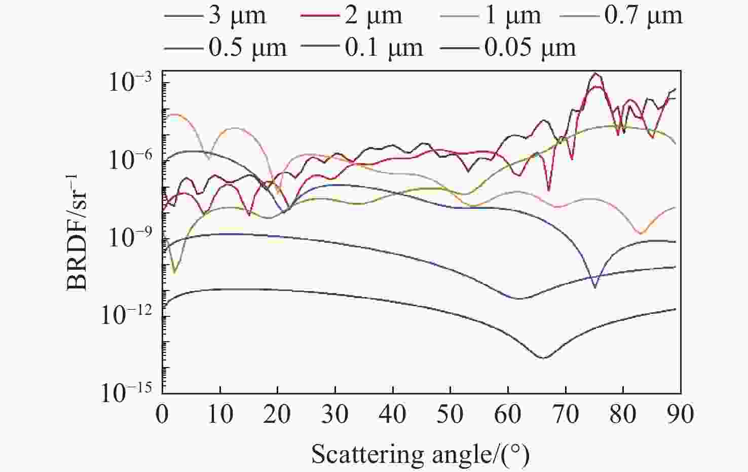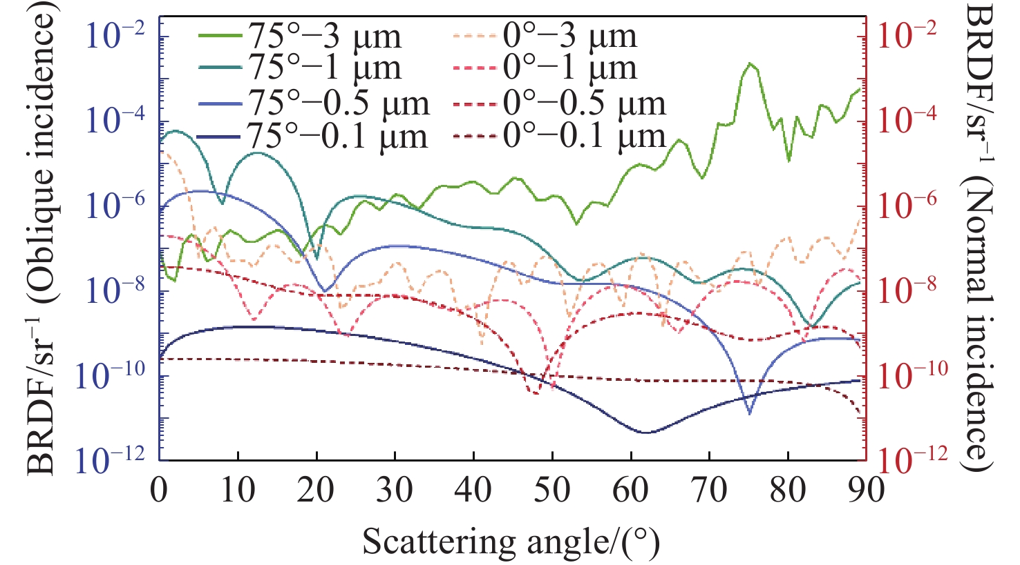 Figure 5. The energy distributions of microdefects at each scattering angle under normal and oblique incidences. The lines show the BRDF of PSL particles with radii of 3 μm, 1 μm, 0.5 μm, and 0.1 μm at different scattering angles within the reflective surface. Blue and green solid lines are the BRDF under 75° oblique incidence, and red dashed lines are the BRDF under normal incidence
