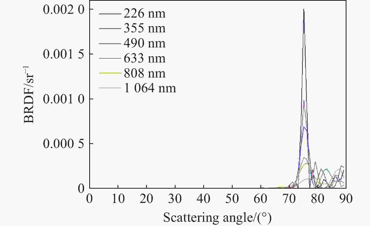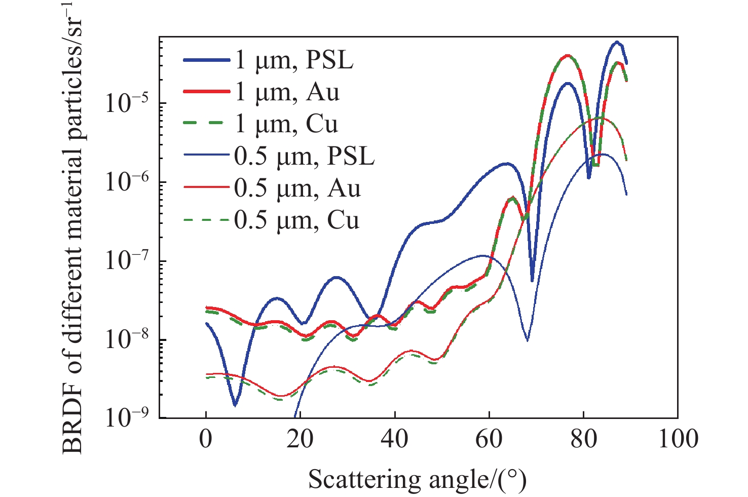 图 5 在正入射及斜入射时,微缺陷各散射角的能量分布。蓝色绿色实线和红色虚线分别为75°斜入射和正入射时反射面内不同散射角下半径分别为3 μm、1 μm、0.5 μm、0.1 μm PSL颗粒BRDF