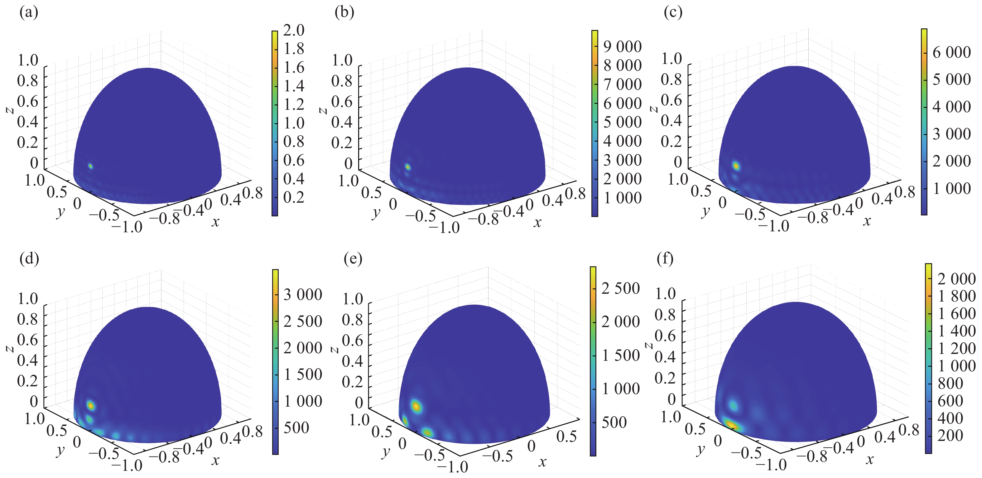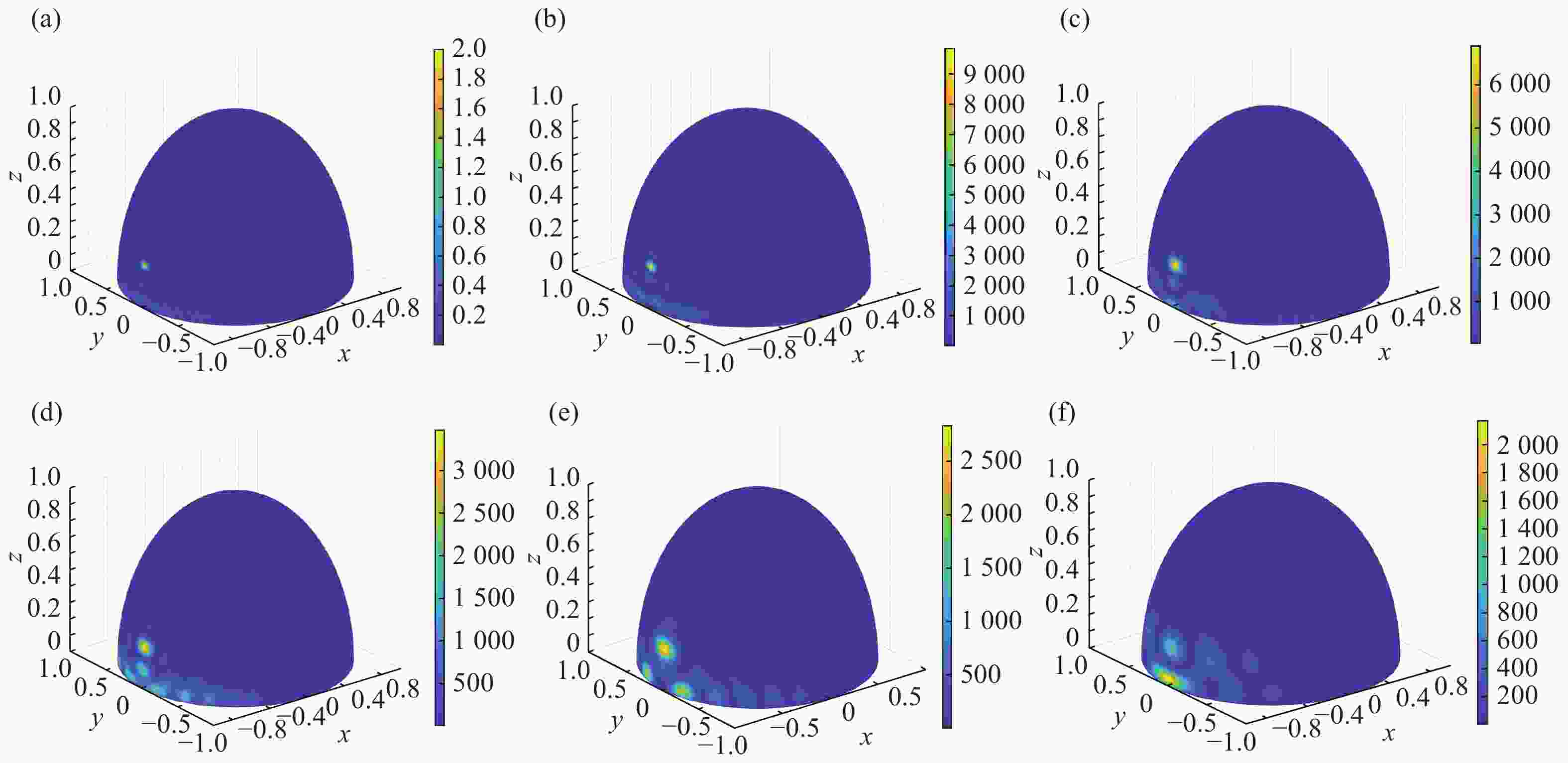 图 4 不同入射角度下的散射场空间分布。(a)和(b)为0.1 μm PSL颗粒在75°斜入射和正入射下的空间分布,(c)和(d)为1 μm PSL颗粒在75°斜入射和正入射下的空间分布