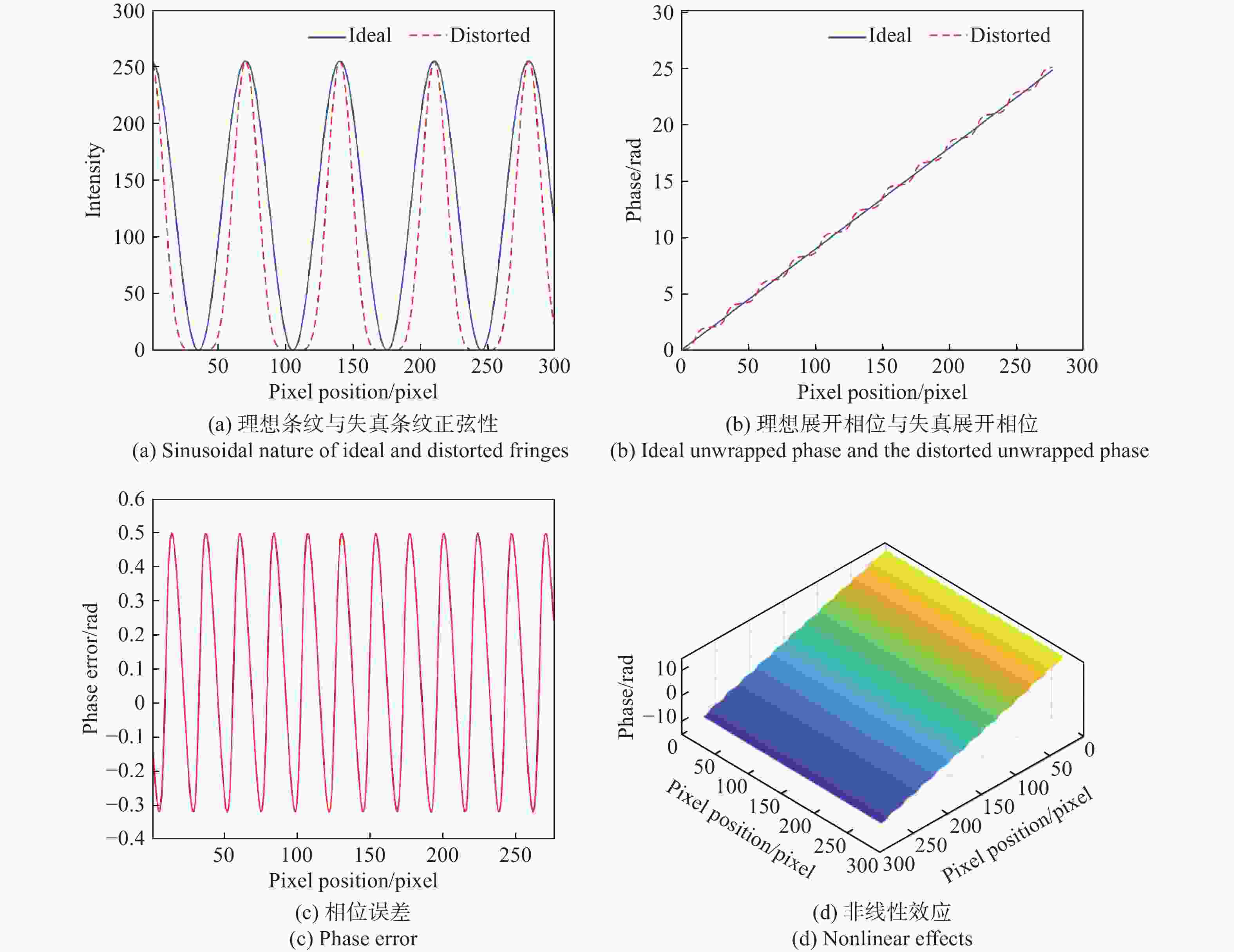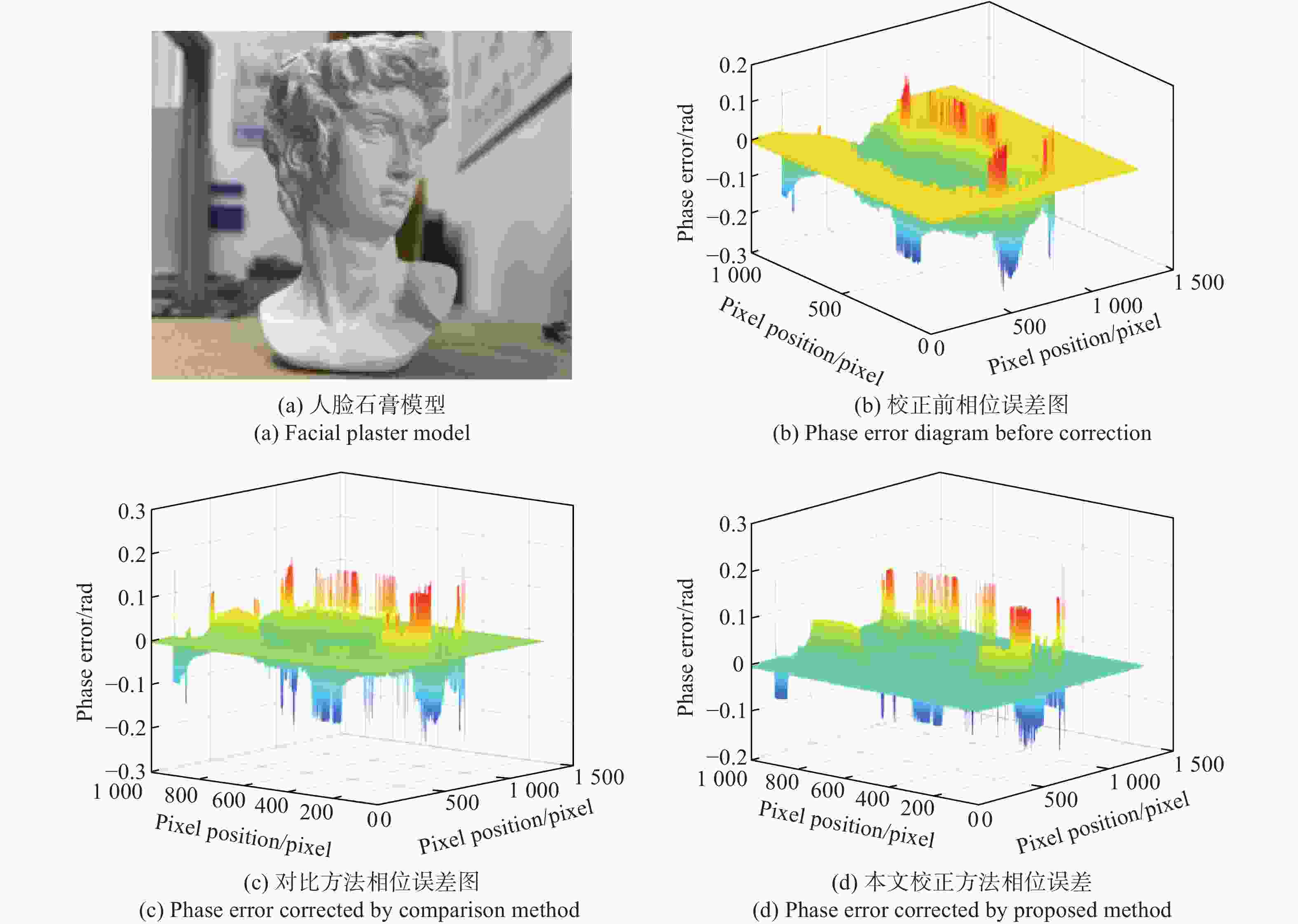 0.0706 rad降至0.0168 rad,最大相位误差由0.4129 rad降至0.0960 rad。在人脸石膏模型实验中,校正后的标准相位误差由0.0472 rad降至0.0102 rad,最大相位误差由0.2990 rad降至0.2408 rad。在复杂形貌人脸石膏件的三维重建中,校正后表面质量得到显著提升,影响相位质量的水波纹效应大幅减小。与现有的大步相移方法相比,本文提出的方法不仅具有较高的相位获取精度,而且在所需数据量和操作便捷性方面也具有明显优势,显示出广泛的应用前景。Abstract:Stripe projection technology is widely used in 3D measurement and surface morphology reconstruction, where phase quality is a critical determinant of measurement accuracy. However, the nonlinear relationship between input and output light intensity is a major source of phase error. To address this issue, this paper introduces a novel system nonlinear active correction method. This method captures the variation pattern between input and output light intensity by projecting a small number of uniform gray-scale images onto a standard plane. This pattern is then integrated with active system nonlinear correction to construct a system nonlinear model based on the input-output light intensity variation. Genetic algorithms are used to optimize the coding values, which are then used to actively correct the projected fringes via fringe coding. The corrected fringes effectively reduce the influence of nonlinear effects, thereby significantly improving the quality of phase acquisition. To validate the proposed method, computer simulations were performed using three-step phase shifting. The results showed an 88% reduction in the standard error and an 85.5% reduction in the maximum error. In actual standard plane experiments, the corrected standard phase error decreased from