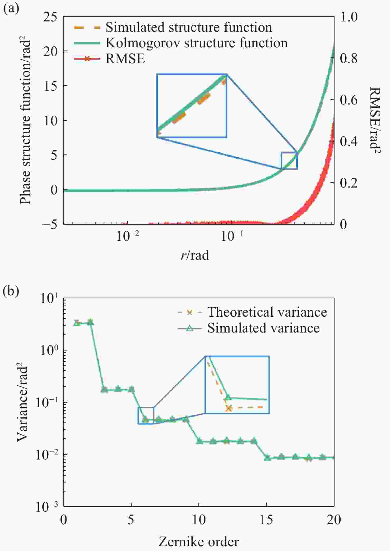 图 3 仿真湍流屏精确度验证。(a)湍流相位屏平均结构函数与理论期望值(左)以及两者RMSE (右);(b)前20阶Zernike系数方差统计分布的时域统计值与理论值