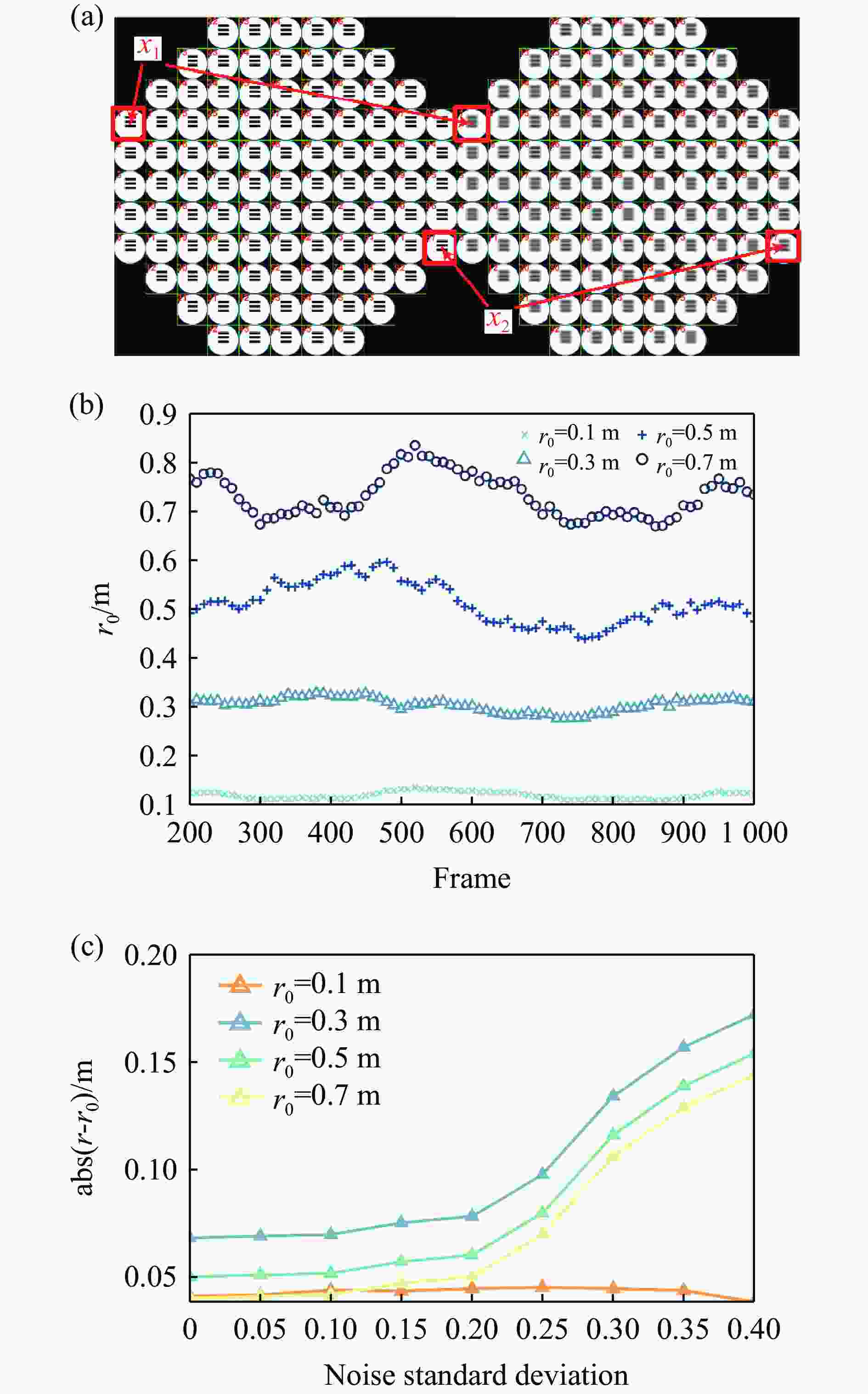 图 5 相干长度仿真结果。(a)加入湍流前后的SHWFS子孔径阵列图像(x1和x2为用于计算的子孔径);(b)不同湍流条件下,每200帧波前结构函数测得的r0曲线;(c)加入不同标准差的高斯噪声后的r0曲线