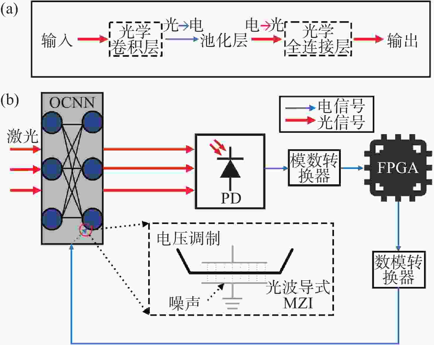 • 图 1  (a) OCNN架构示意图及(b) OCNN的片上训练实施图