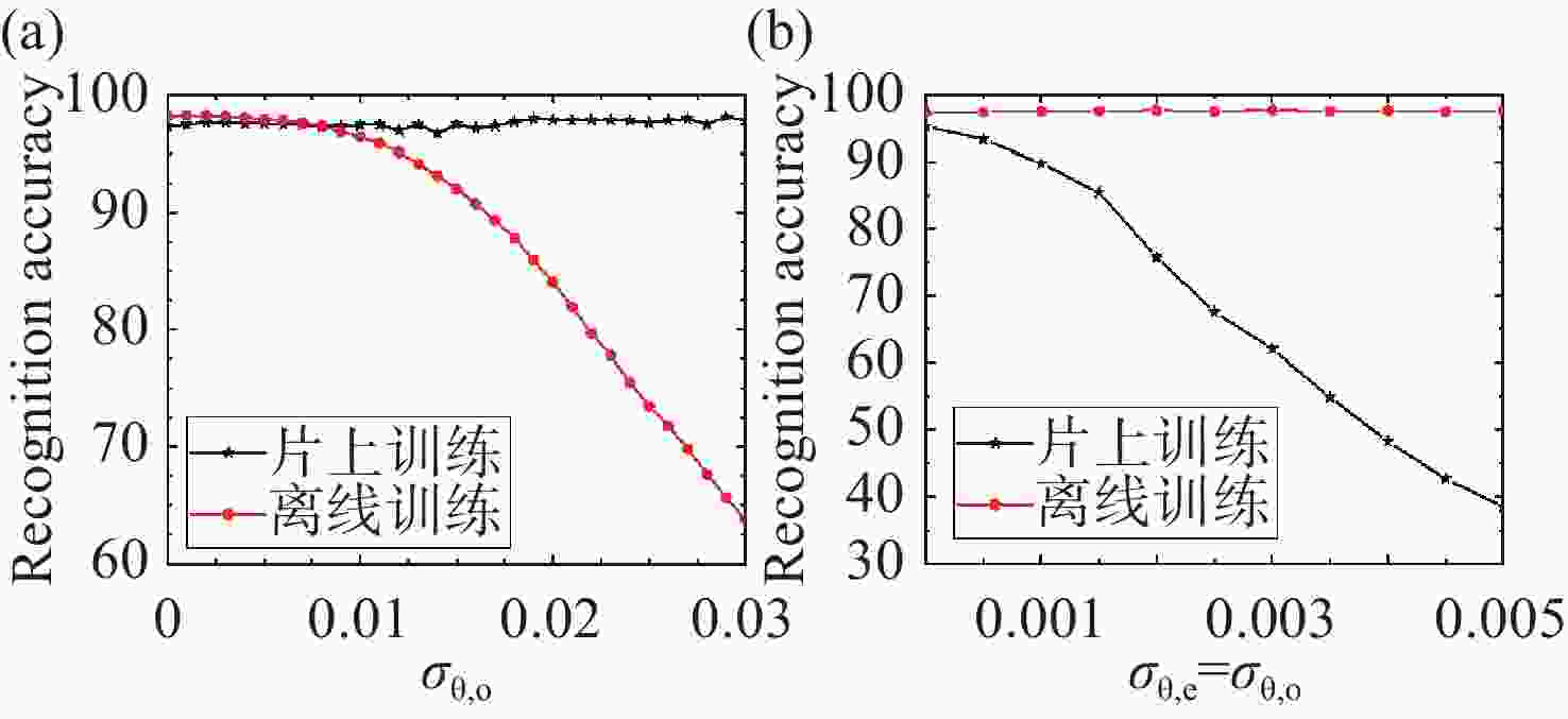 Figure 3.  (a) Recognition accuracy of OCNN offline and on-chip training, with fabrication error only; (b) recognition accuracy of OCNN offline and on-chip training, with both fabrication error and circuit noise