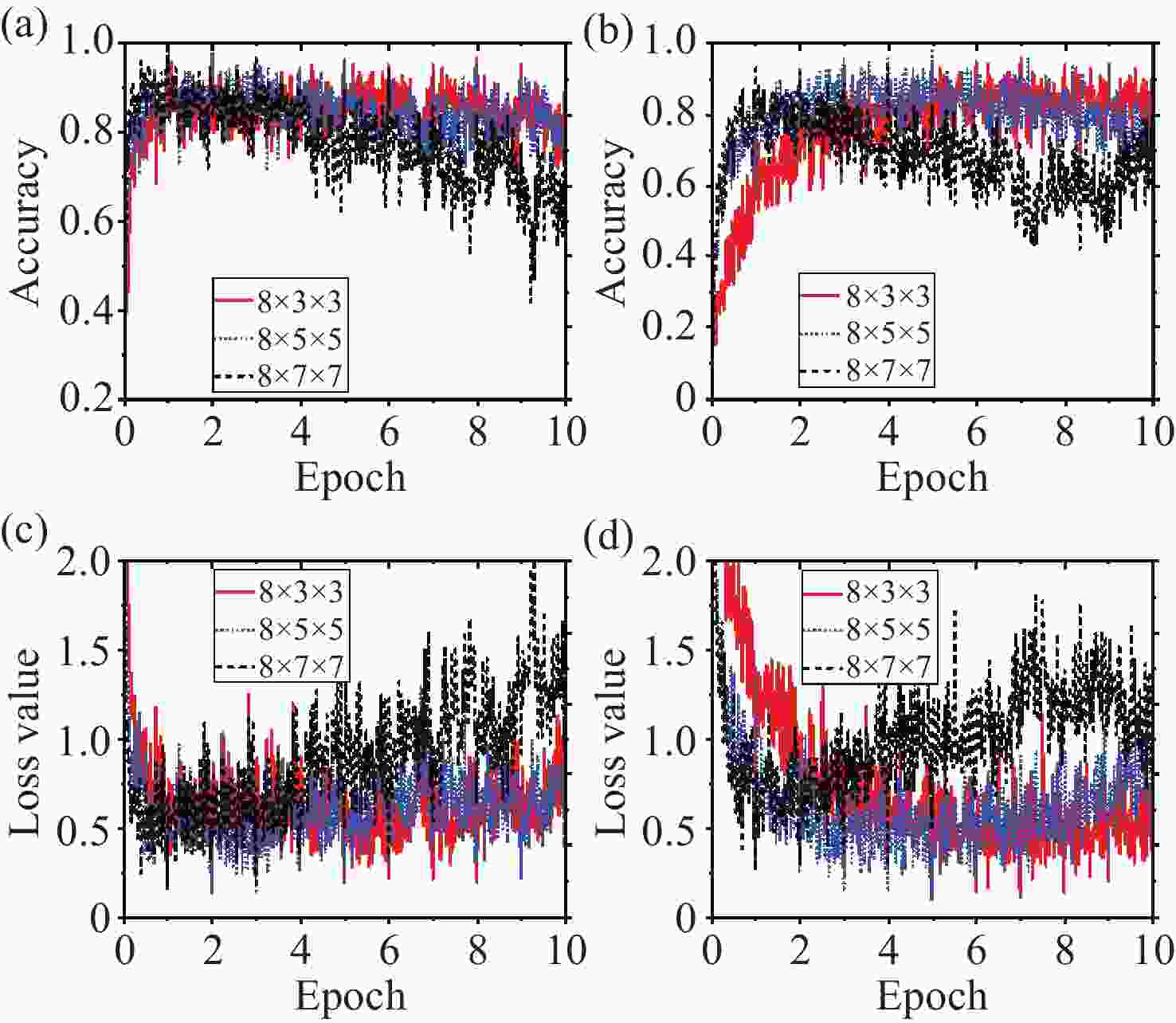 Figure 4.  When the circuit noise σθ,e =0.003, (a) and (b) the recognition accuracies of OCNN under average pooling and maximum pooling methods with different pooling sizes; (c) and (d) the corresponding loss values