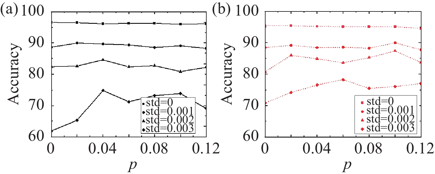 图 7  (a)平均池化和(b)最大池化方式下OCNN在不同Dropout概率p时的识别精确度,其中电路噪声标准差分别为0、0.001、0.002、0.003