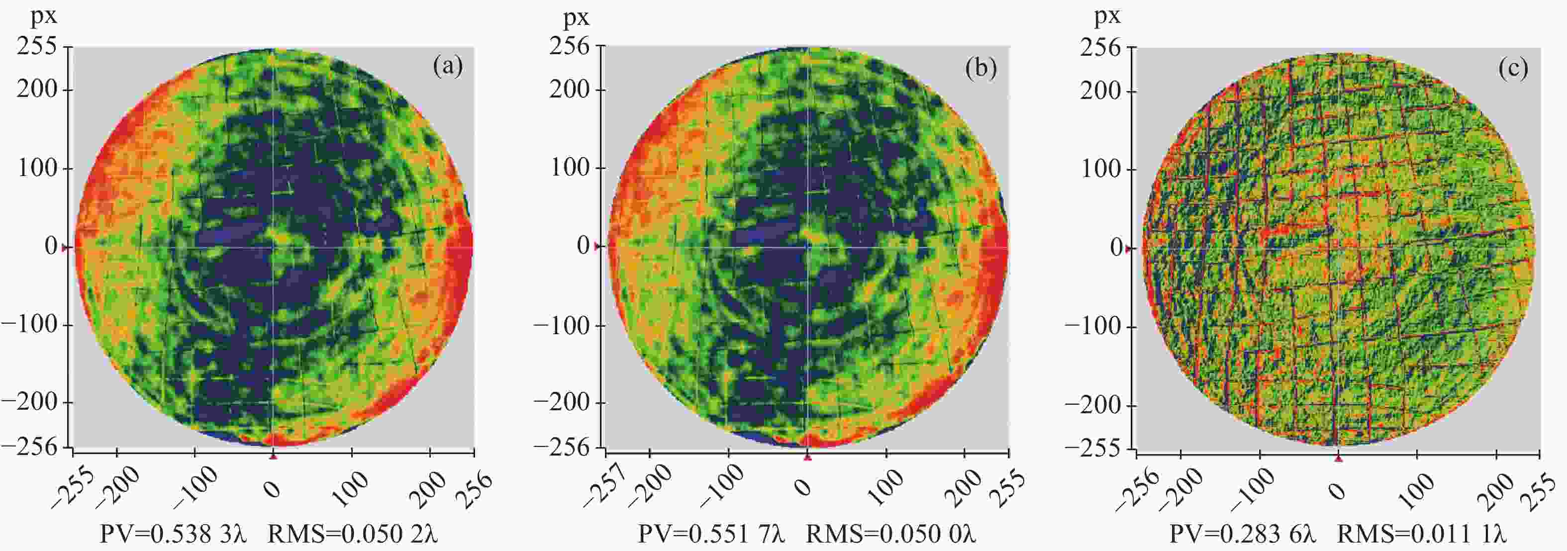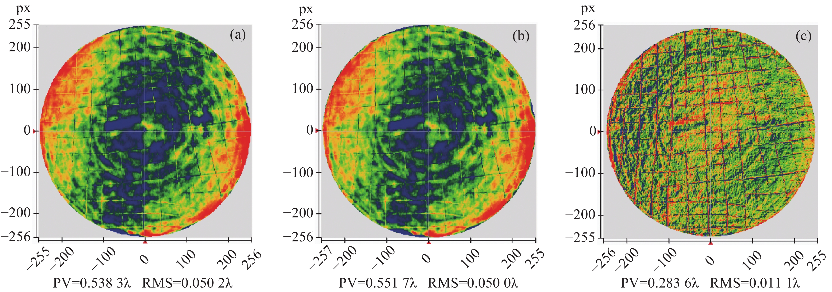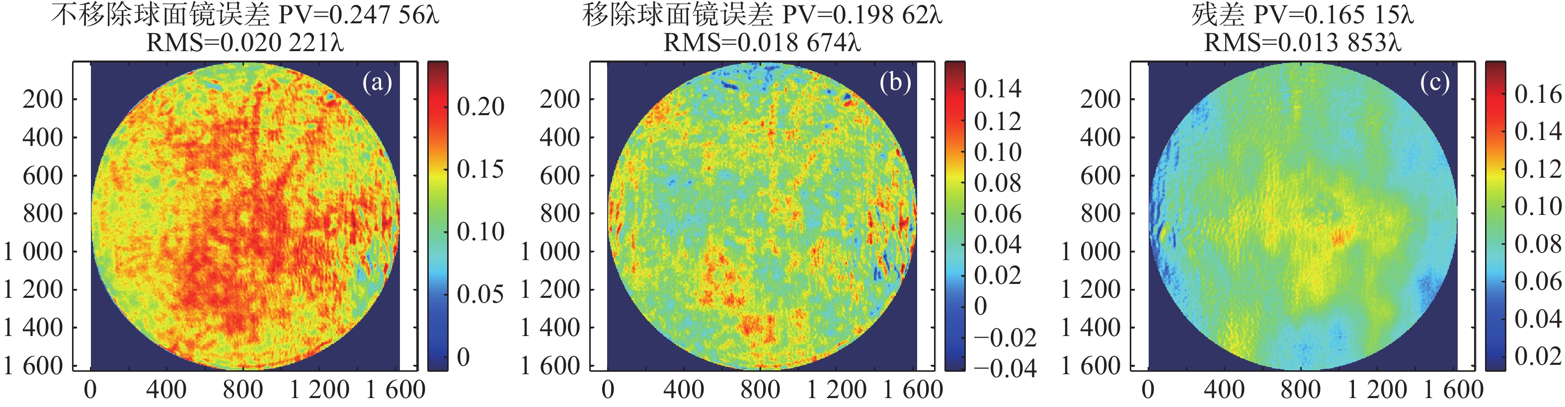 图 11 去除球面镜面形误差前后的数据处理结果对比。(a)未移除球面镜误差面形;(b) 移除球面镜误差后面形;(c)去除球面镜面形误差前后残差