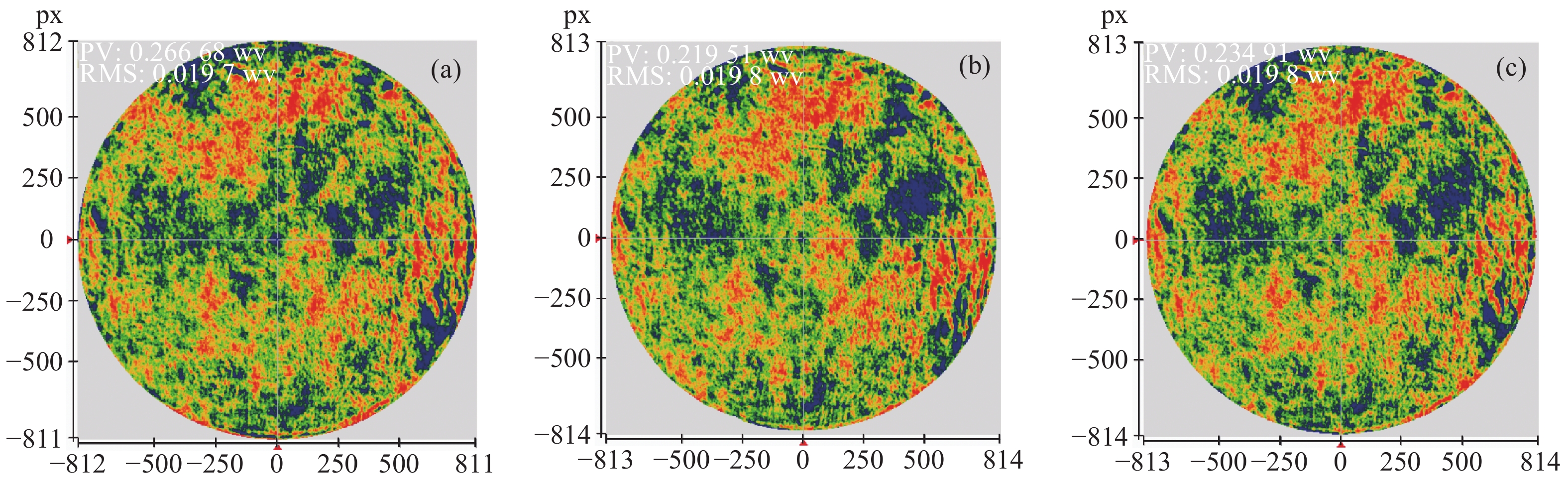 unit: λ θ1 = 41° θ2 = 45° Calculation results Residual error (1) PV= 0.2036 RMS=0.0229 PV= 0.3406 RMS=0.0259 PV= 0.4060 RMS=0.0159 PV= 0.0986 RMS=0.0067 (2) PV= 0.1878 RMS=0.0205 PV= 0.3429 RMS=0.0265 PV= 0.4700 RMS=0.0158 PV= 0.0979 RMS=0.0066 (3) PV= 0.2037 RMS=0.0201 PV= 0.3220 RMS=0.0257 PV= 0.4460 RMS=0.0160 PV= 0.0986 RMS=0.0067 表 2 平面镜面形检测结果