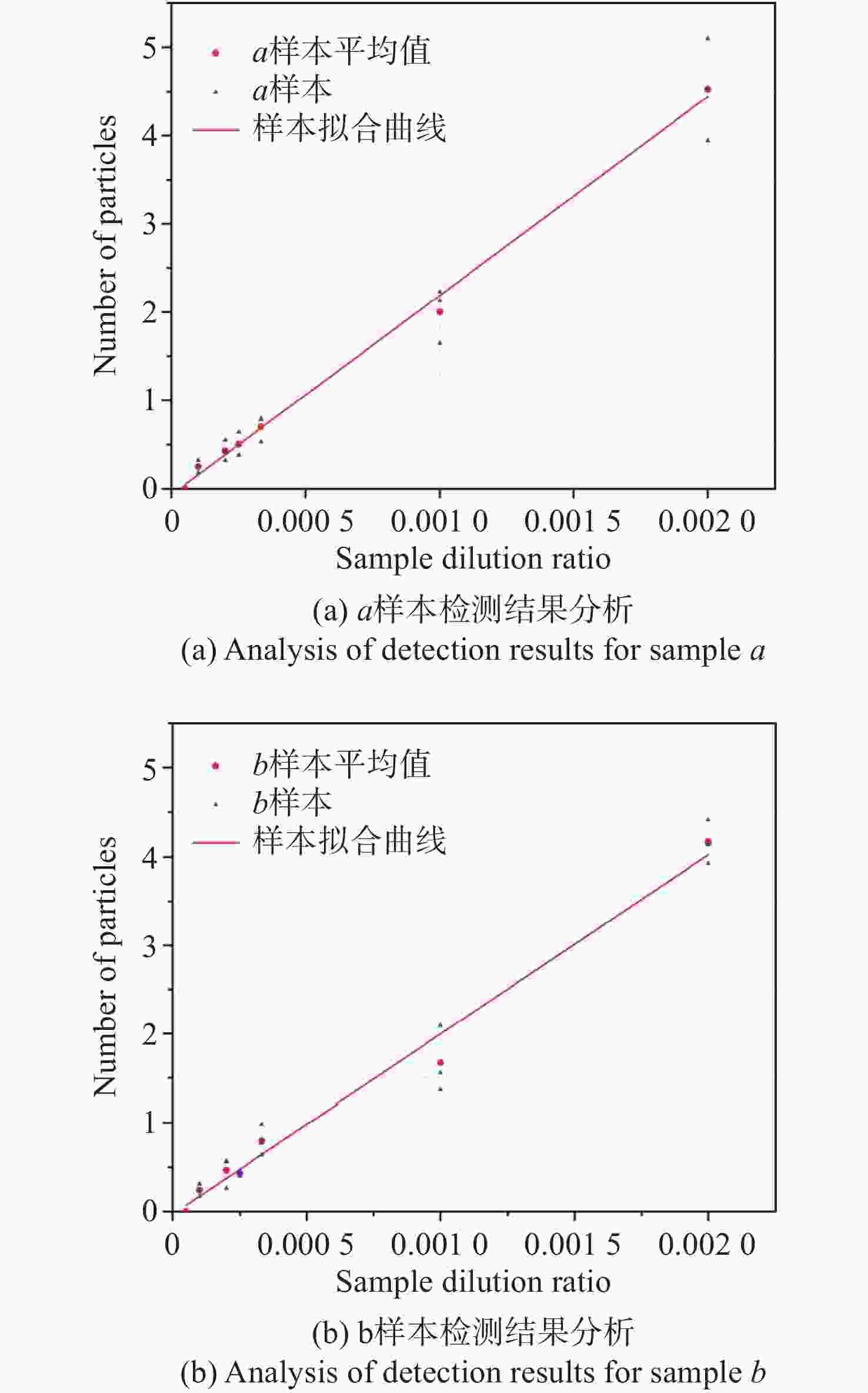 稀释倍率 a1 a2 a3 平均值 1∶500 4.54 3.94 5.1 4.53 1∶ 1000 2.23 2.13 1.65 2 1∶ 3000 0.53 0.79 0.78 0.7 1∶ 4000 0.64 0.49 0.38 0.5 1∶ 5000 0.55 0.32 0.42 0.43 1∶ 10000 0.32 0.25 0.18 0.25 1∶ 50000 0.01 0.01 0 0.01 表 2 b样本荧光粒子检测结果