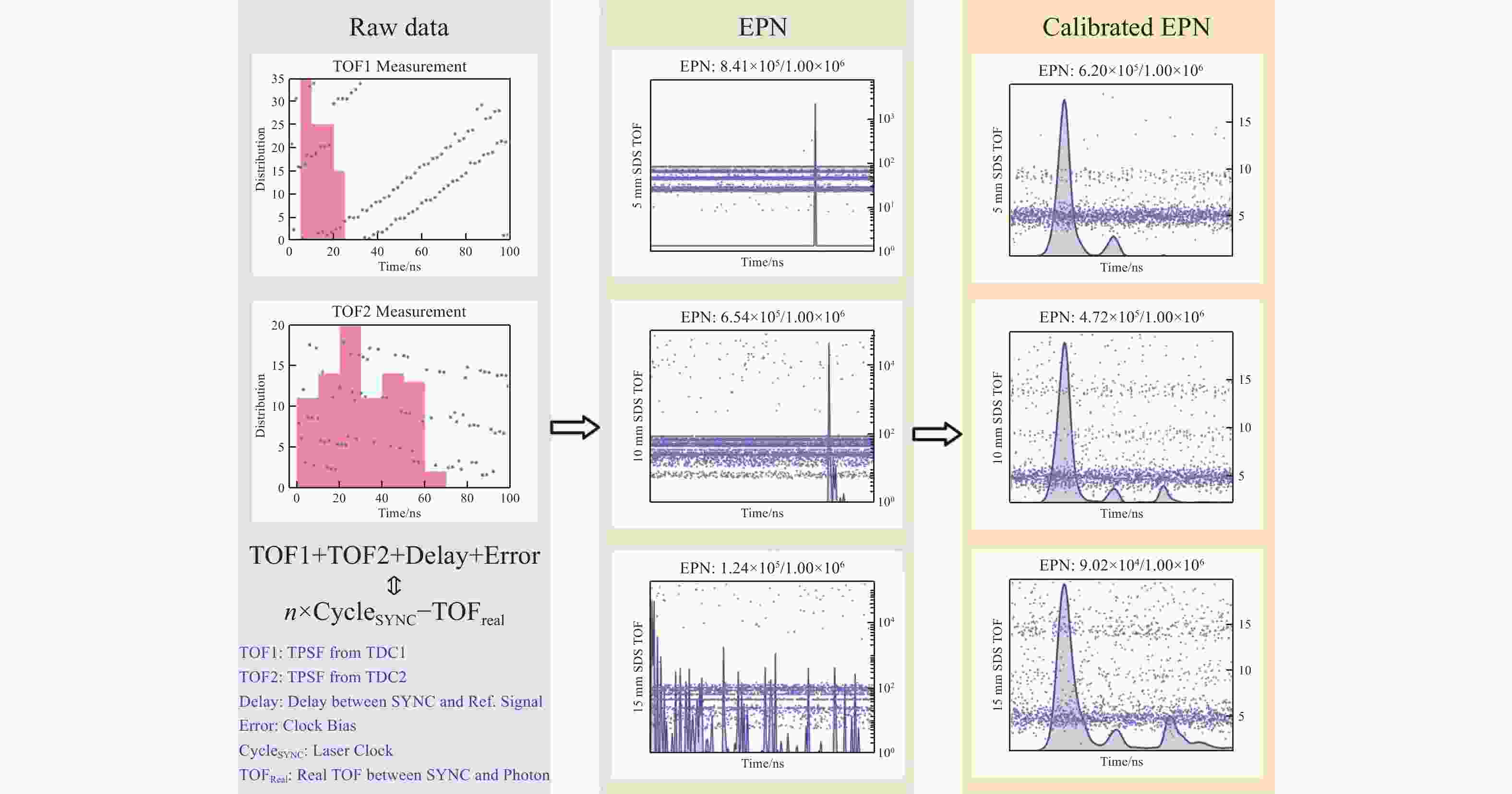 时域扩散光学成像(time domain diffuse optical imaging, TD-DOI)作为一种先进的组织光学成像技术,通过时间相关单光子计数(time-correlated single photon counting, TCSPC)系统可实现生物组织吸收系数与散射系数的定量重建,从而精确评估组织氧代谢、血流灌注等关键生理参数。然而,受限于TCSPC系统固有的硬件复杂性、高成本特性,目前难以实现临床场景下在体多通道动态监测的规模化应用。本文发展了一种双通道差分混合触发参考信号策略,通过结合差分时间数字转换(time-to-digital converter, TDC)器件和光子计数技术,构建稳定可靠的时间扩展曲线(time point spread function, TPSF)测量体系,实现了激光同步信号与出射光子信号时间延迟的亚纳秒级精确标定。实验验证数据显示,所发展系统时间分辨率为55 ps,在2.3×104 光子/s计数率下,TPSF波动系数可稳定控制在1.35%以内(积分时间1 s)。针对组织仿体的光学参数反演测试表明,组织光学参数反演精度方面,吸收系数与约化散射系数的平均反演误差分别在5.39%和4.34%以内。该技术方案显著提升了TD-DOI多通道并行检测可行性,特别适用于脑皮层血氧饱和度动态监测等生物医学场景,为开发新一代穿戴式光学脑功能成像设备奠定了技术基础。