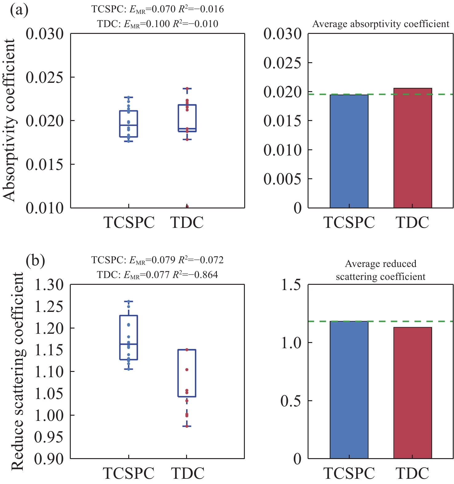 图 8 光学参数反演精度对比测试结果。(a)TCSPC(积分时间为 10 s)TDC 系统(积分时间为 20 s)和吸收系数反演结果稳定性及准确性;(b)TCSPC(积分时间为 10 s)TDC 系统(积分时间为 20 s)和散射系数反演结果稳定性及准确性